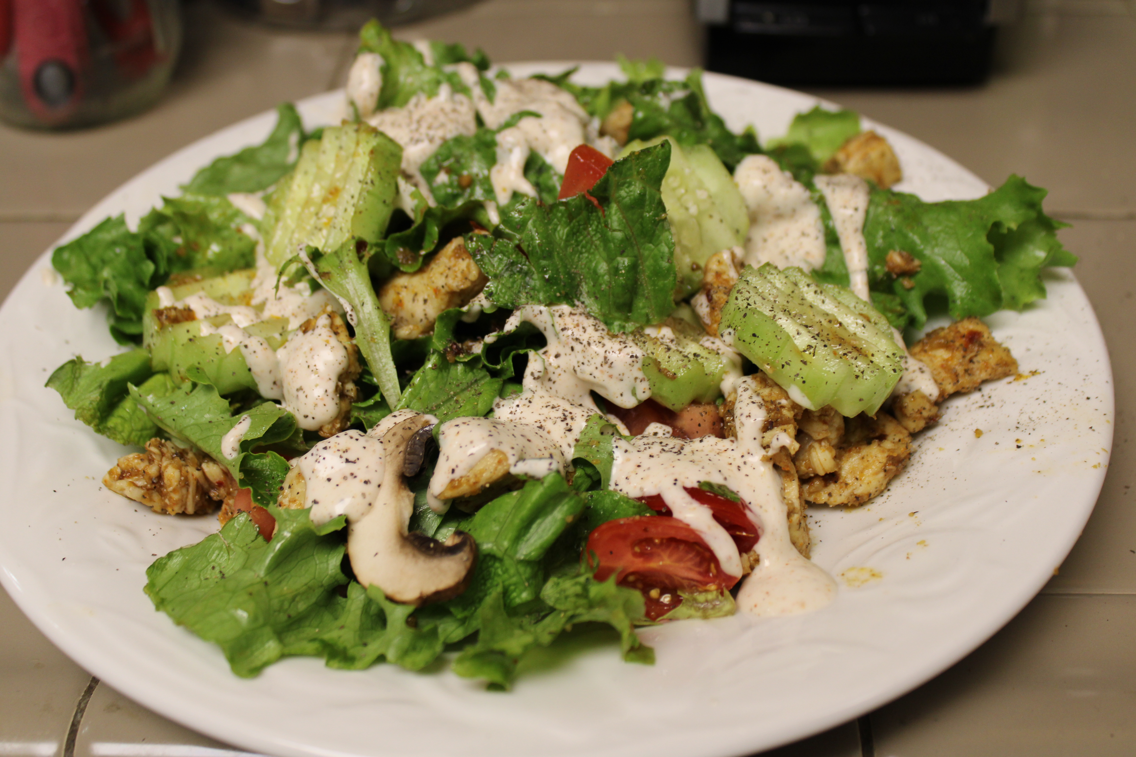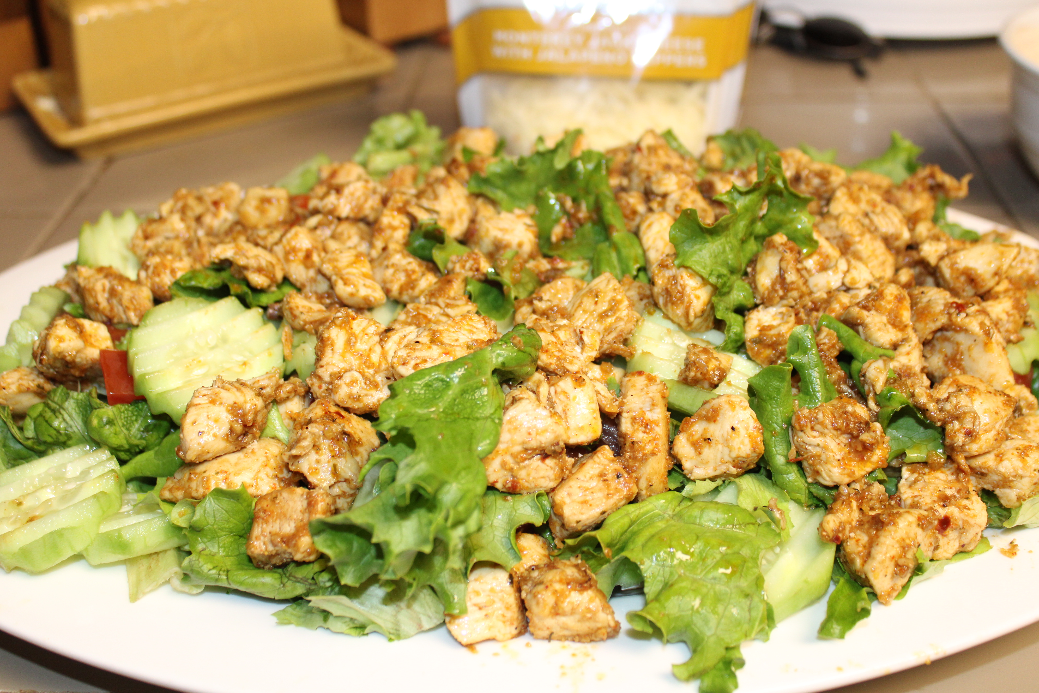While the chicken is cooking, chop the green leaf lettuce. Cut tomatoes in half. Peel and slice cucumber. Clean and slice the mushrooms. Place lettuce, tomatoes, cucumber and mushrooms in a large mixing bowl. Scatter spring greens into the bowl. Toss to blend. Spread salad out on a large serving platter, set aside. Set vegetables aside.