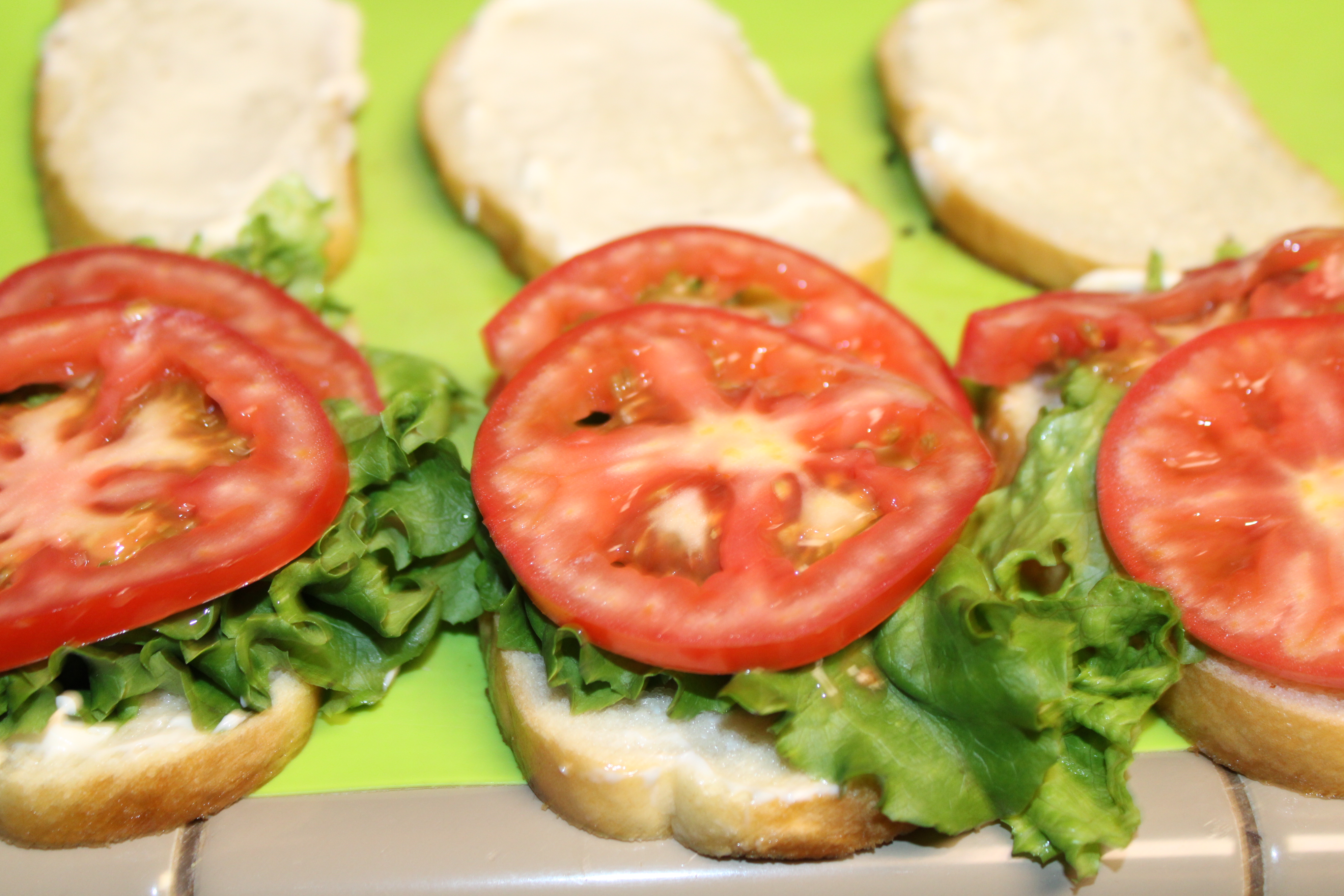 While the bacon is frying, slice tomatoes into 6 beautiful rounds. Rinse and pat dry the Arugula and lettuce leaves.