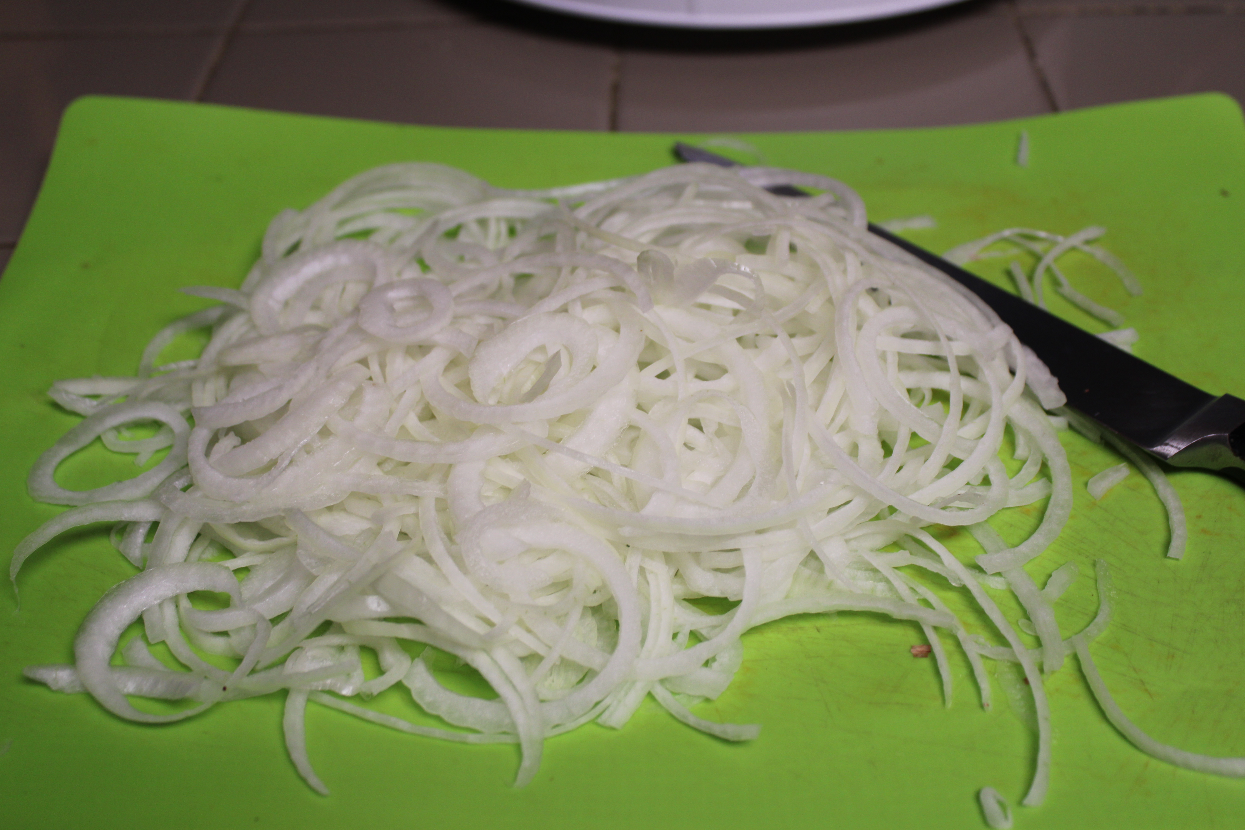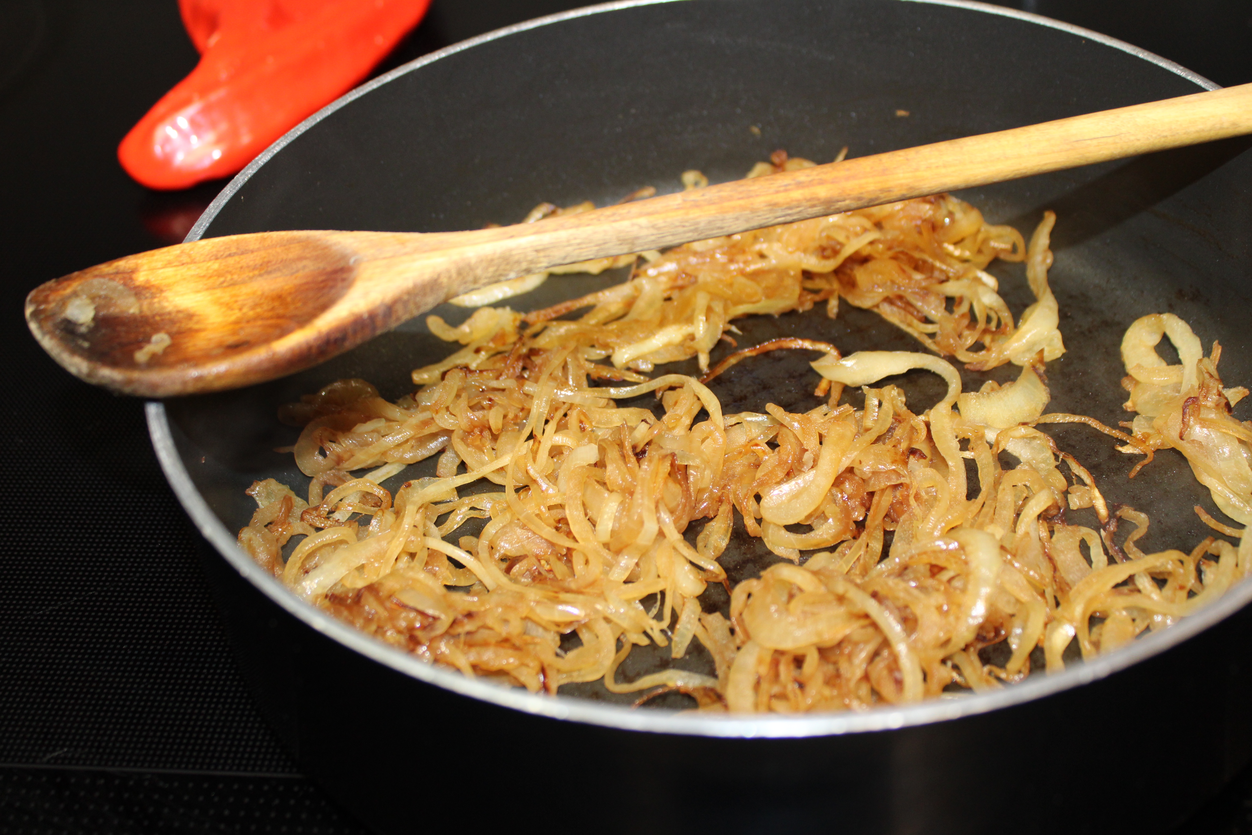 Cut onion from root to tip. Reserve half for another purpose, peel and thinly slice remaining half. In a dry skillet over medium heat grill onions until browned. Set aside.