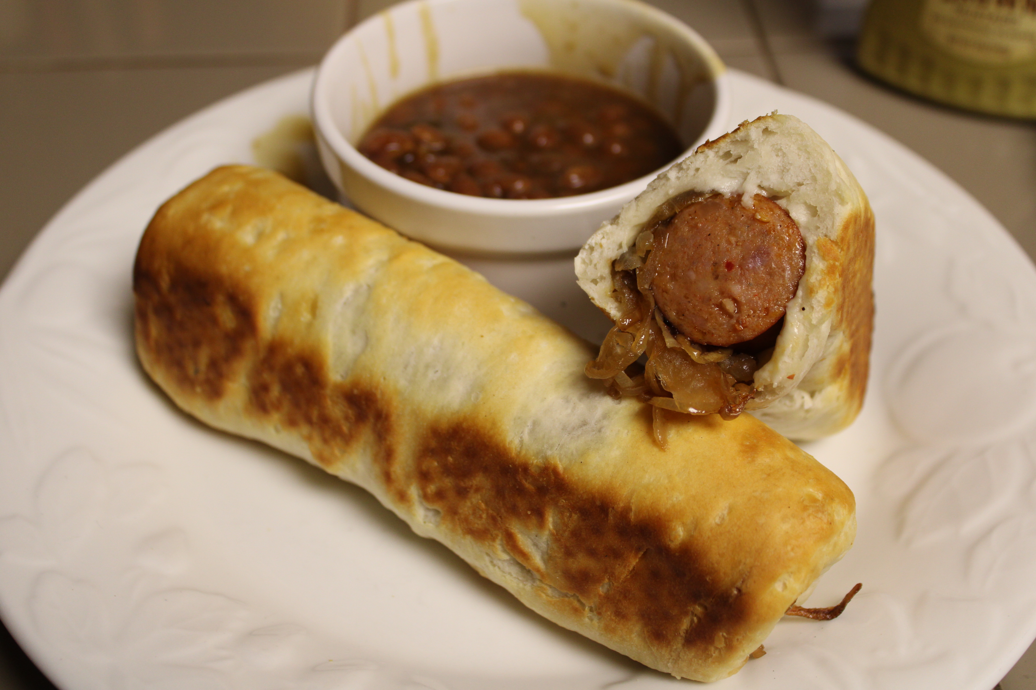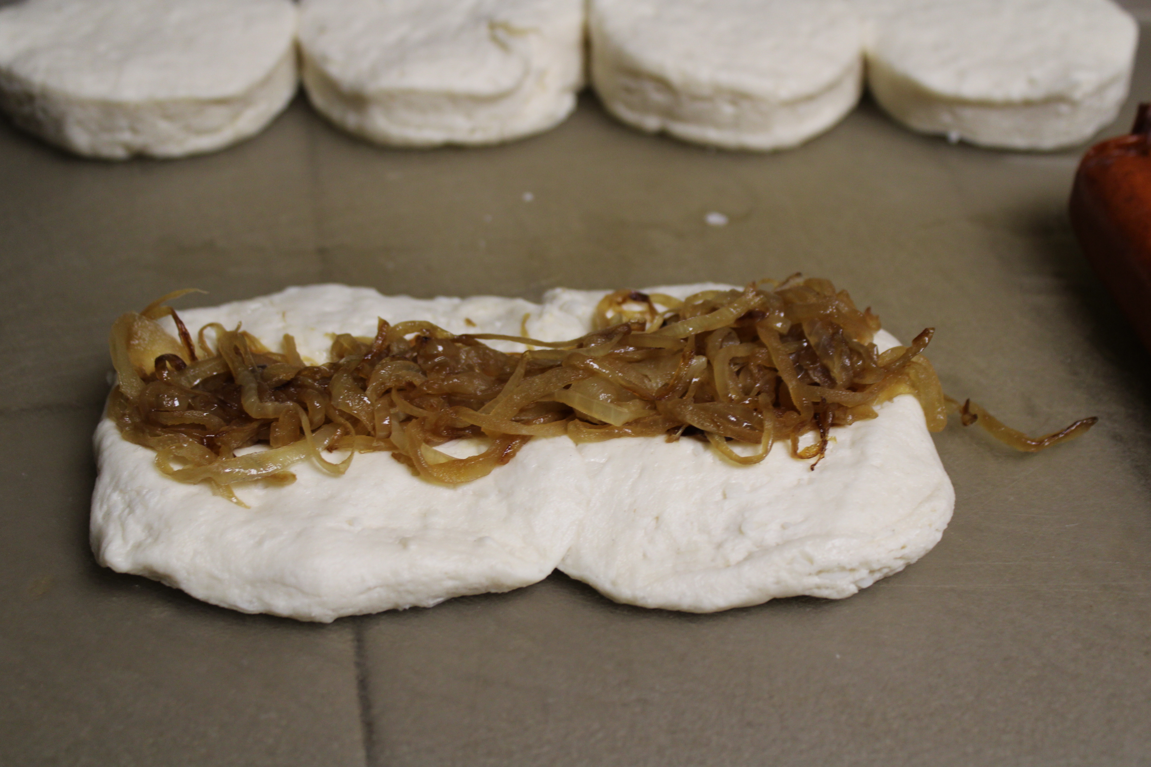 Open dough and break into 8 biscuits. Working with 2 biscuits at a time lay dough on a work surface with dough slightly overlapping. Pinch together to at the seam create one oblong biscuit. Roll out to flatten a single oblong biscuit just slightly shorter than the sausage link. Place sausage link in the center, press down to create an indentation. Scatter a quarter of the grilled onion into the indentation in the biscuit dough, pressing down lightly.