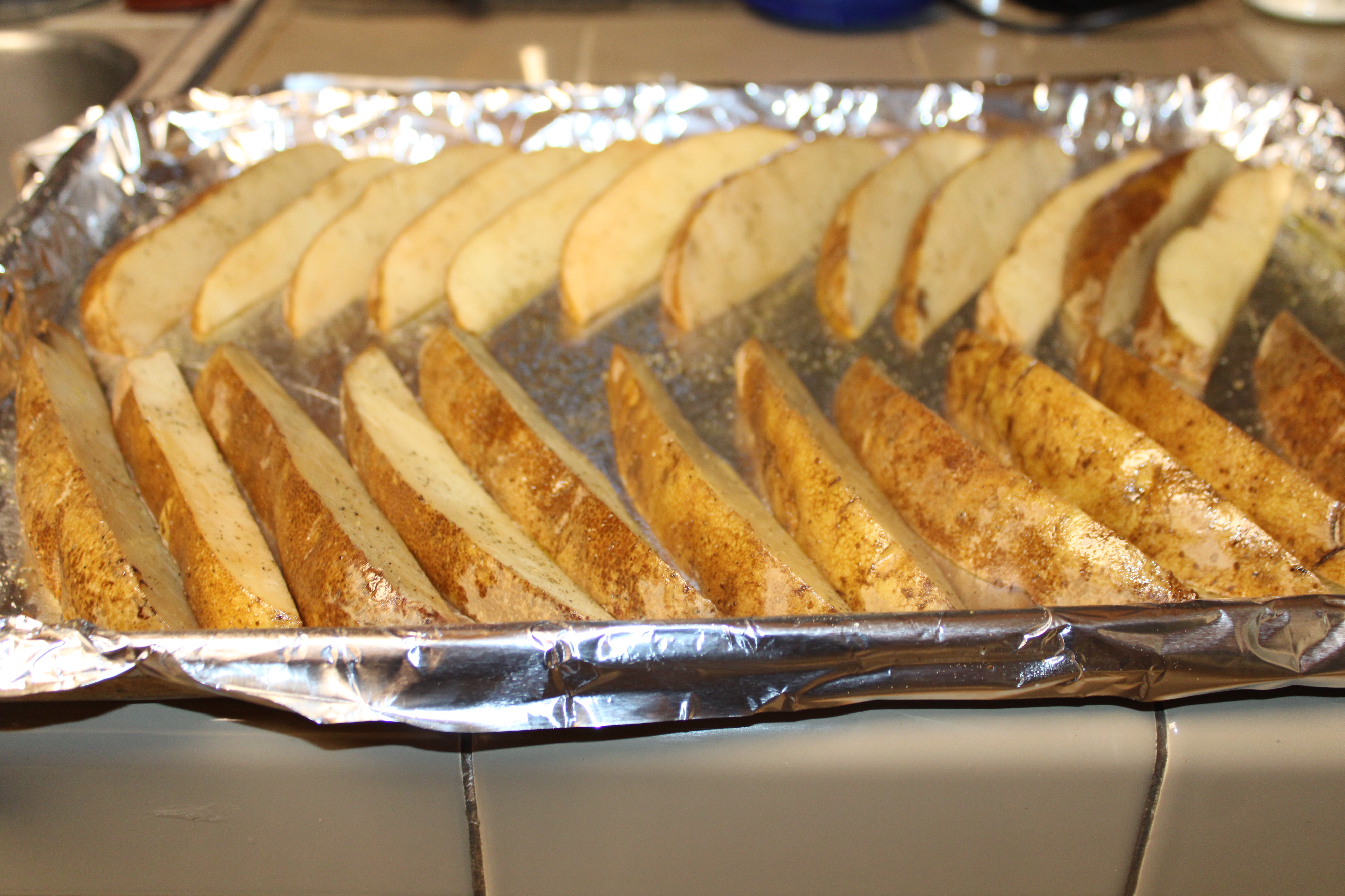 Scrub potatoes, pat dry. Slice into 8 wedges per potato. Arrange the potato wedges on the prepared baking sheet. Drizzle with oil to lightly coat. Season liberally with salt and pepper. Lay out flat and roast in the heated oven for 22 minutes. Remove from oven, turn and continue to roast another 22 minutes or until golden and crisp on the outside, soft and fluffy on the inside.