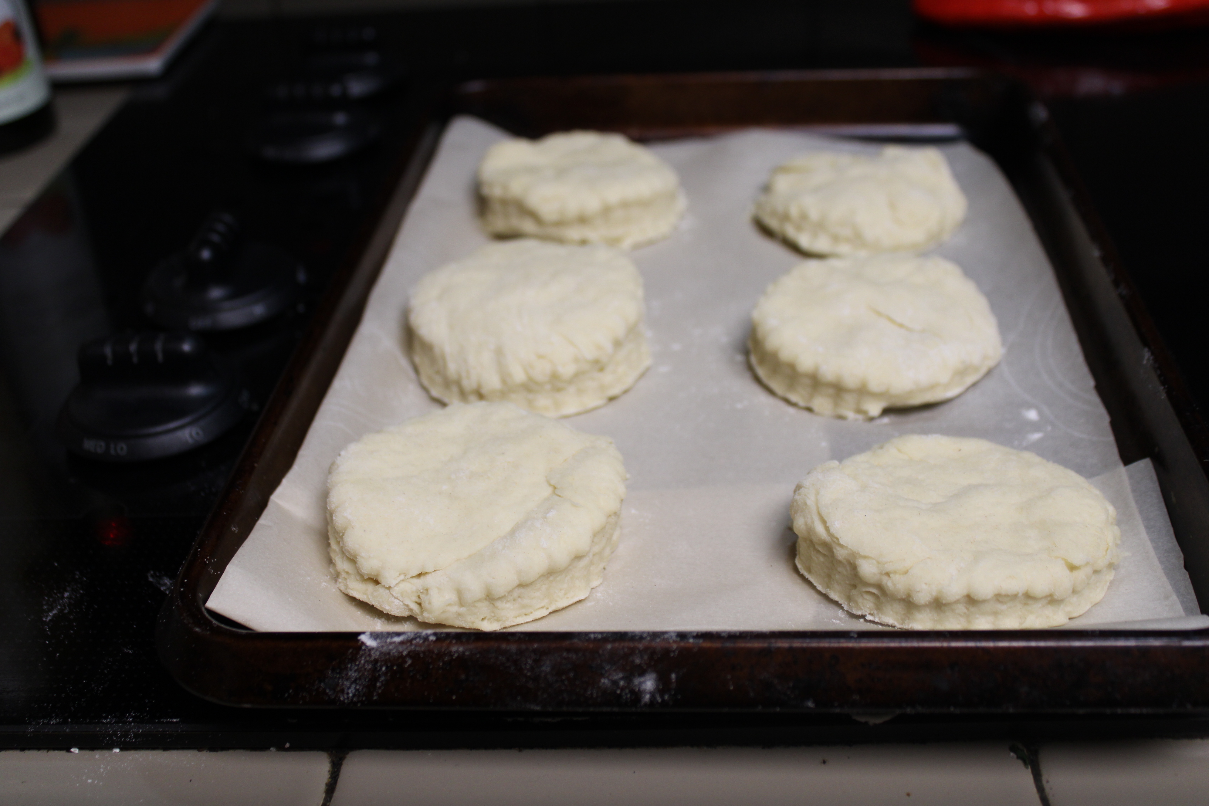 Lightly four a cutting board. Round up the soft dough into a ball; lightly knead on the floured board for about 30 seconds or so. Roll out or pat dough into a quarter-inch tick disk. With a lightly floured biscuit cutter or round cookie cutter, cut biscuits. Regroup any remaining dough, roll out a second time and cut. The total number of biscuits you get will depend upon the size of the biscuit cutter. I got 6 large biscuits.