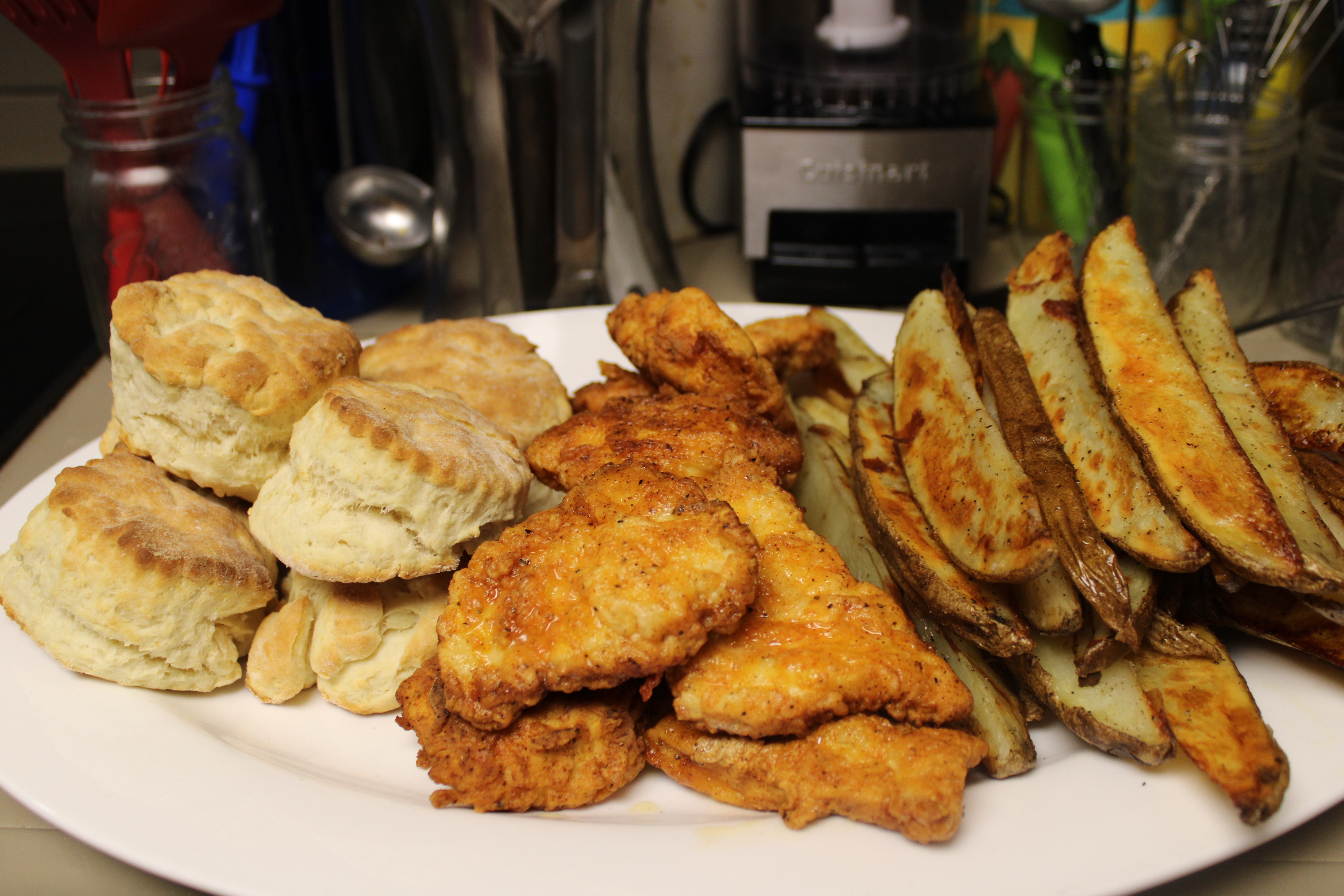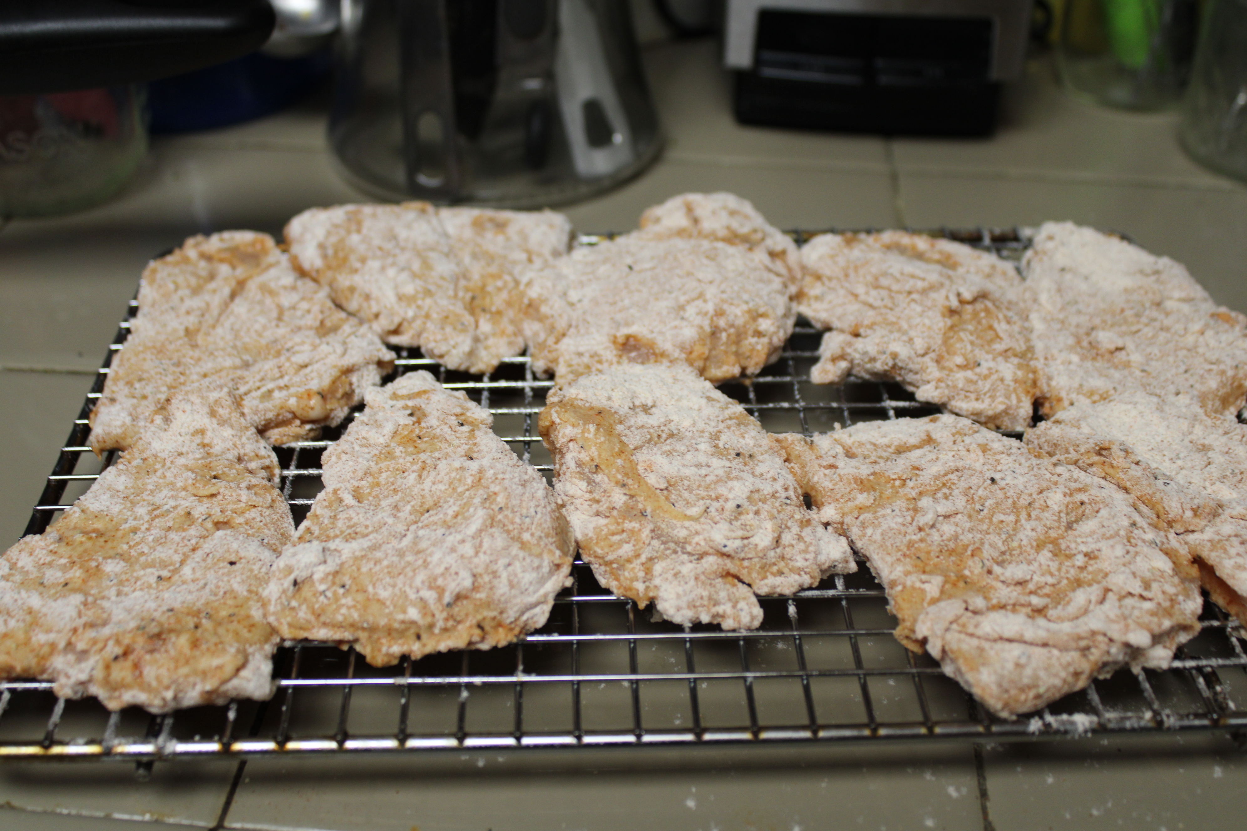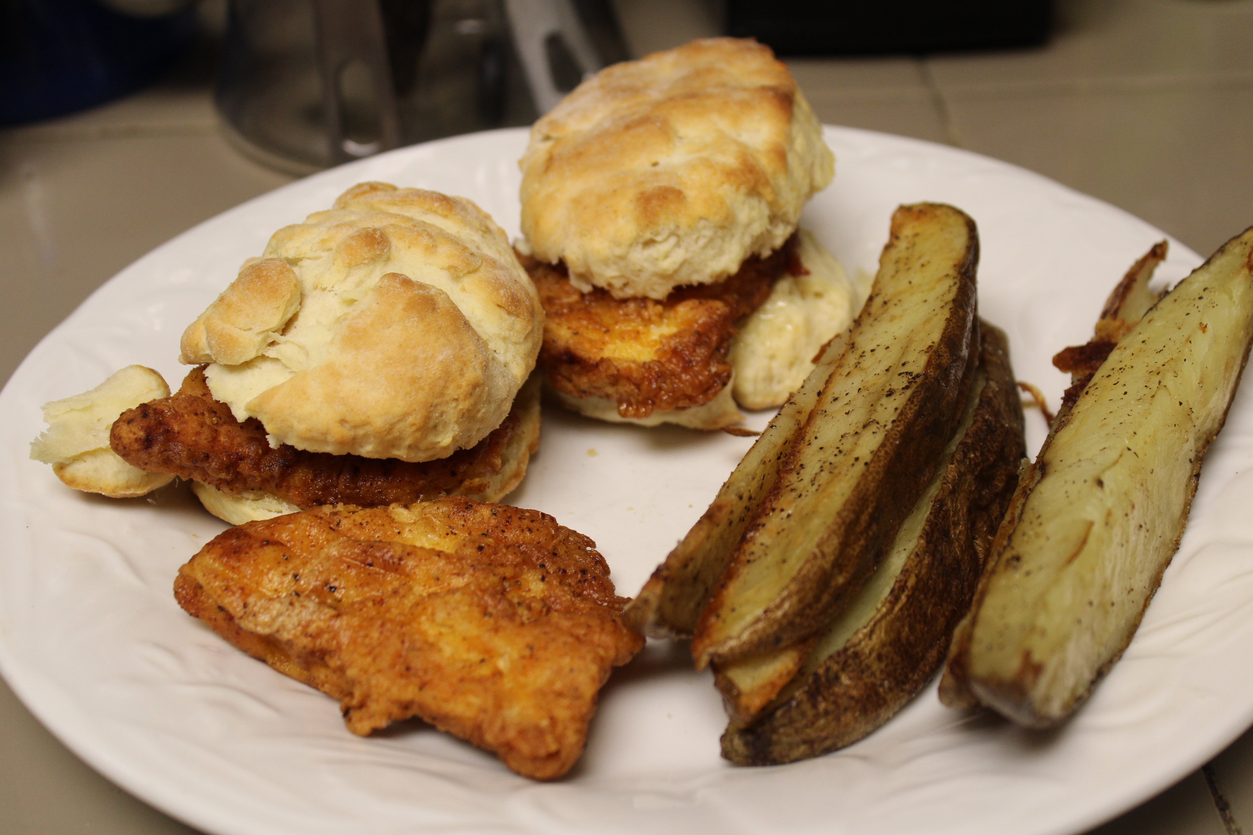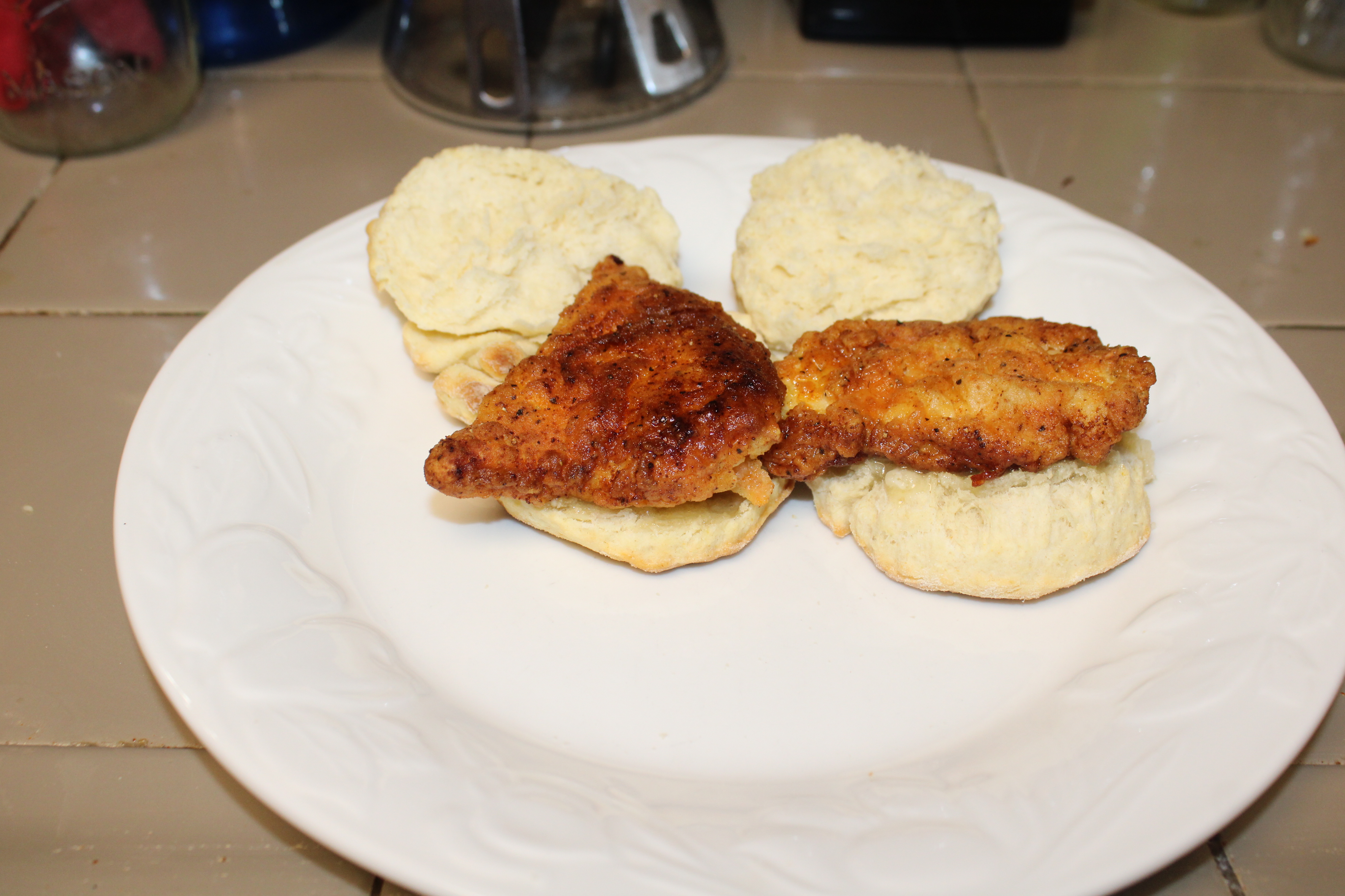 Cut fillets into smaller pieces to fit nicely on a biscuit with just a little overhang. Coat each fillet in flour, then in the hot sauce mixture, then in the flour again. Shake off excess after each coating. Lay chicken out on a wire rack over parchment paper for easy clean up. Let chicken rest for 10 minutes to allow the coating to adhere well to the meat.
