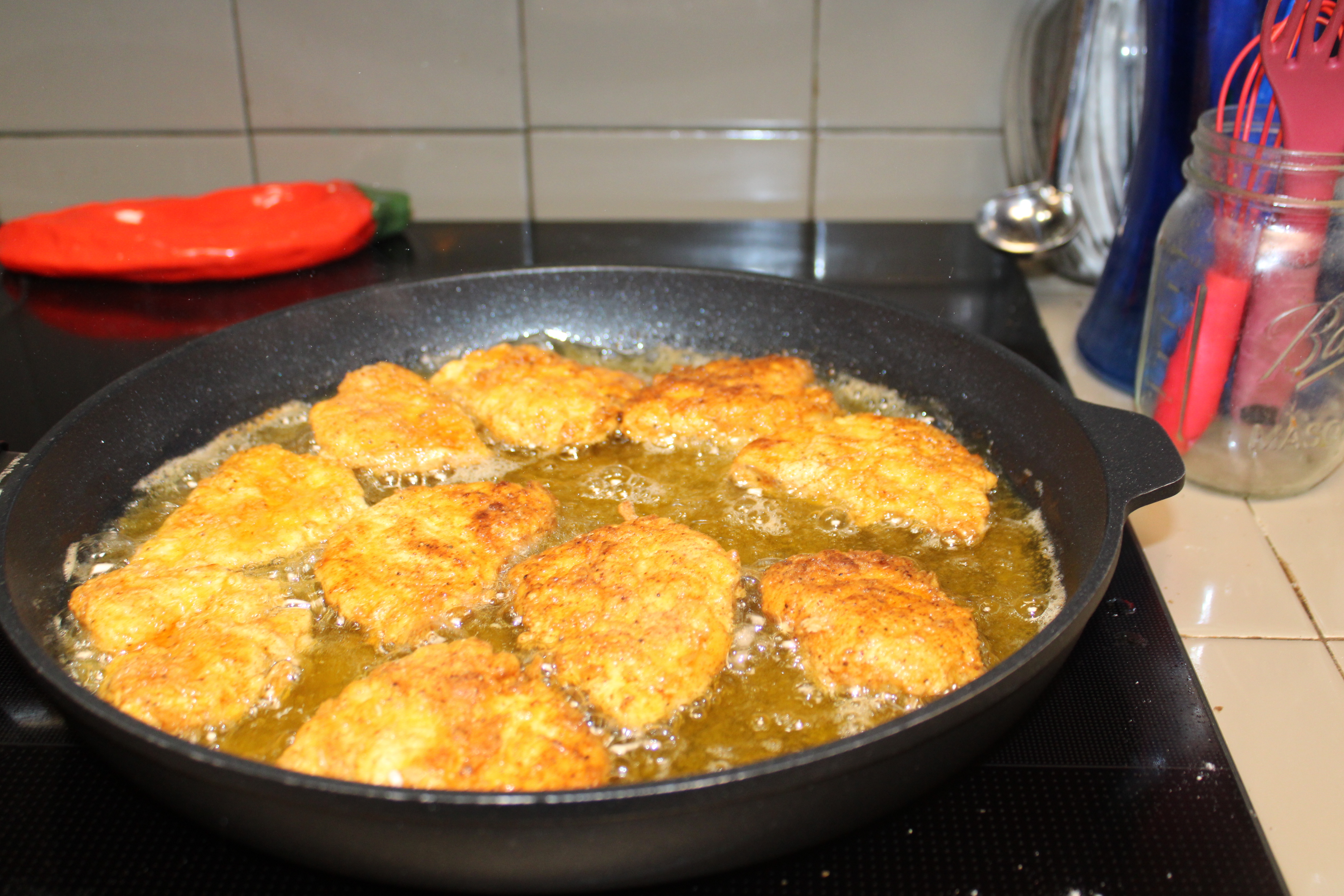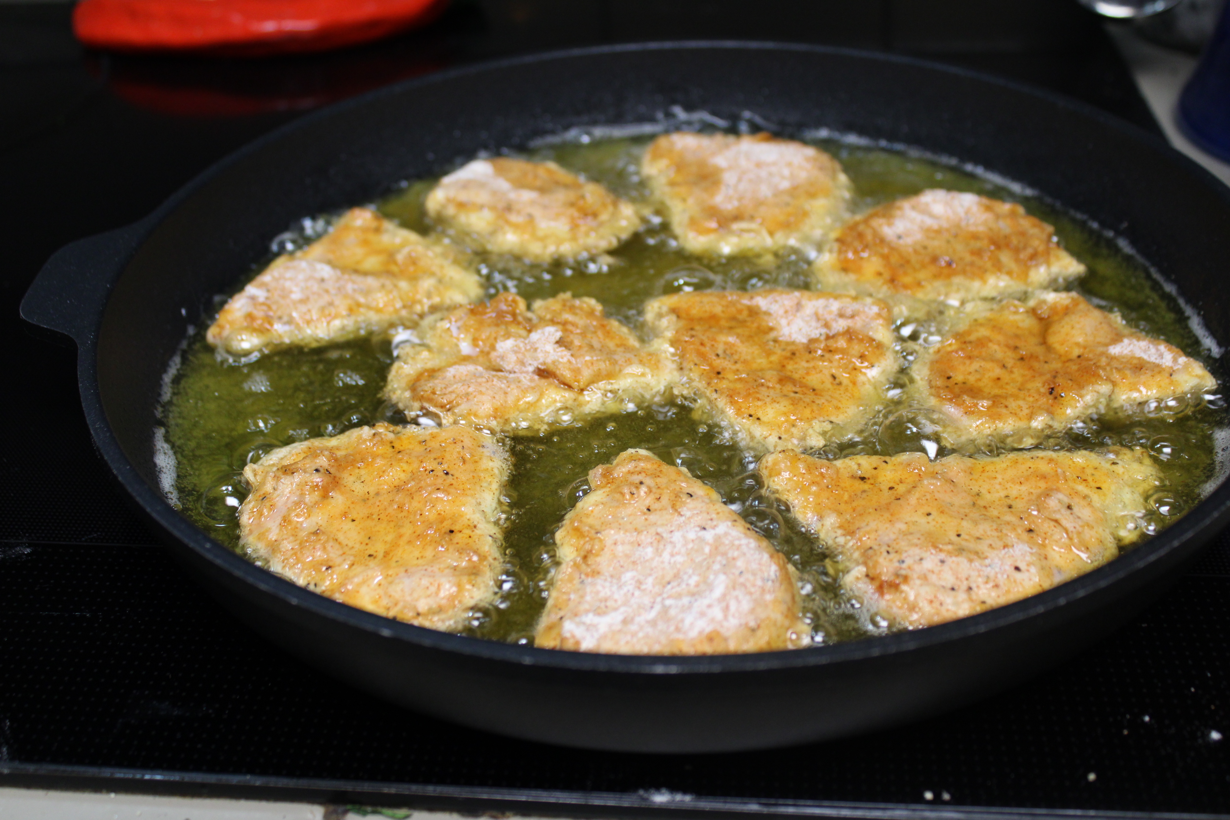 Fill a skillet with about half an inch of oil. Heat oil over medium high heat. Place half of the chicken into the hot oil. Immediately turn the head down to medium. Fry chicken for about 3 minutes. Turn, continue to fry another 2 to 3 minutes. Place chicken on a wire rack to drain, hold in a warm oven until all the chicken has been fried.