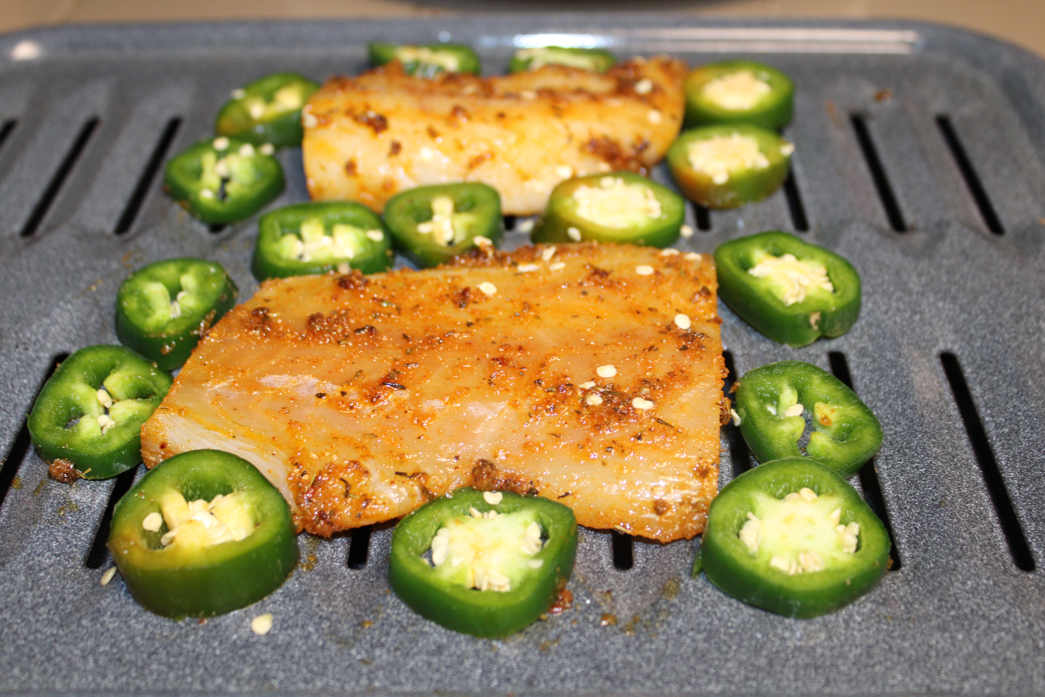 Heat oven to broil with the rack about 5 inches from the heat source. Remove cod from the refrigerator. Place fish on a broiler pan. Stem Jalapenos, slice into rounds. Arrange slices around the fish. Broil about 4 minutes per side, until flaky. Serve with Spicy Rice and a Southwest Chopped Salad.