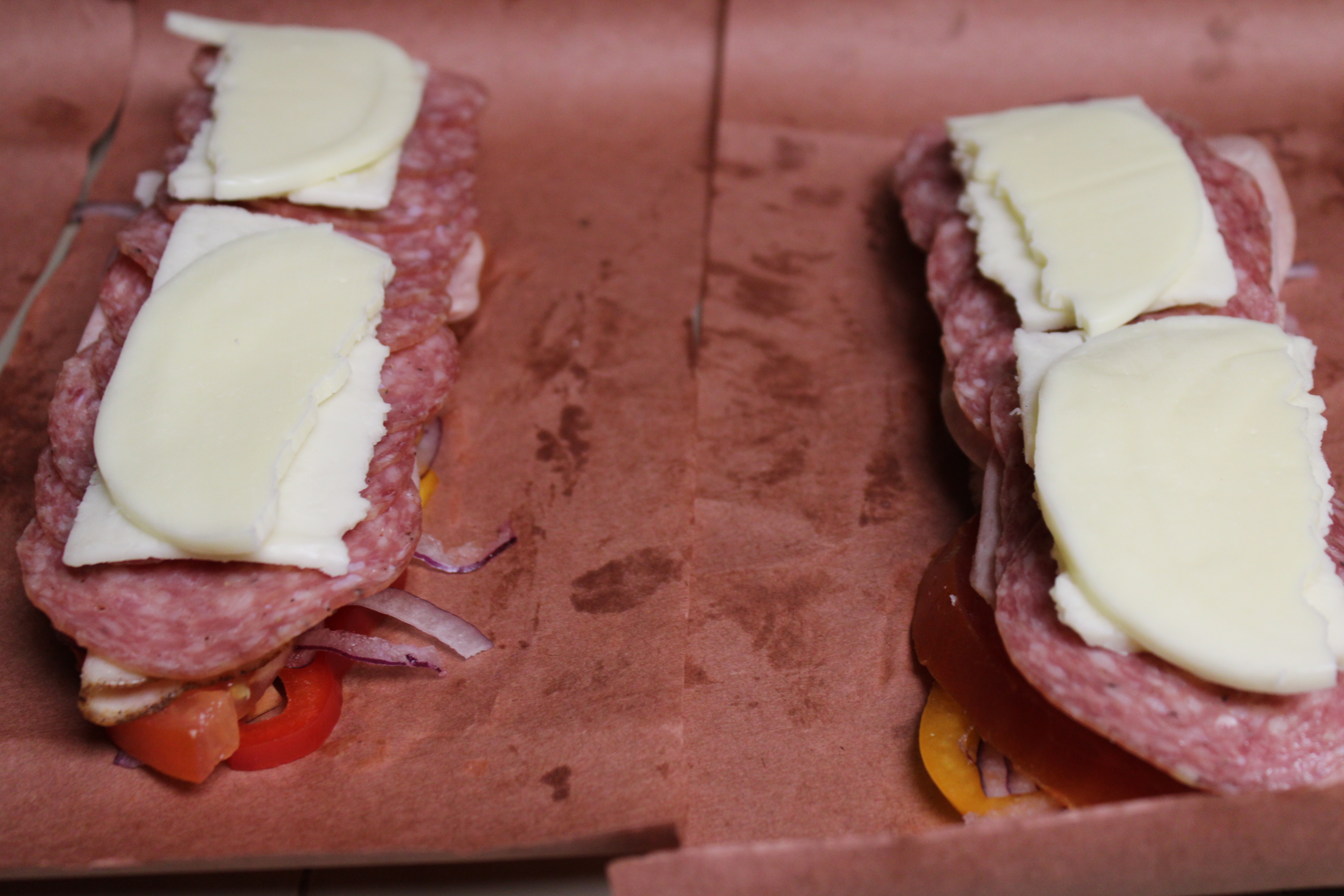 Cut four slices of butcher paper. Roll each sandwich filling onto the butcher paper, meat side up. Cut cheese slices in half, top the meat with the cheeses. At this point the makings for the sub could be wrapped in the butcher paper, packed away for a picnic and assembled just before serving.
