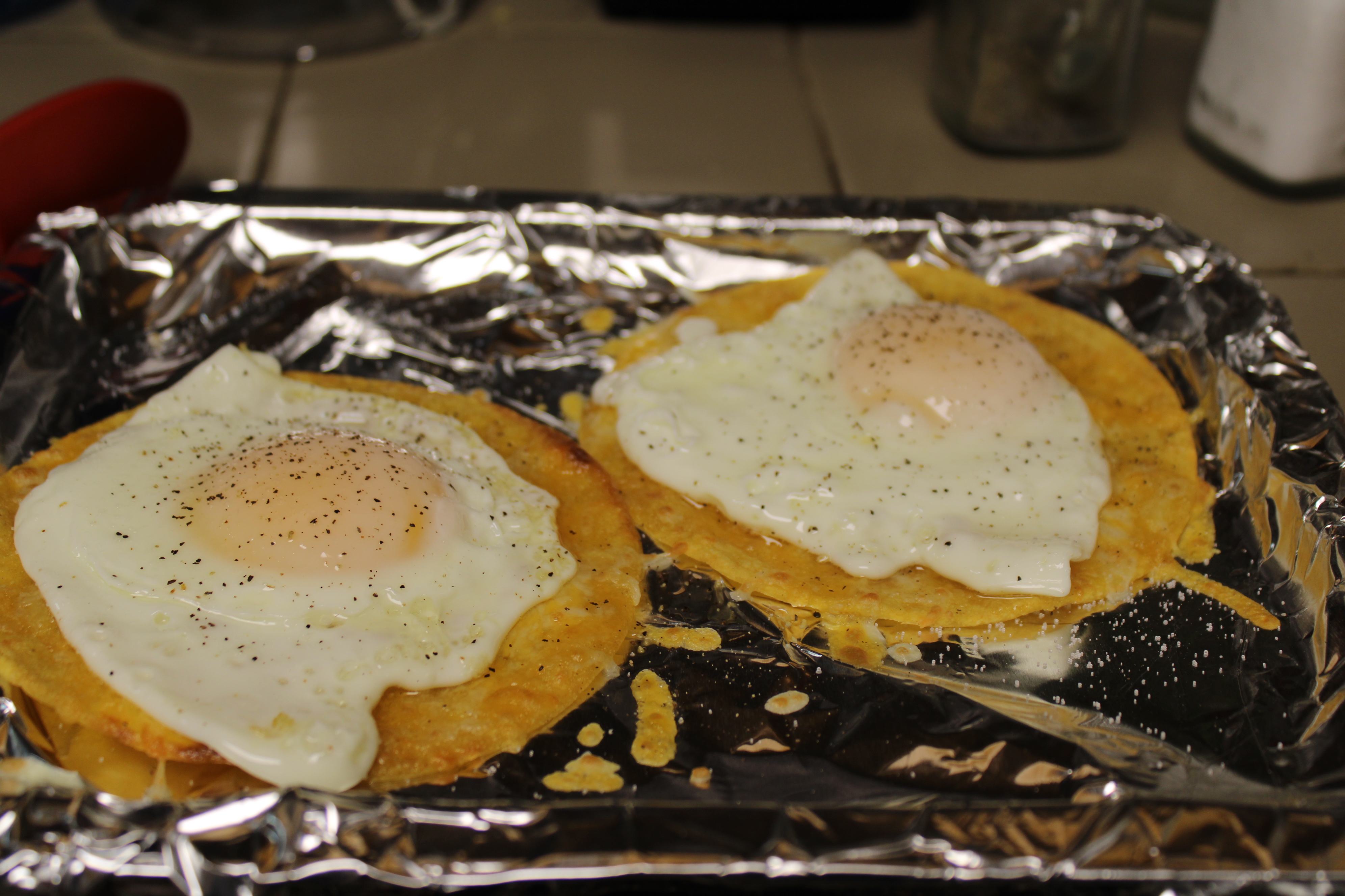 Transfer eggs to the center of each tortilla. Divide reaming quarter cup of cheese over each egg. Top with salsa. Place under the broiler just long enough for the cheese to melt without cooking the egg further.