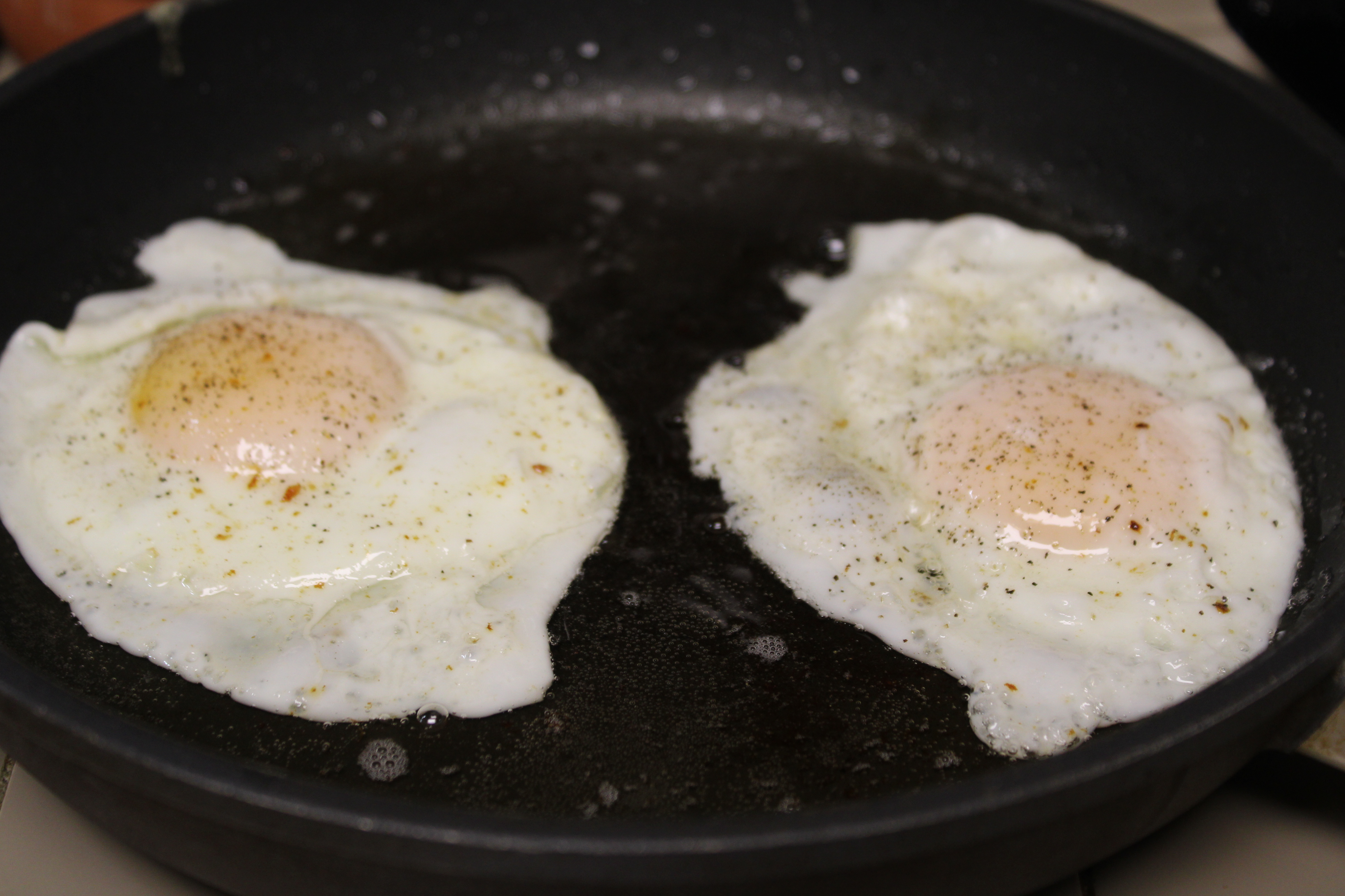 Carefully place 4 eggs in the skillet with oil off heat. Once the eggs begin to set, return skillet to low heat. Baste eggs with hot oil until the whites are cooked while the yolks are still runny.