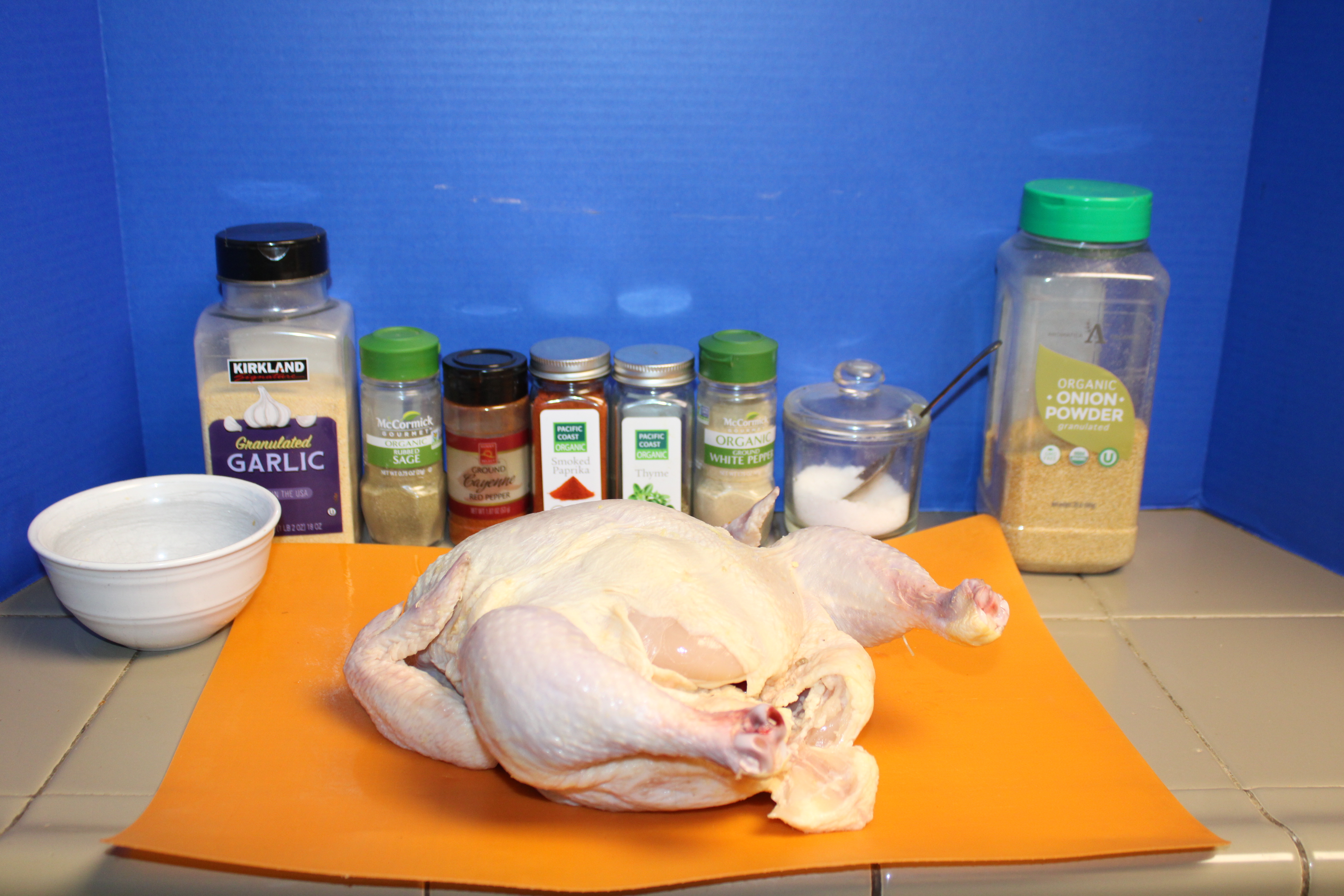 Pat the chicken dry inside and out, Rub the entire chicken, inside, outside and under the skin with the seasoning blend. Place the chicken in a gallon-size bag. Refrigerate the bird for at least an hour and up to 24 hours for the spices to flavor the chicken.