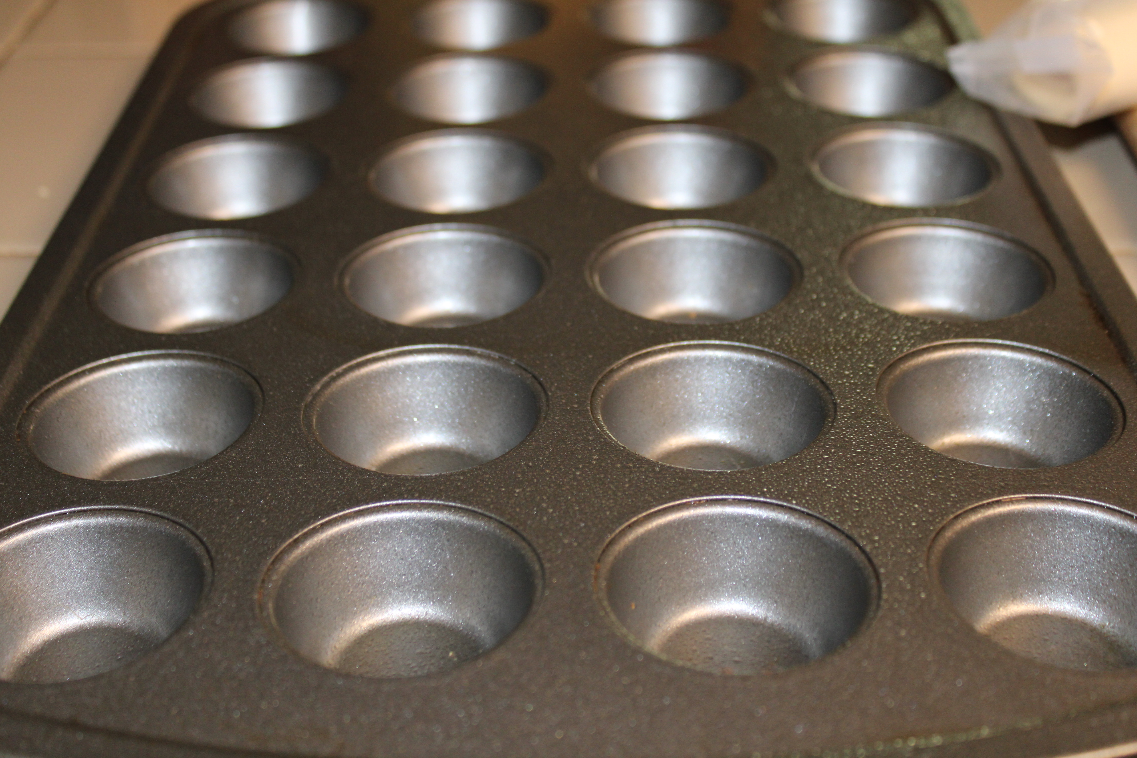 Heat oven to 350 degrees. Spray 30 mini muffin tins with cooking spray. Set aside.