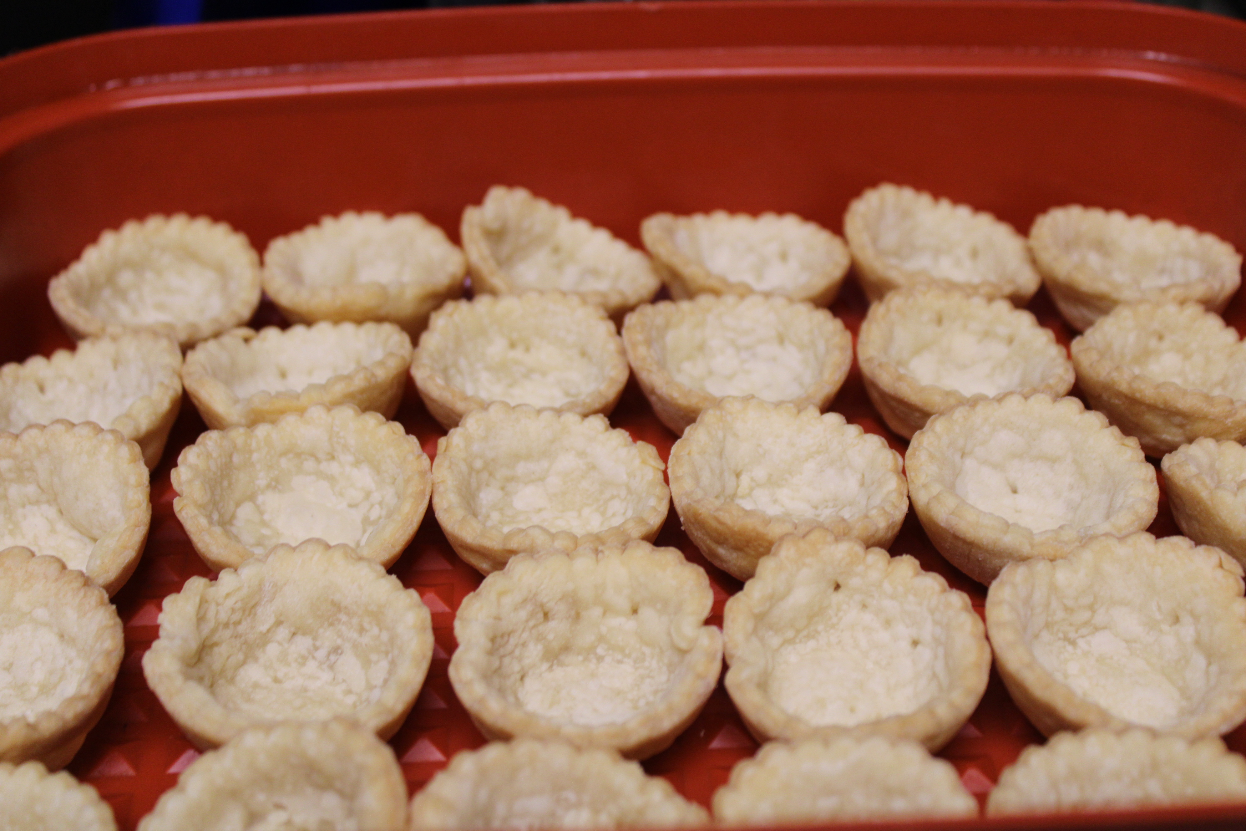On a floured surface, carefully unroll the pie dough. Using a cookie cutter, fluted biscuit cutter or the rim of a glass, cut out rounds from the pie dough. Place each circle into the muffin pan, press down. Prick the inside of each cup with a fork to prevent crust from puffing up.
