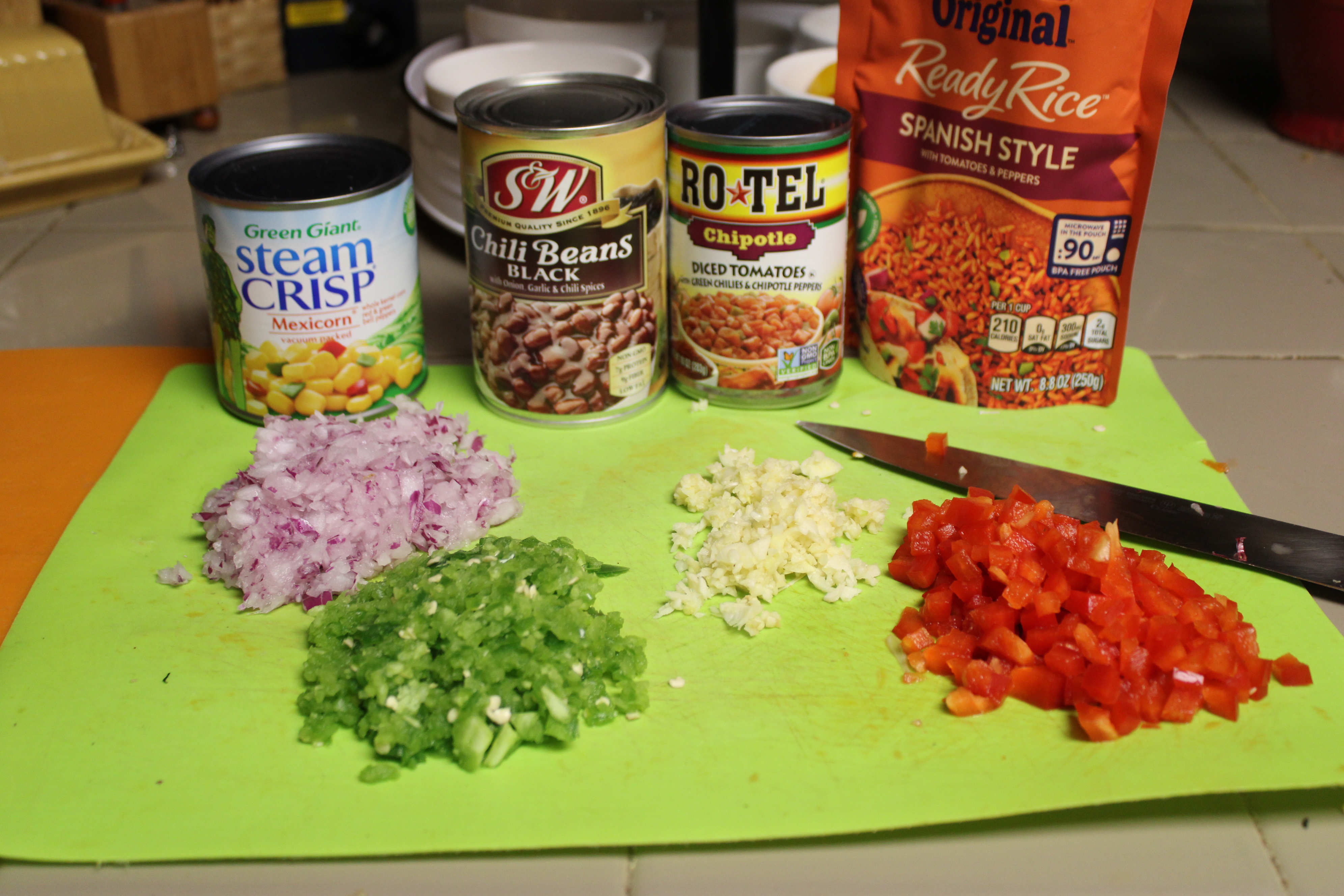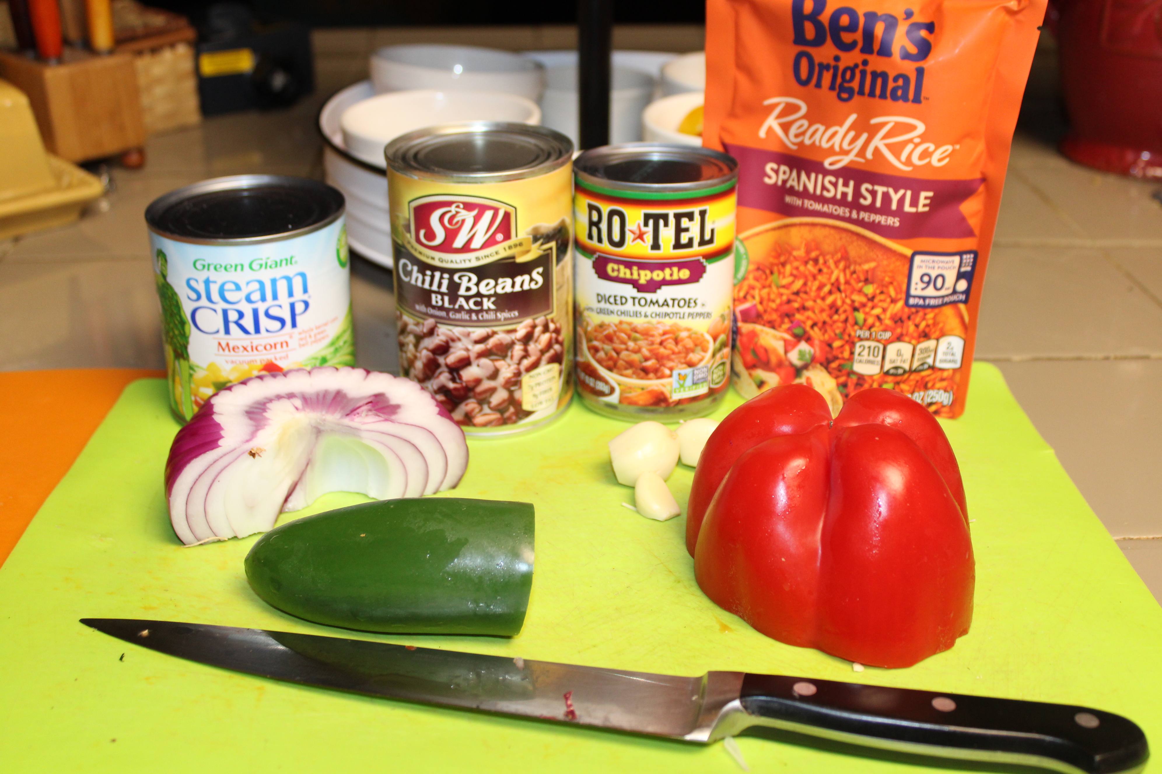 Once the chicken is no longer pink, scatter garlic, bell pepper and jalapenno into the skillet. Sauté for about a minute or so longer. Stir in the rice, Rotel tomatoes, black beans in the sauce and drained corn. Mix the seasonings together in a small bowl, scatter over the chicken mixture in the skillet. Continue to cook about 2 minutes longer for flavors to mingle. Remove from heat.