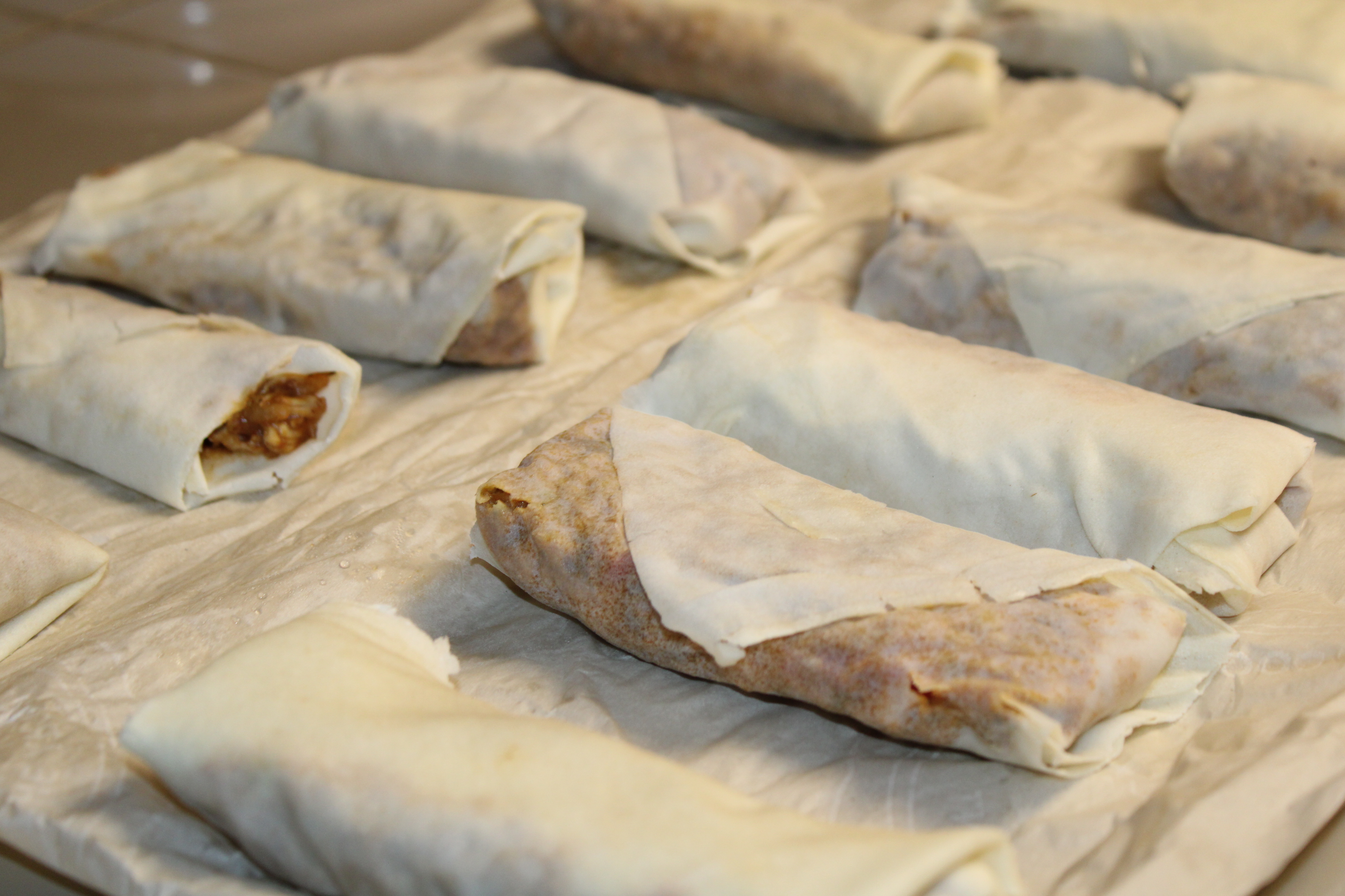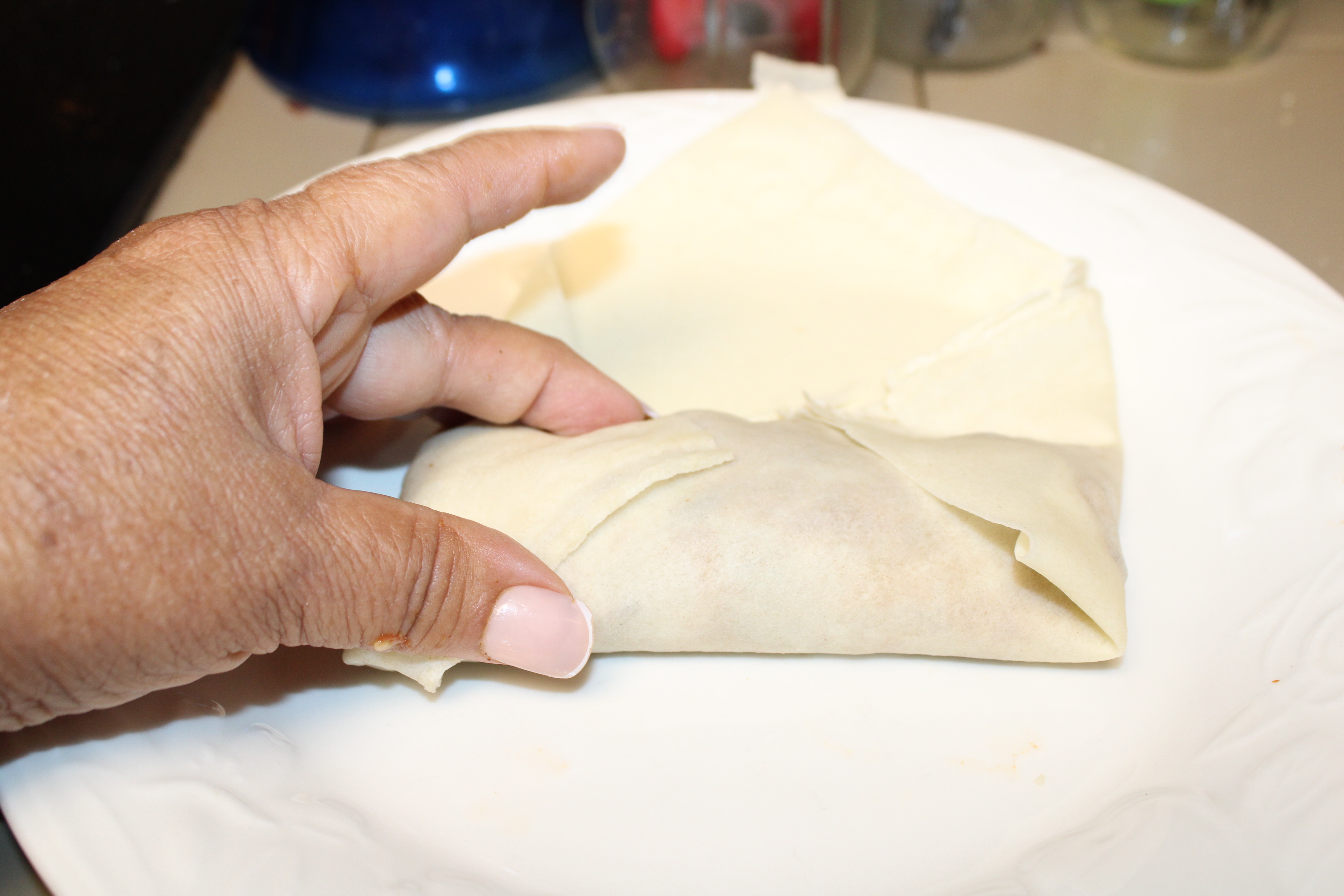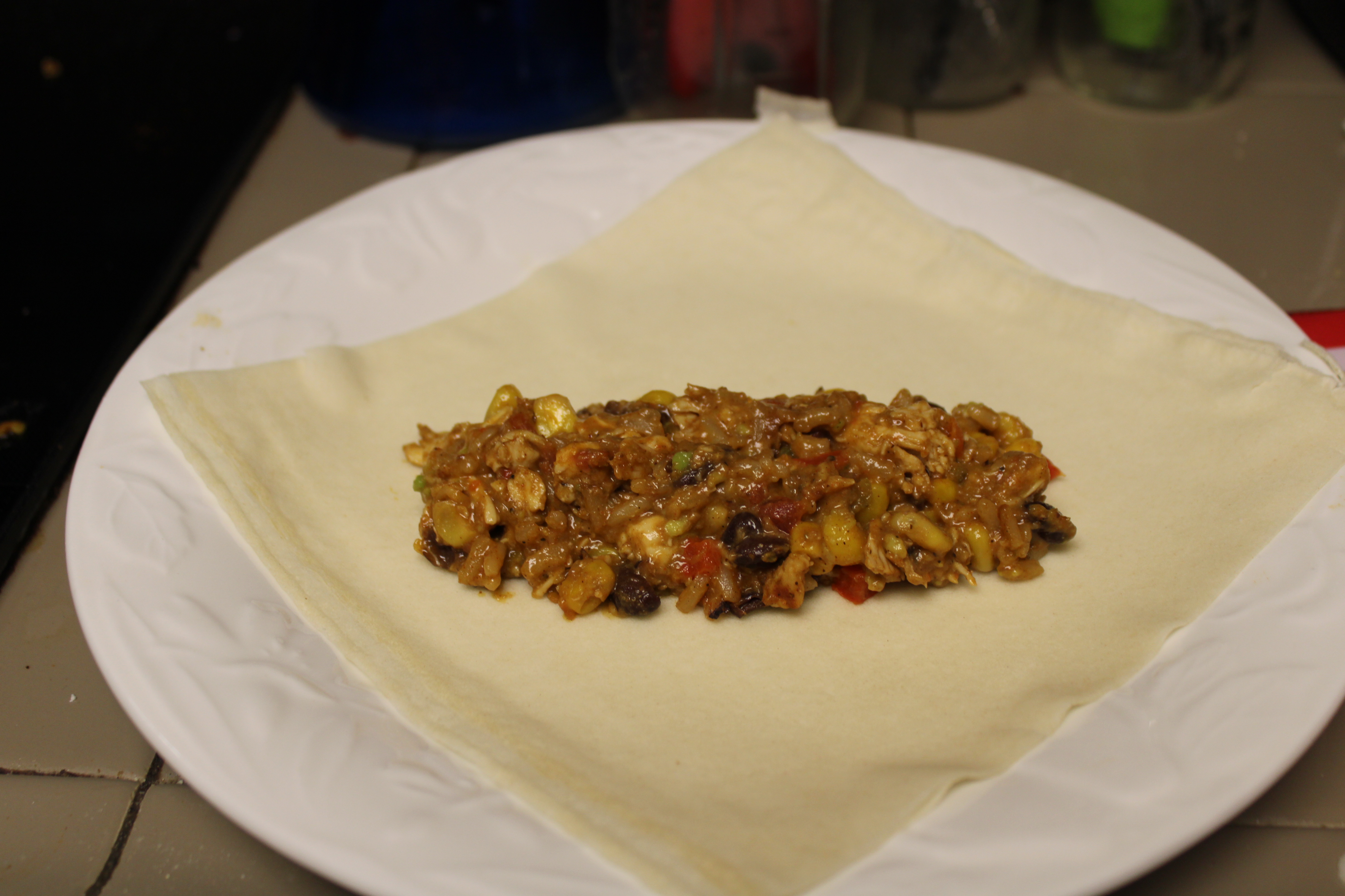 Place the filled egg roll, seam side down, on the parchment paper. Repeat until all the wrappers have been filled.