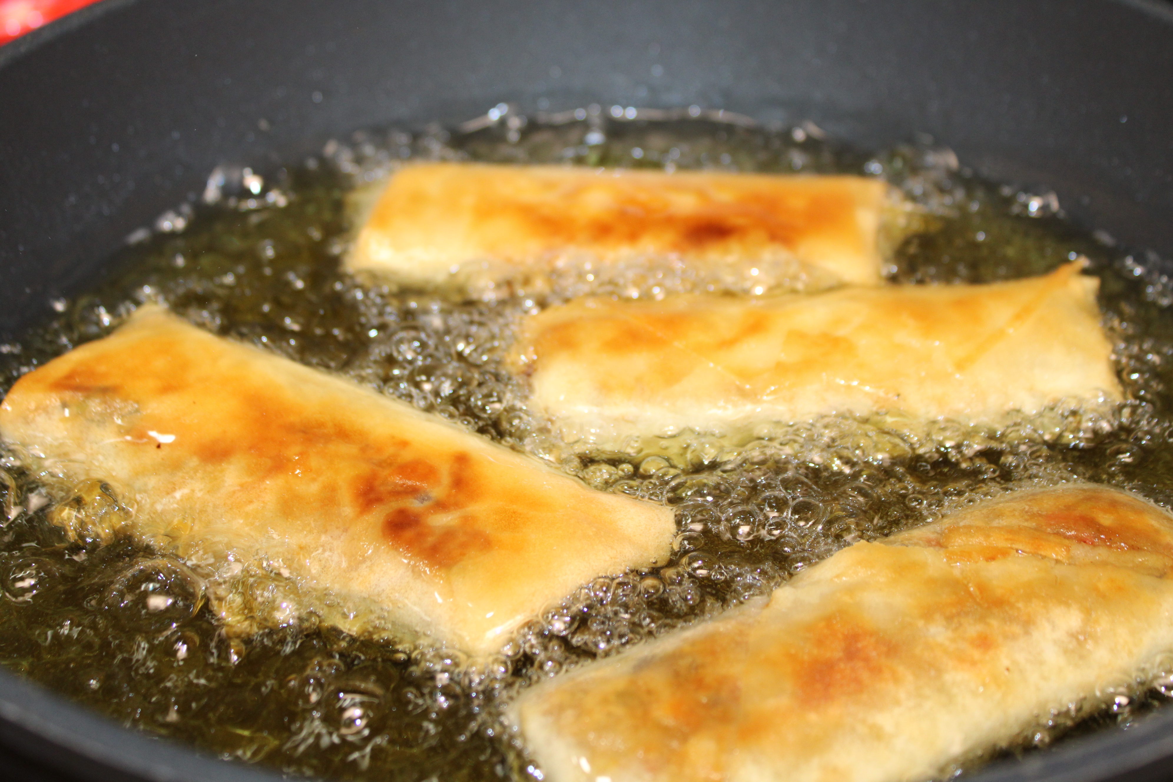Heat the oil in a stockpot or Dutch Oven deep enough to almost submerge the egg roll. Heat oil to approximately 350-degrees. Working in batches, fry egg rolls a few at a time, turning as needed for even browning and crispness. Drain on paper towels. Hold in a warm oven until ready to serve.