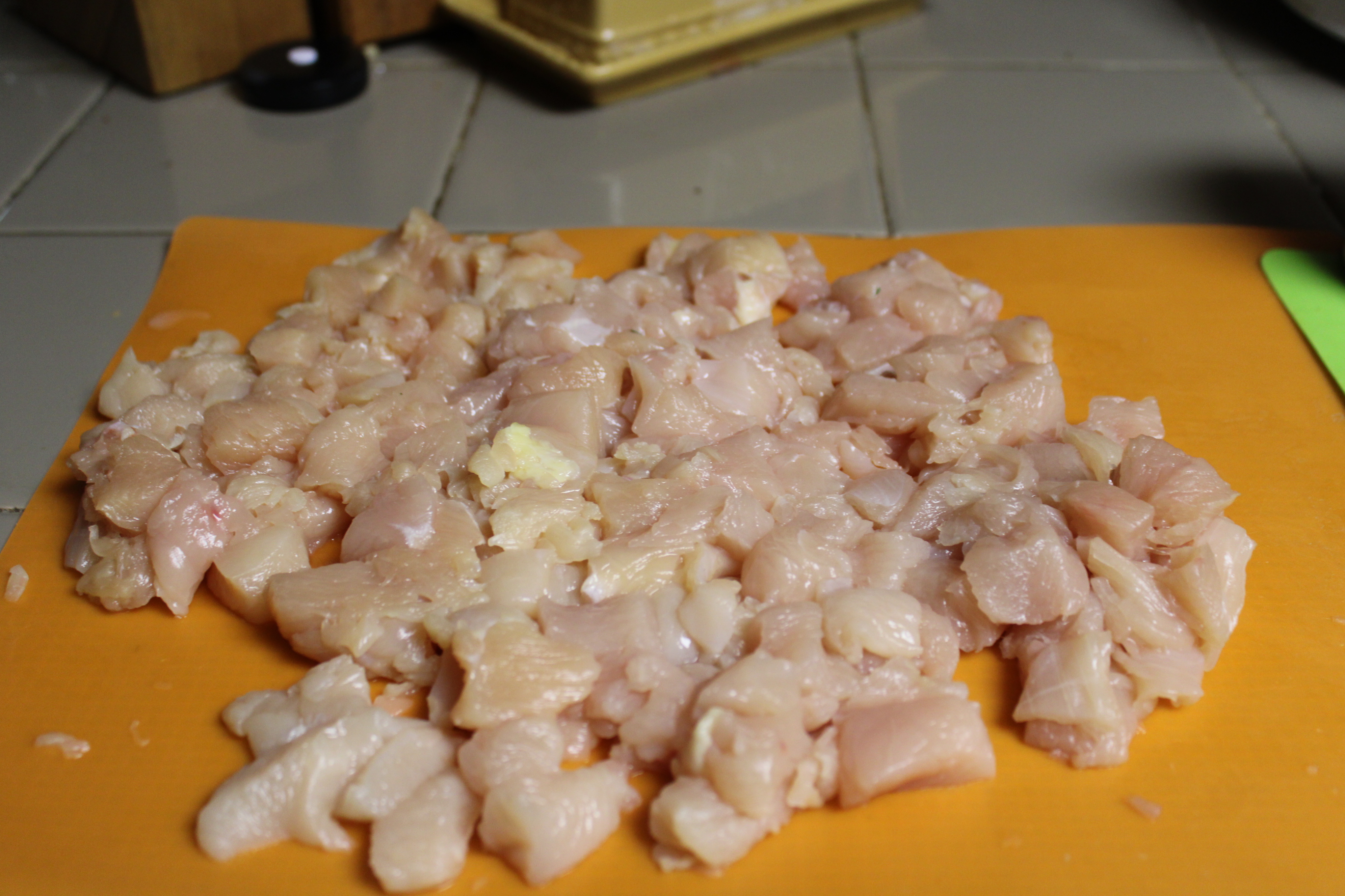 In a large skillet heat spicy olive oil over medium-high heat. Add diced chicken and onions. Cook until the chicken is no longer pink.