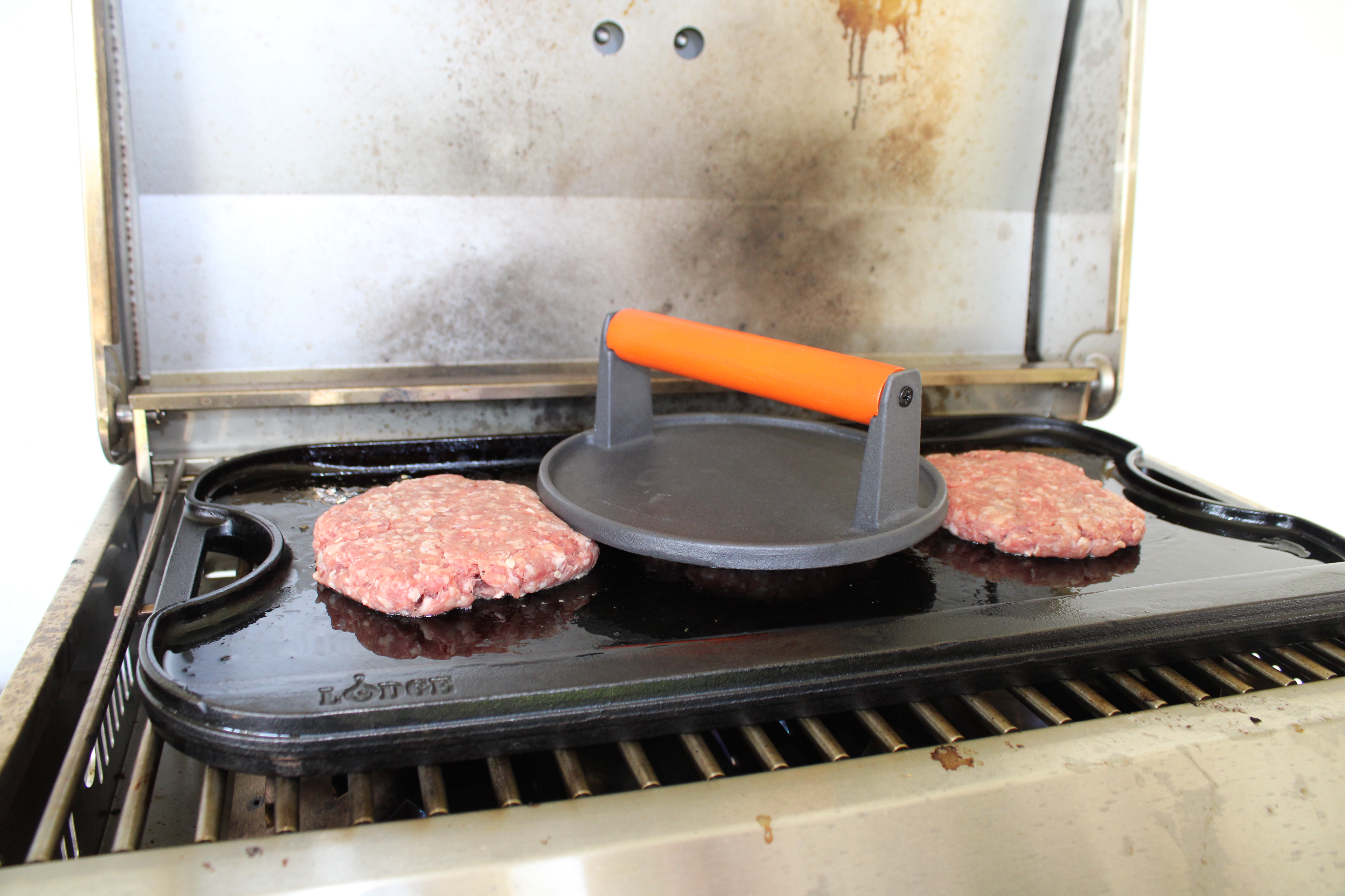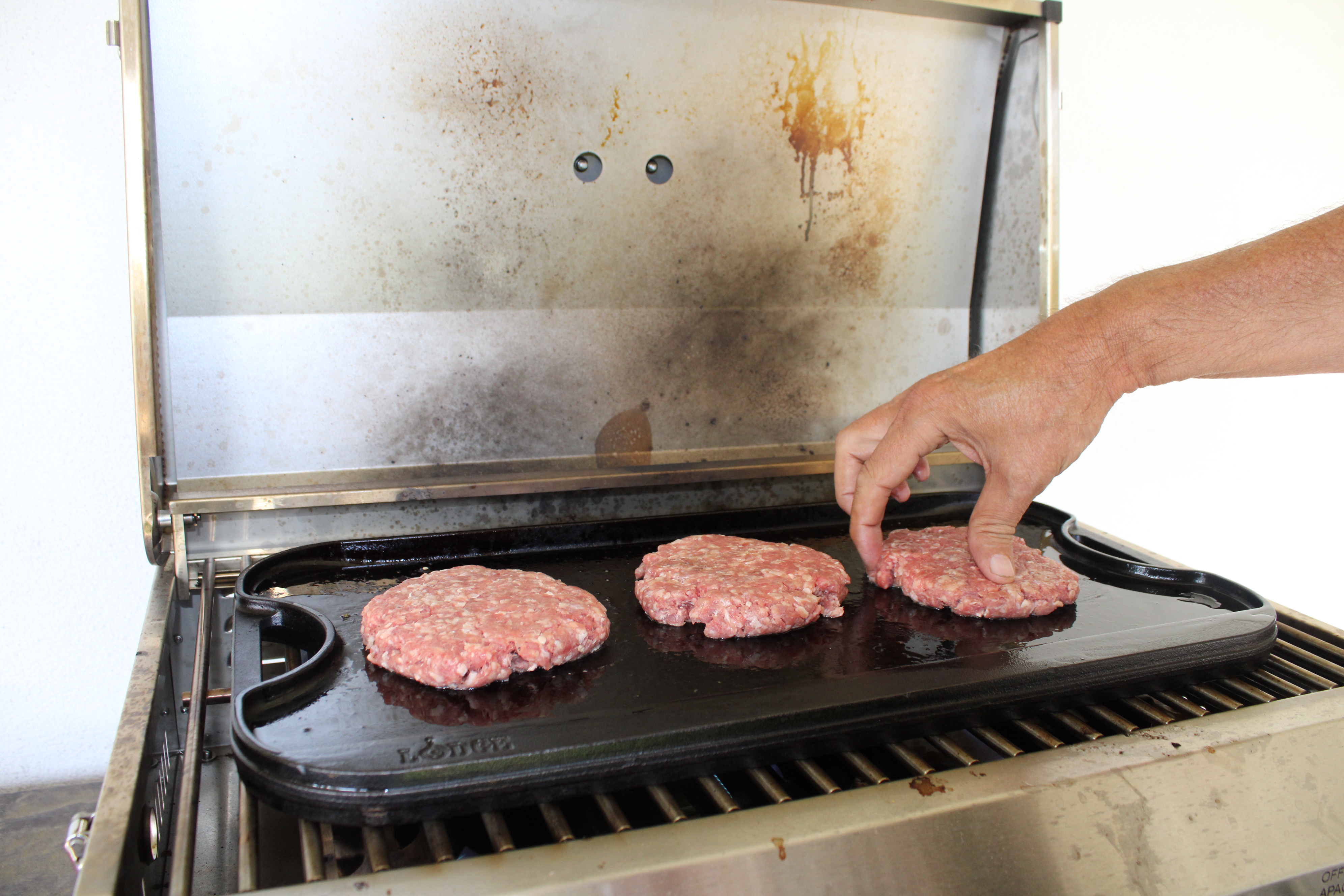 Heat a cast iron griddle on the grill over medium high heat for several minutes until almost smoking hot. Toast buns buttered side down until lightly browned, about 90 seconds. Wrap buns in foil to keep warm.