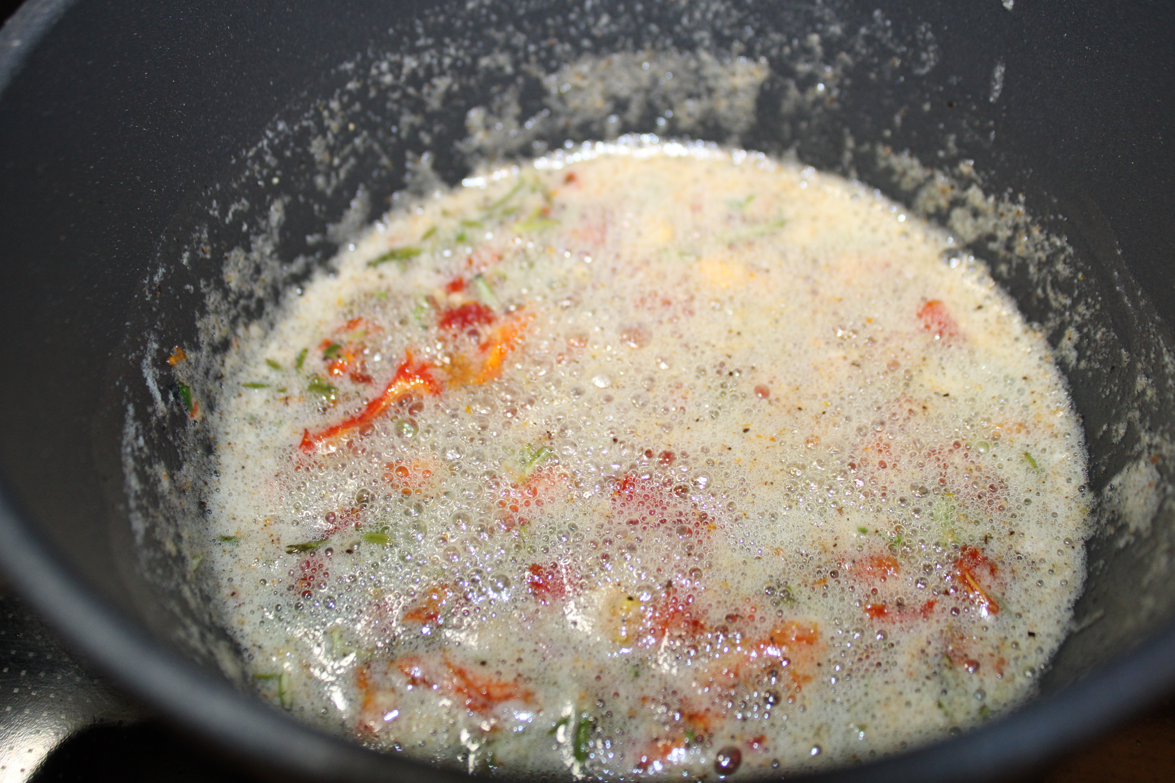 In a small sauce pan centime the butter, olive oil, garlic,, rosemary and sun-dried tomatoes. Cook for about 4 minutes until the garlic has softened and the mixture if fragrant. Season with salt and pepper to taste. Remove from heat.