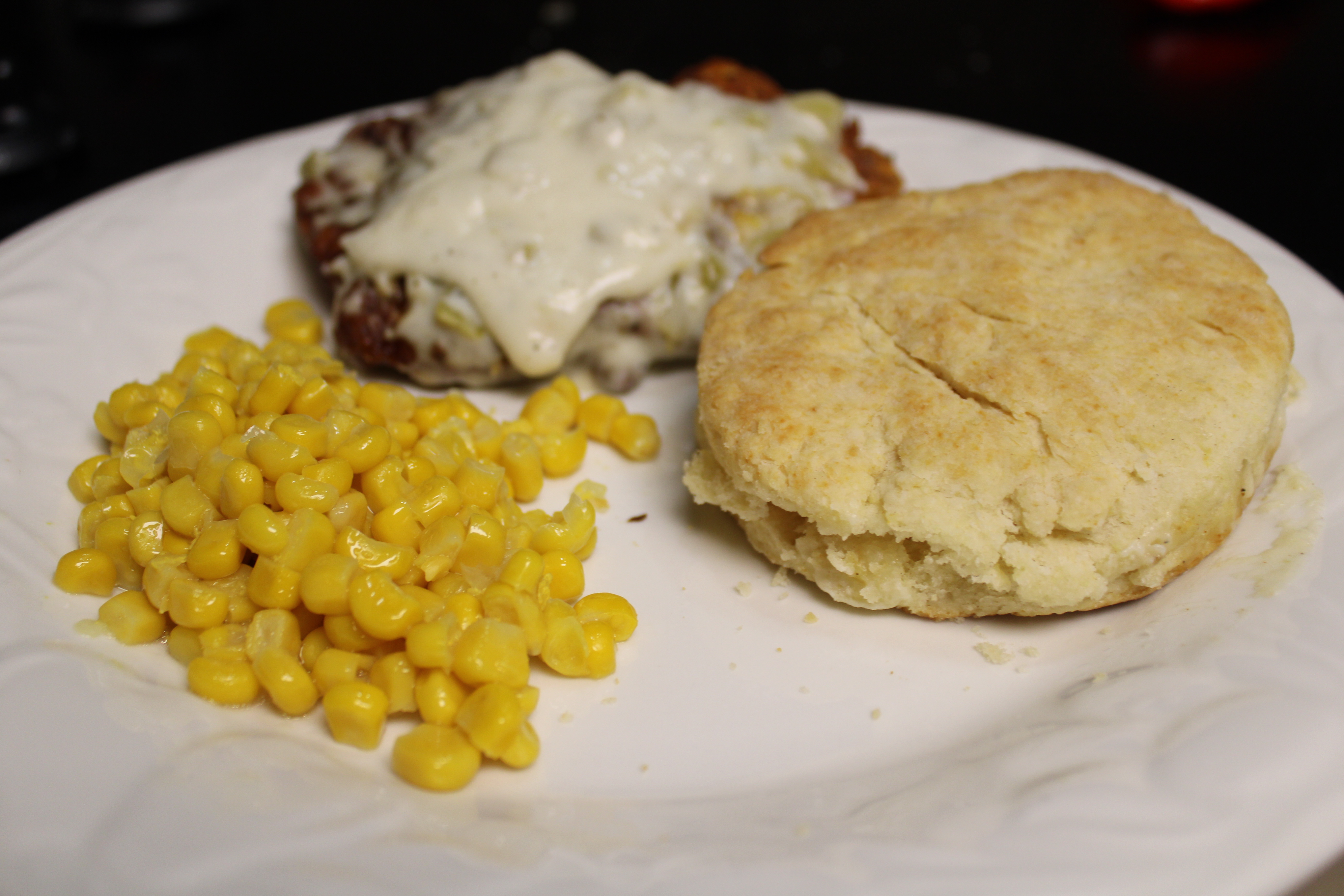 To serve: Spoon some of gravy over the chicken breasts, transfer the remaining gravy to a boat or bowl to use table side. Arrange biscuits on the platter with the chicken. Serve with buttery corn and enjoy.