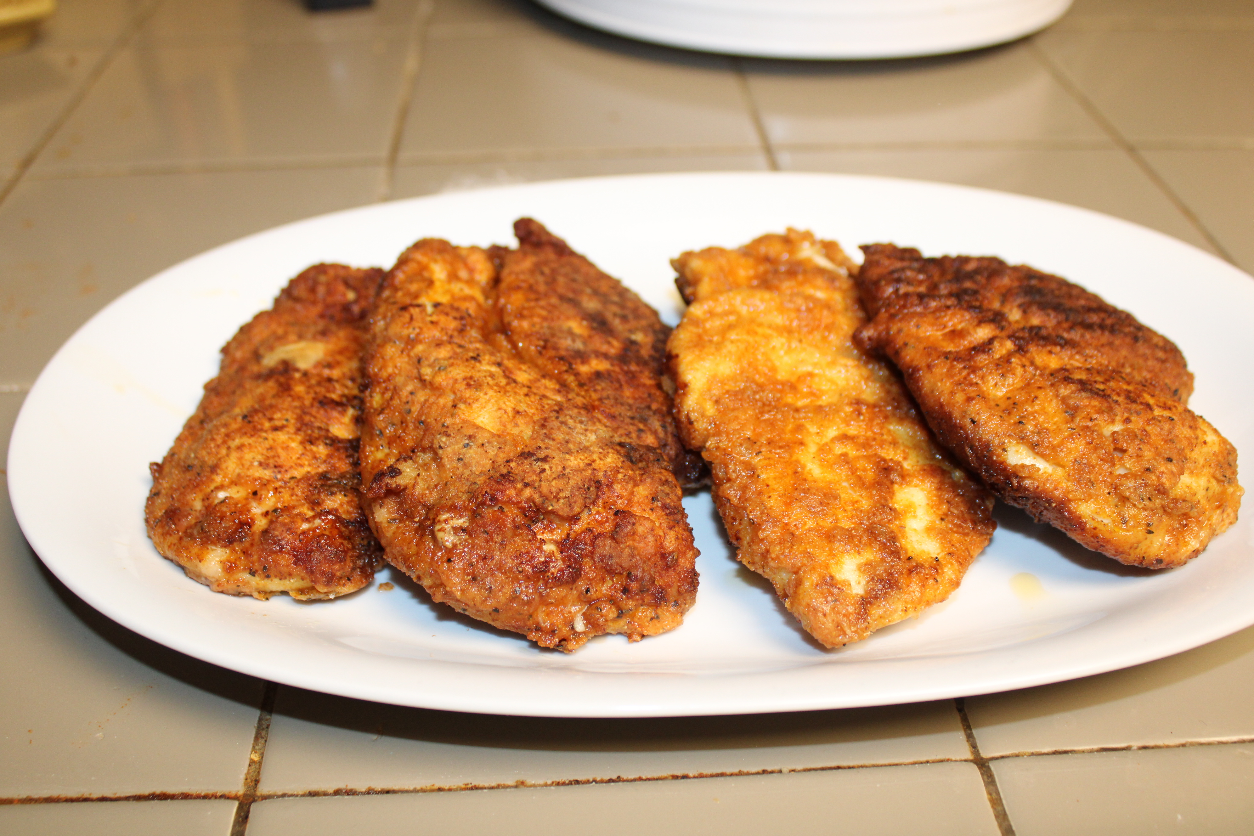 Fill a skillet with about a half in or so of oil. Heat oil over medium-high heat. Once hot enough to sizzle when hit with a drop of water, place chicken into the skillet to begin to fry. Immediately turn heat down to medium. Fry the chicken for about 3 minutes or so. Turn and continue to fry another 3 minutes.