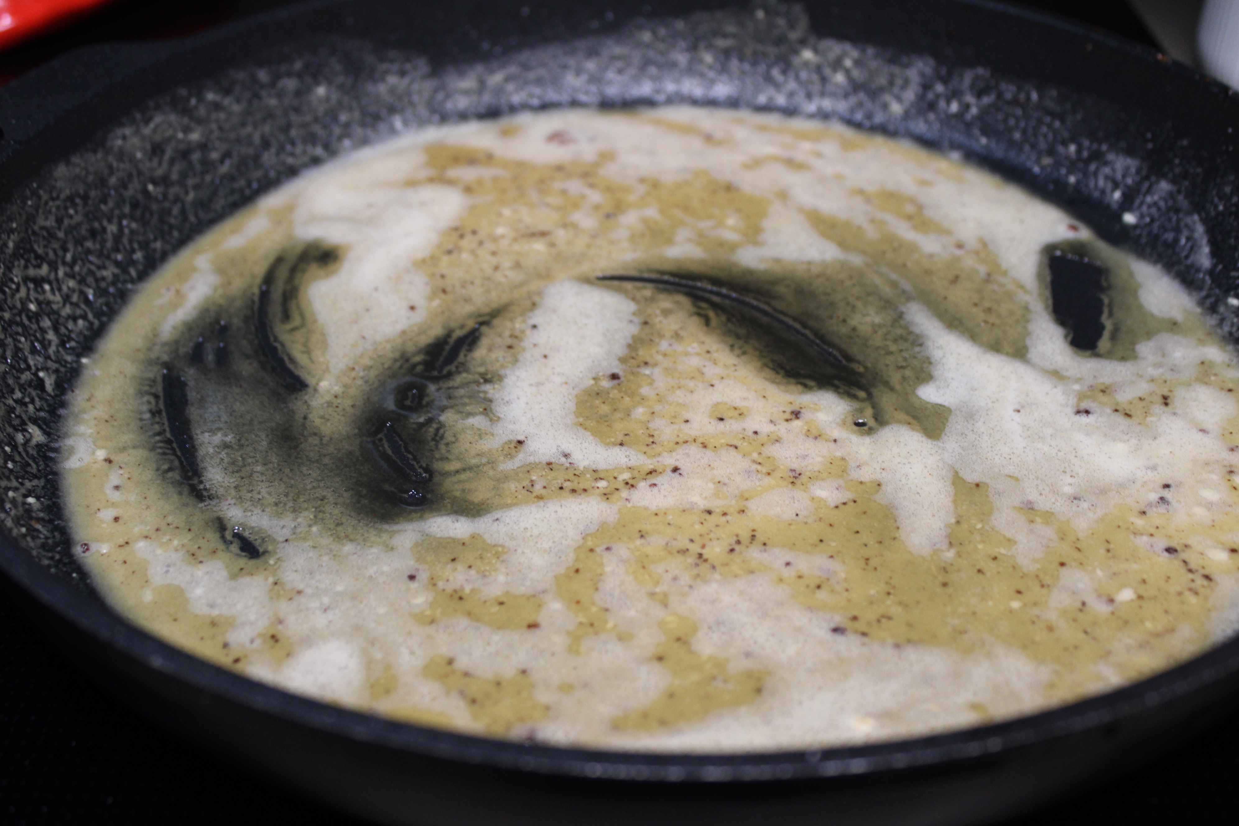 Drain off most of the bacon drippings, leaving about a tablespoon behind along with the browned bacon bits. Melt butter into the skillet. Stir in the flour to form a roux, cook for about 3 minutes until the roux is the color of coffee with cream.