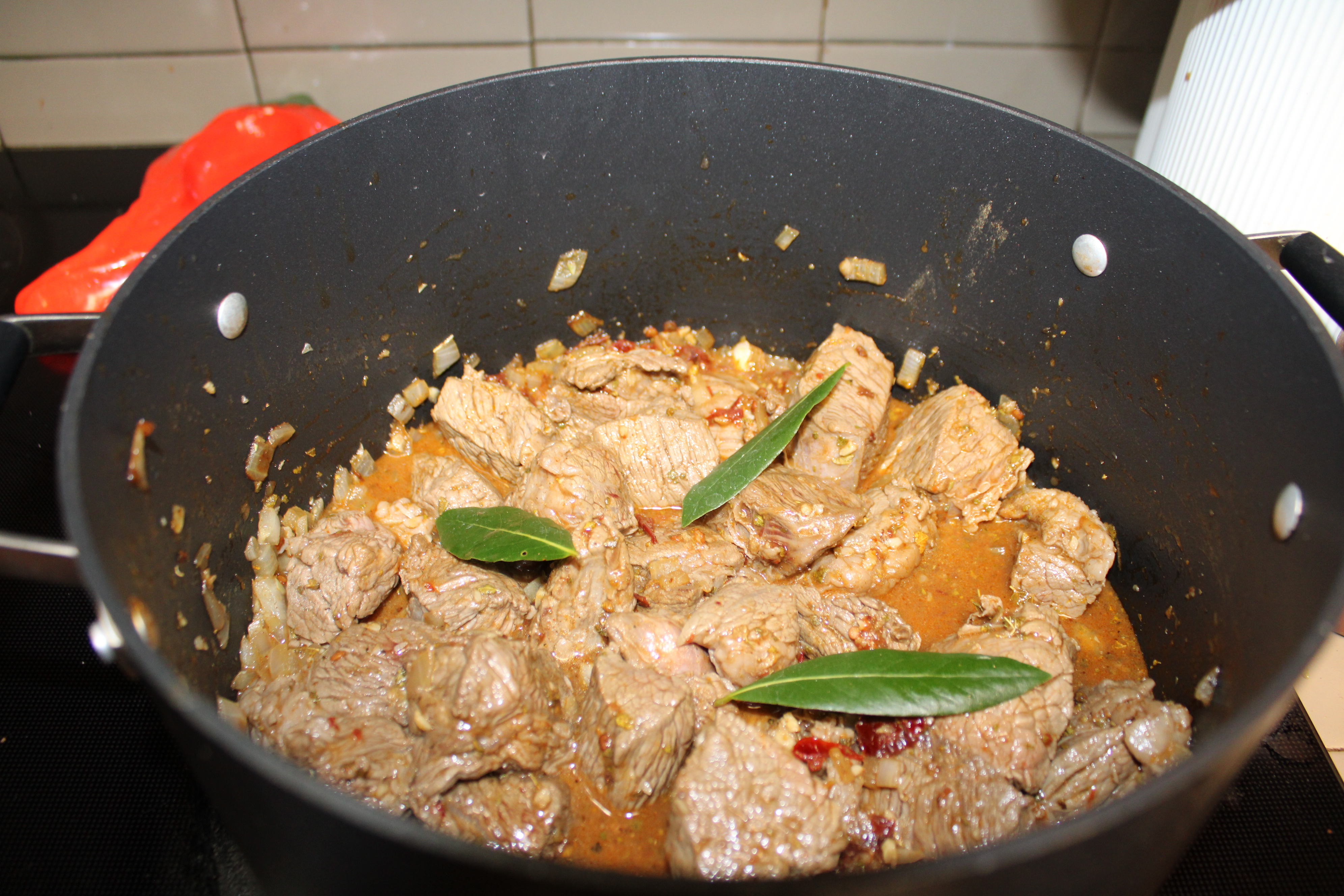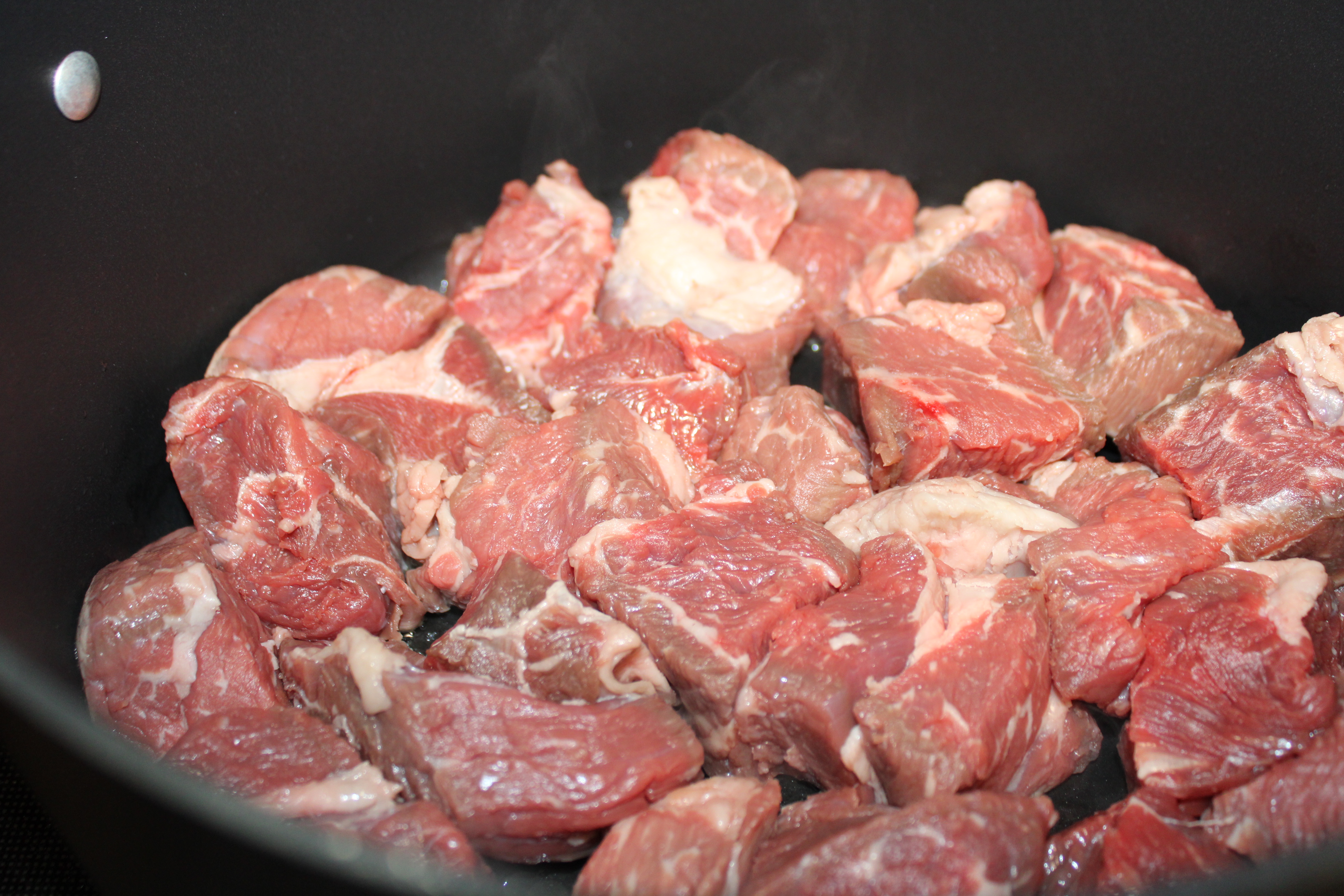 Melt lard in a large heavy bottomed pan over medium-high heat. Add beef chunks, sear until brown on all sides. Remove meat with a large slotted spoon, set aside.