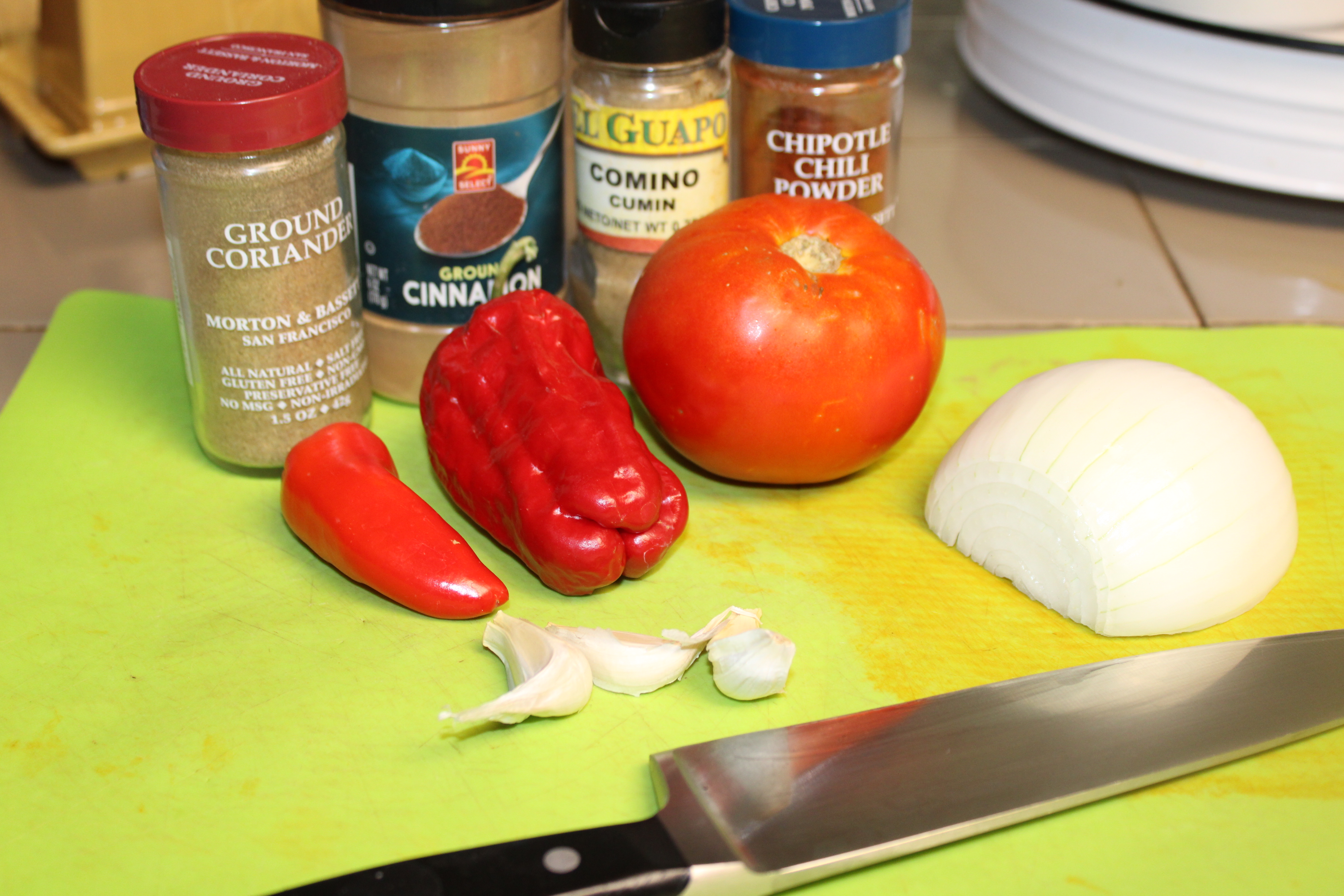 Cut onion in half from root to tip. Reserve half for another purpose (such as the Pinto Beans) peel and dice remaining half. Peel and mince garlic. Chop all the Chipotle Chilies, reserving the Adobo Sauce. Cut limes in half, squeeze out juice. Set aside.