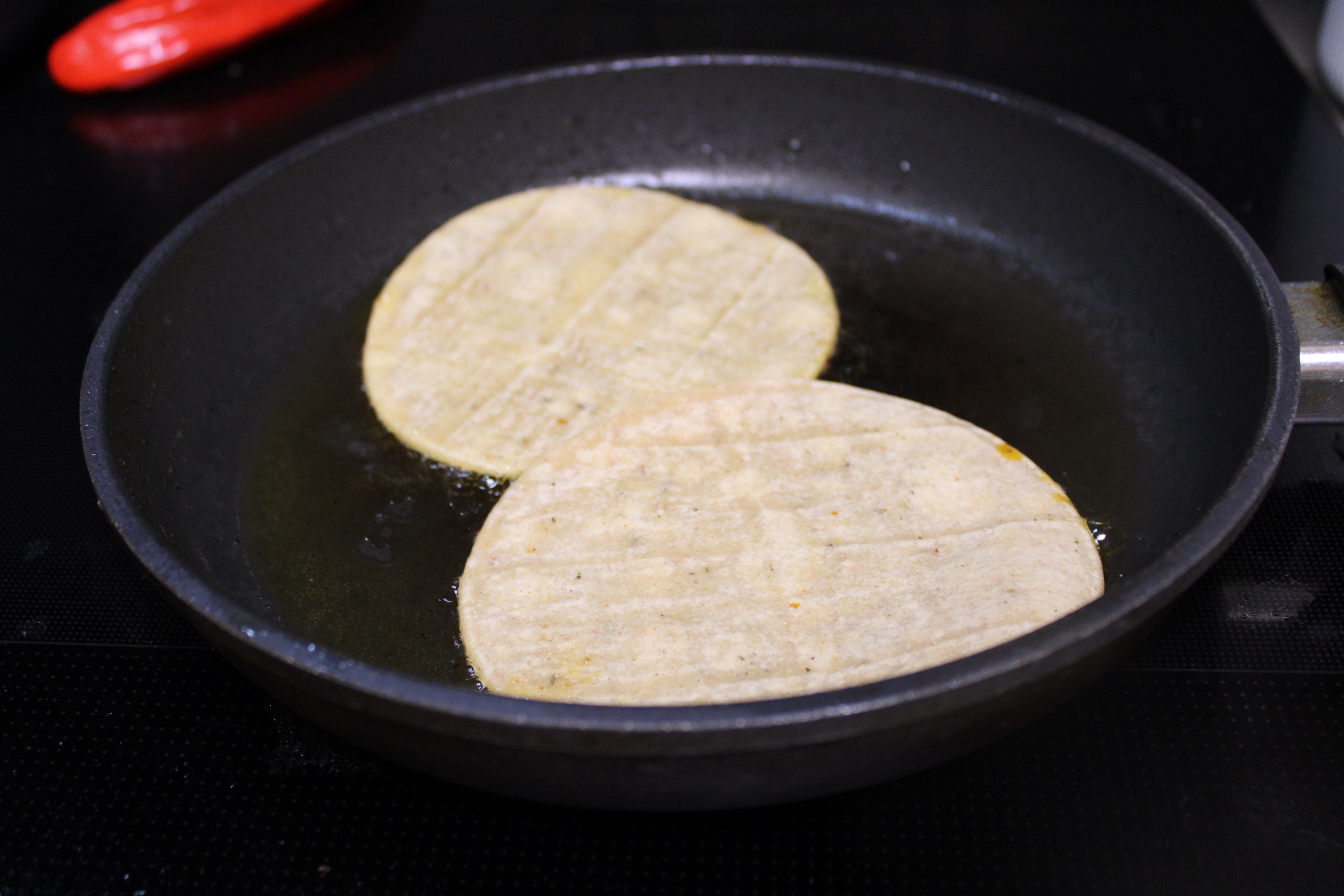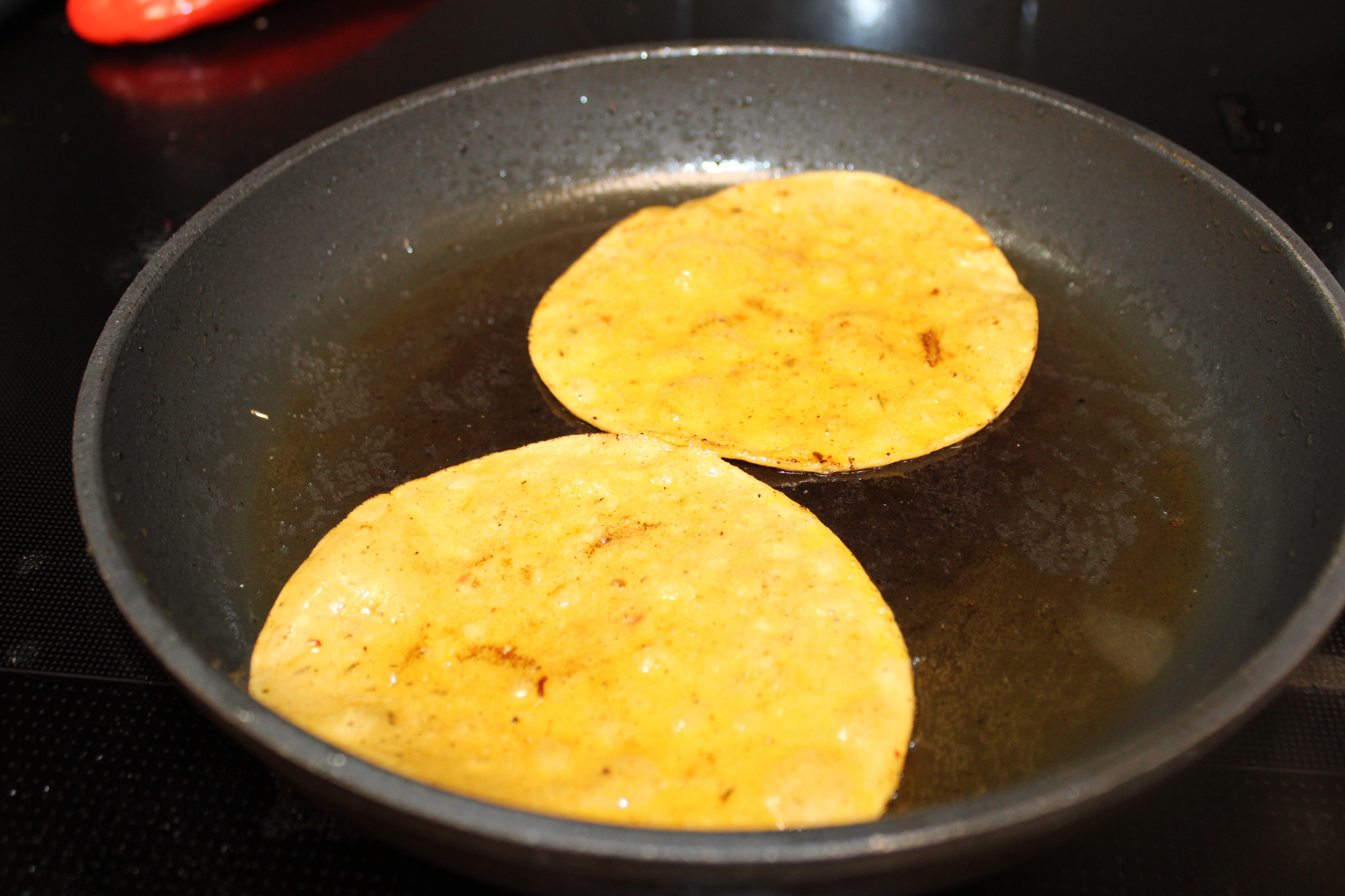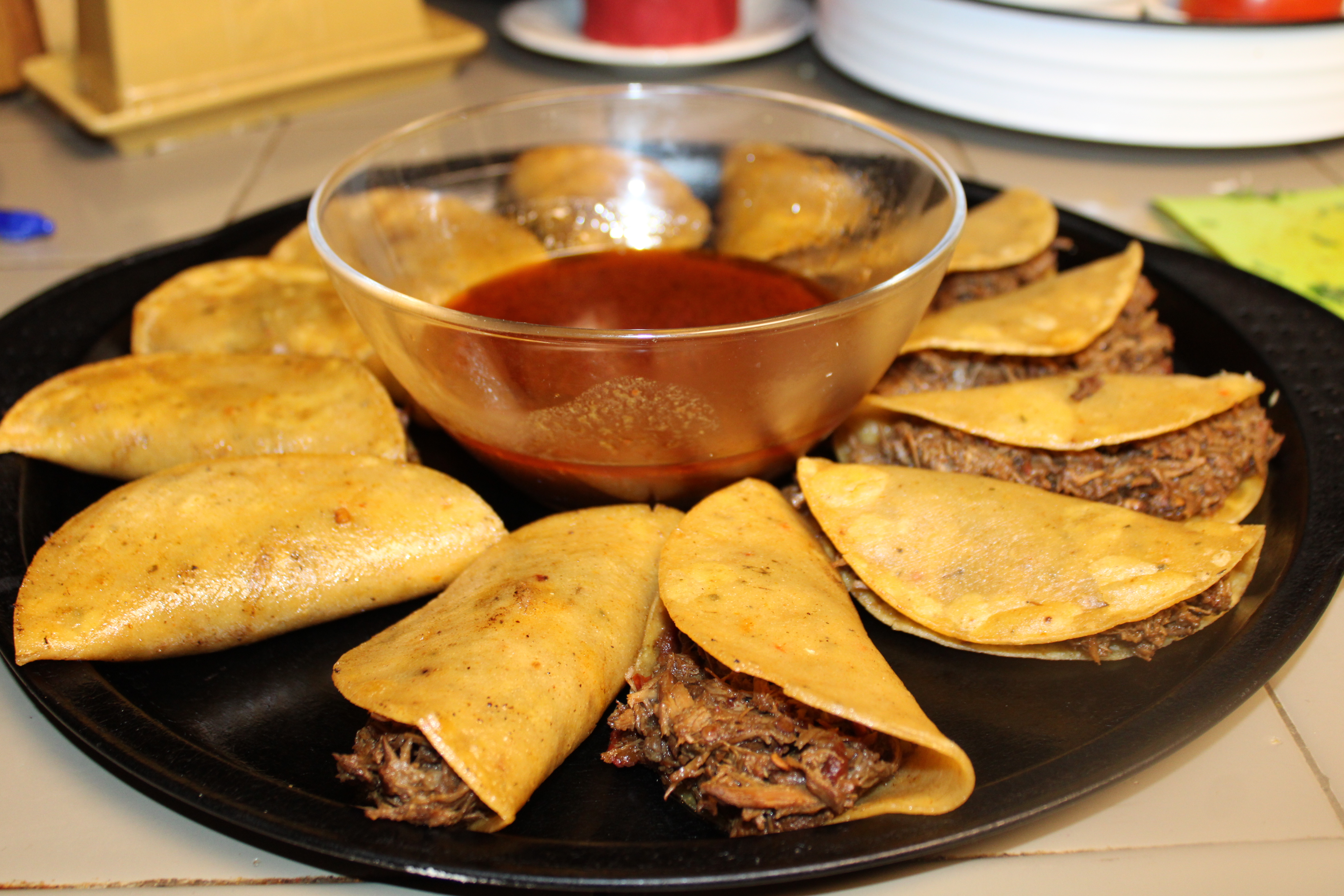 Lightly oil a tortilla pan with a little lard. Brush tortillas lightly with a bit of the cooking liquid. Quickly fry up the tortillas until lightly toasted while still soft. Fill tortillas with shredded beef. Arrange on a round oven-proof baking dish. Place in the oven under the broiler to heat through.