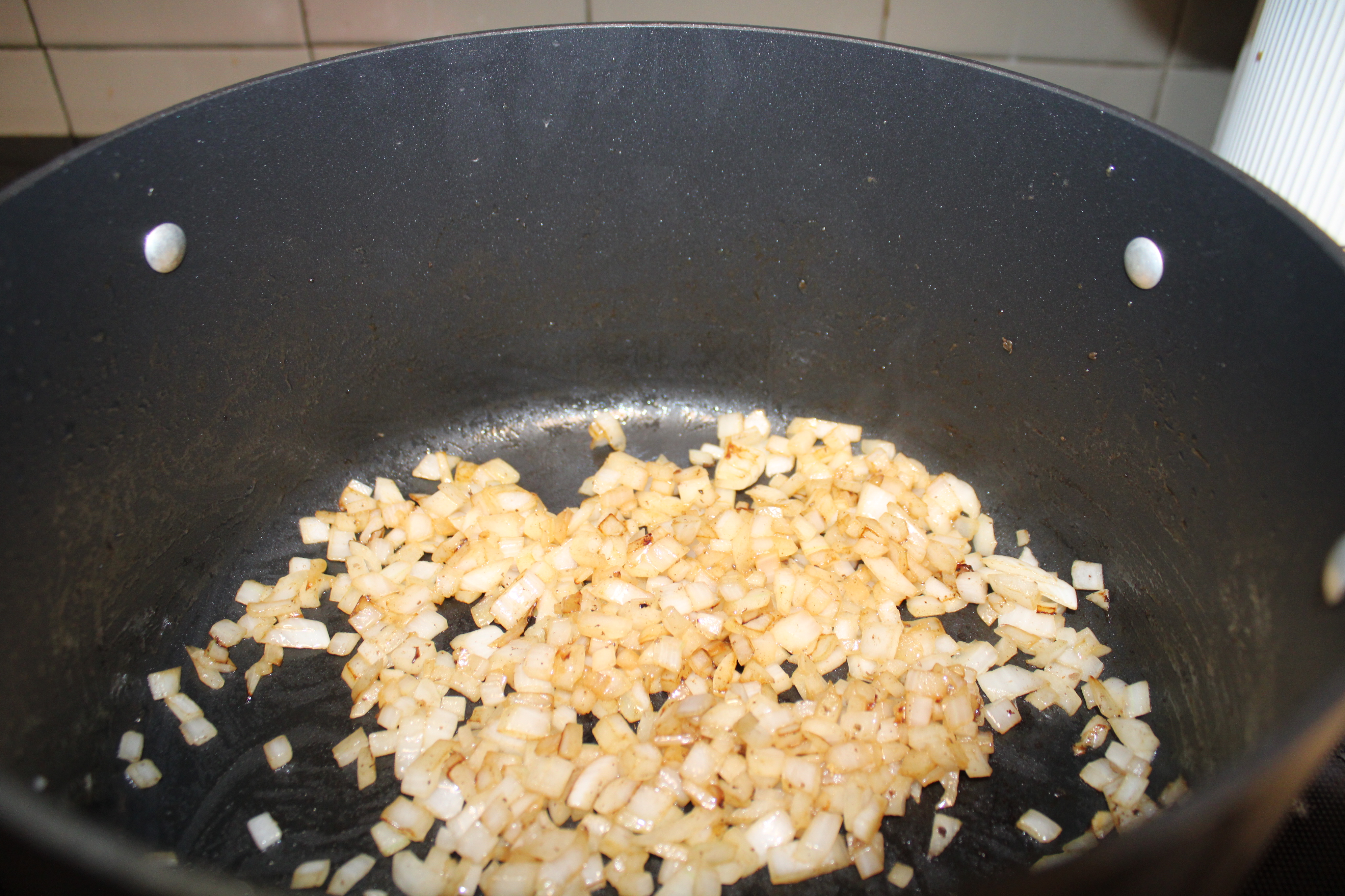 While the onion mixture cooks down, rinse and drain the pinto beans. Once the onions are tender, stir in the beans.
