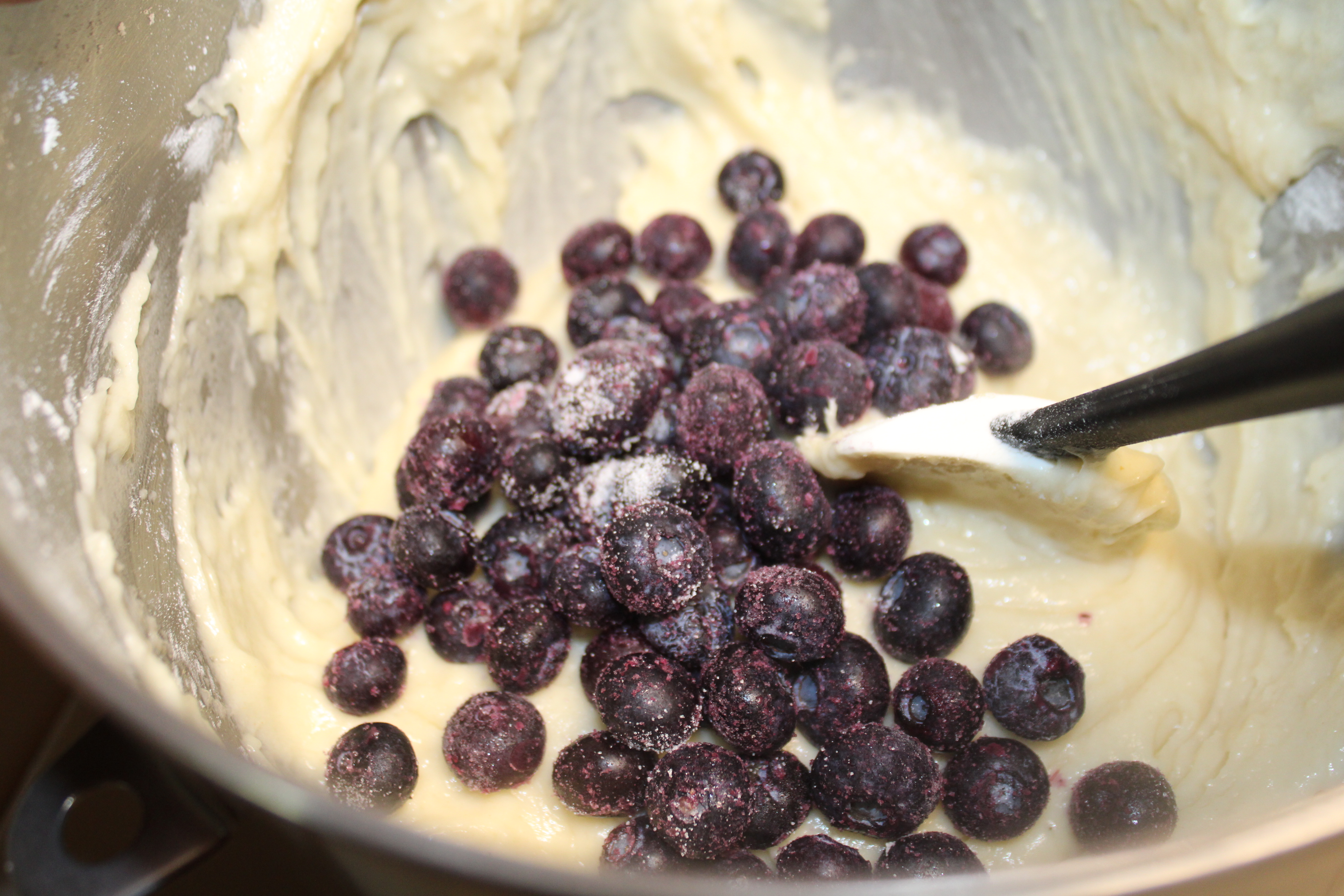 In a separate bowl stir together flour, salt and baking soda. Stir the dry ingredients into the wet ingredients alternating with sour cream. Gently fold in the blueberries.