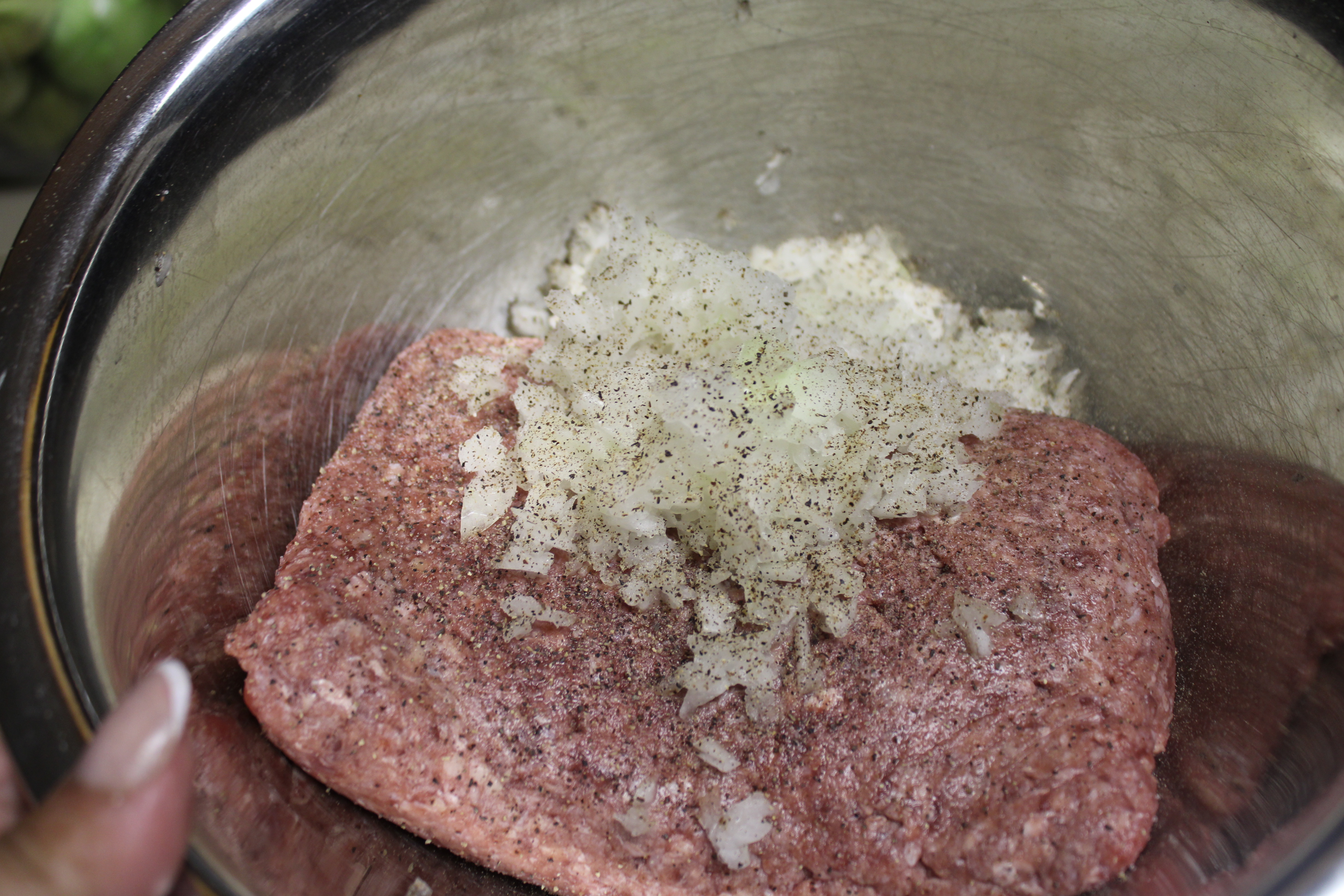 Place ground beef in a large mixing bowl. Top meat with the minced onion. Season with salt and pepper. Mix together until well-blended. Form mixture into three patties. Set aside.