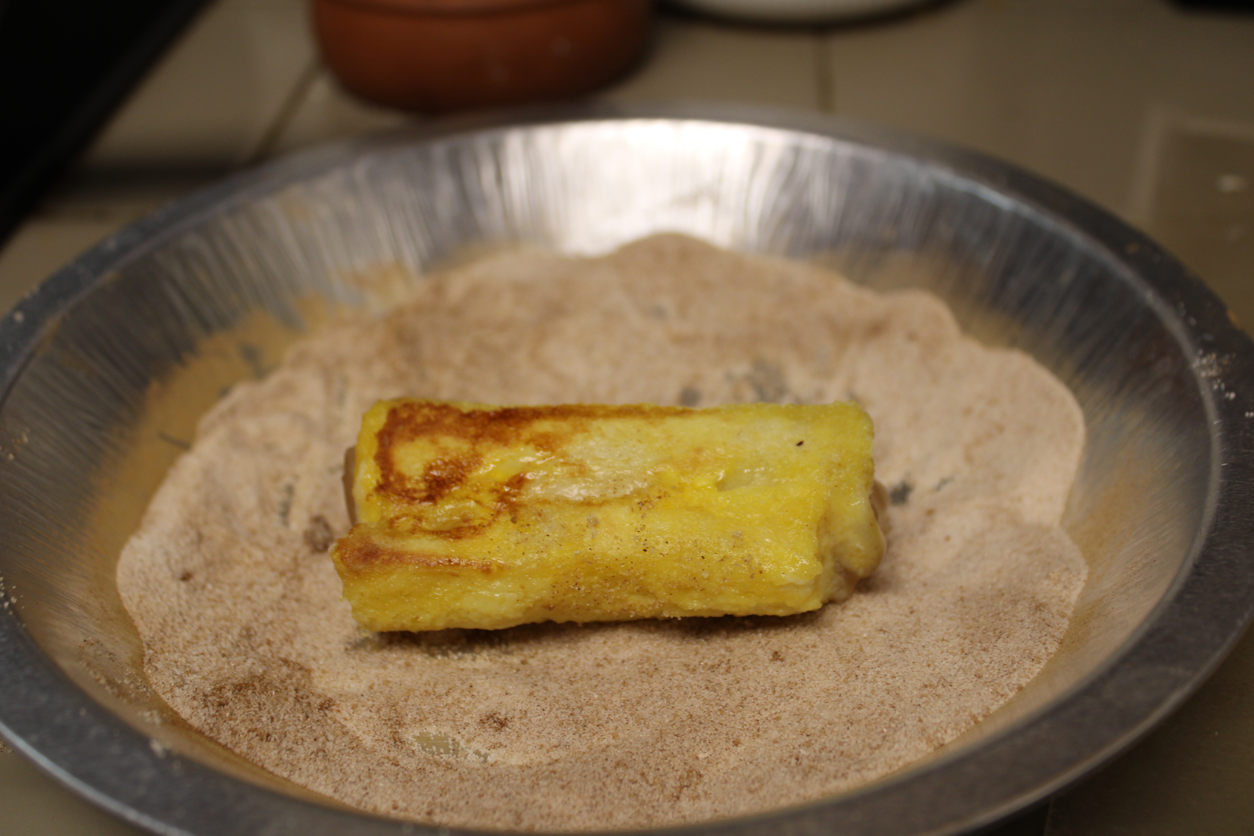 Let the cream cheese soften at room temperature. While the cream cheese softens, combine the sugar with the cinnamon in a pie tin and set aside. In a second pie tin lightly beat eggs with milk.