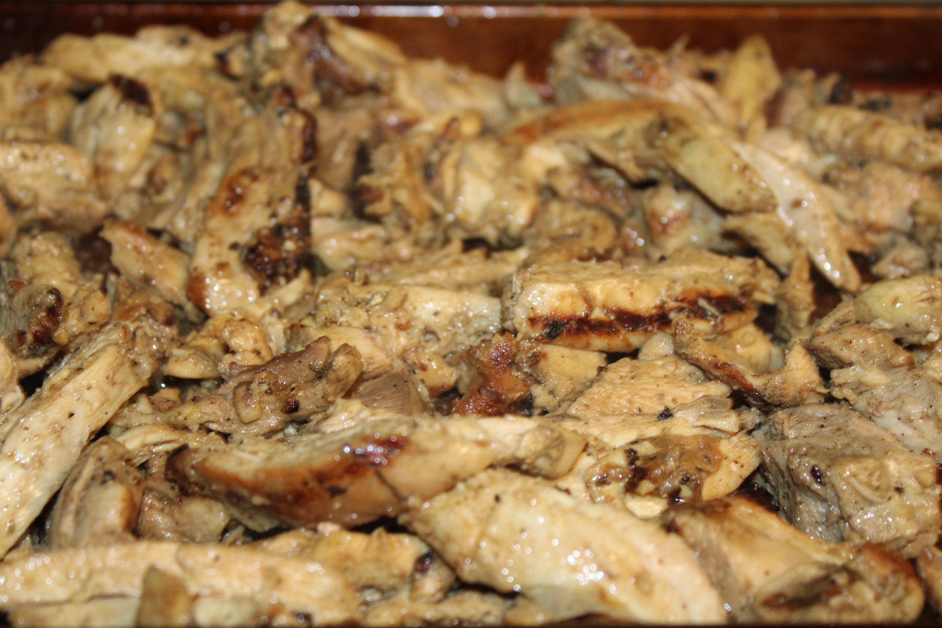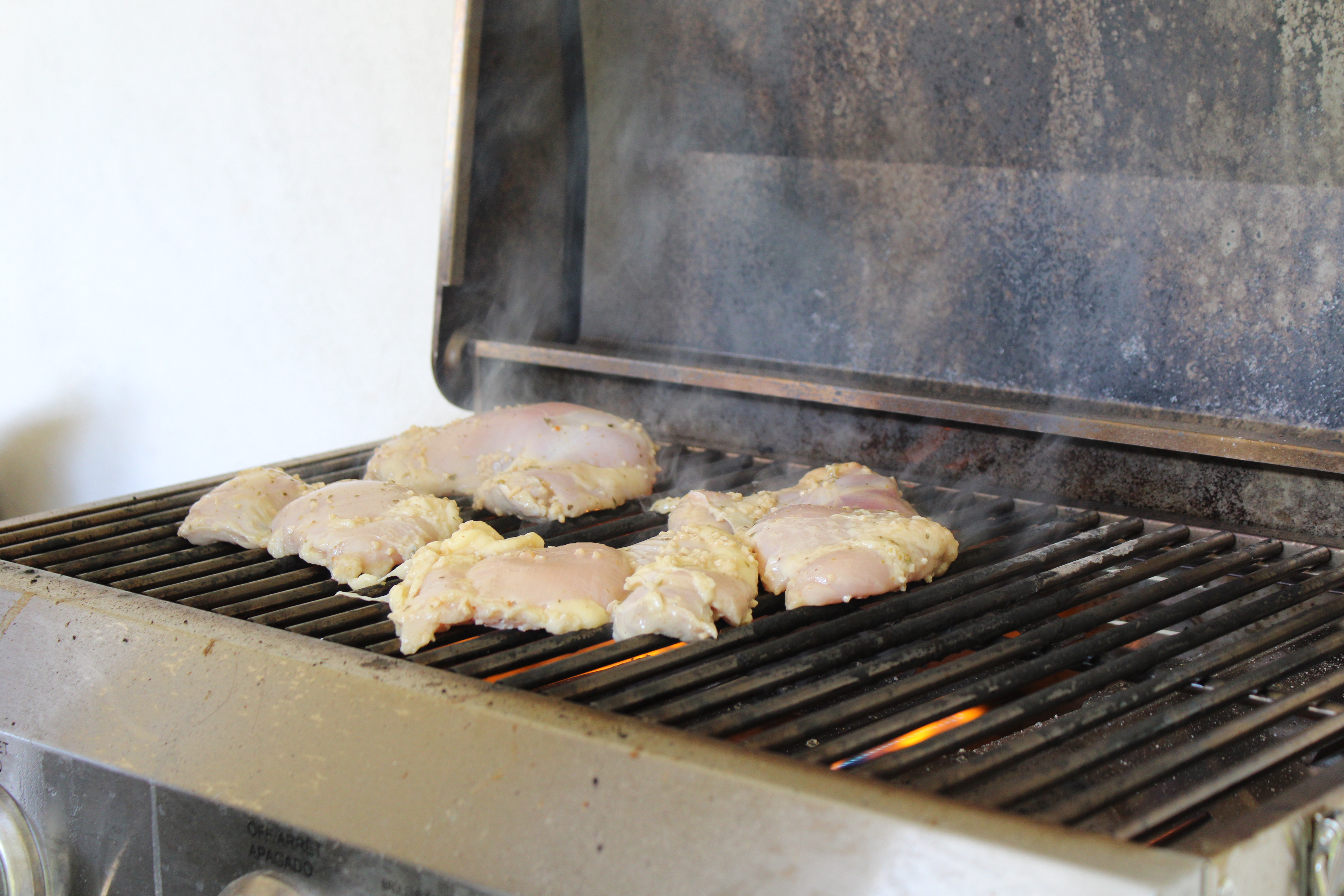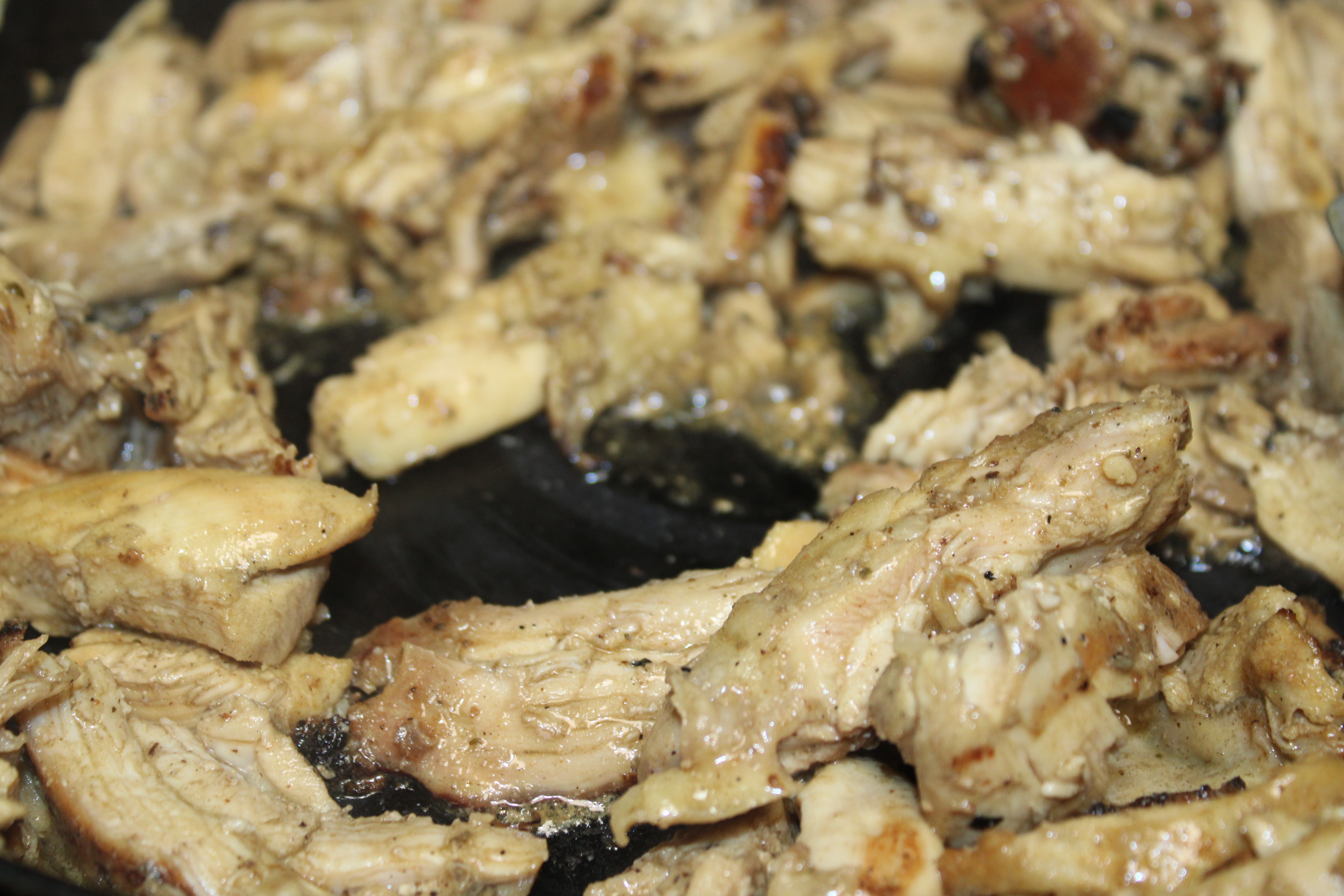 Heat a grill to medium heat. Sear the chicken thighs for about 2 minutes per side for that grilled flavor. Transfer to a cast iron skillet, let thighs continue to cook about 5 minutes per side. Slice into strips, return to skillet (including any drippings) and heat through.