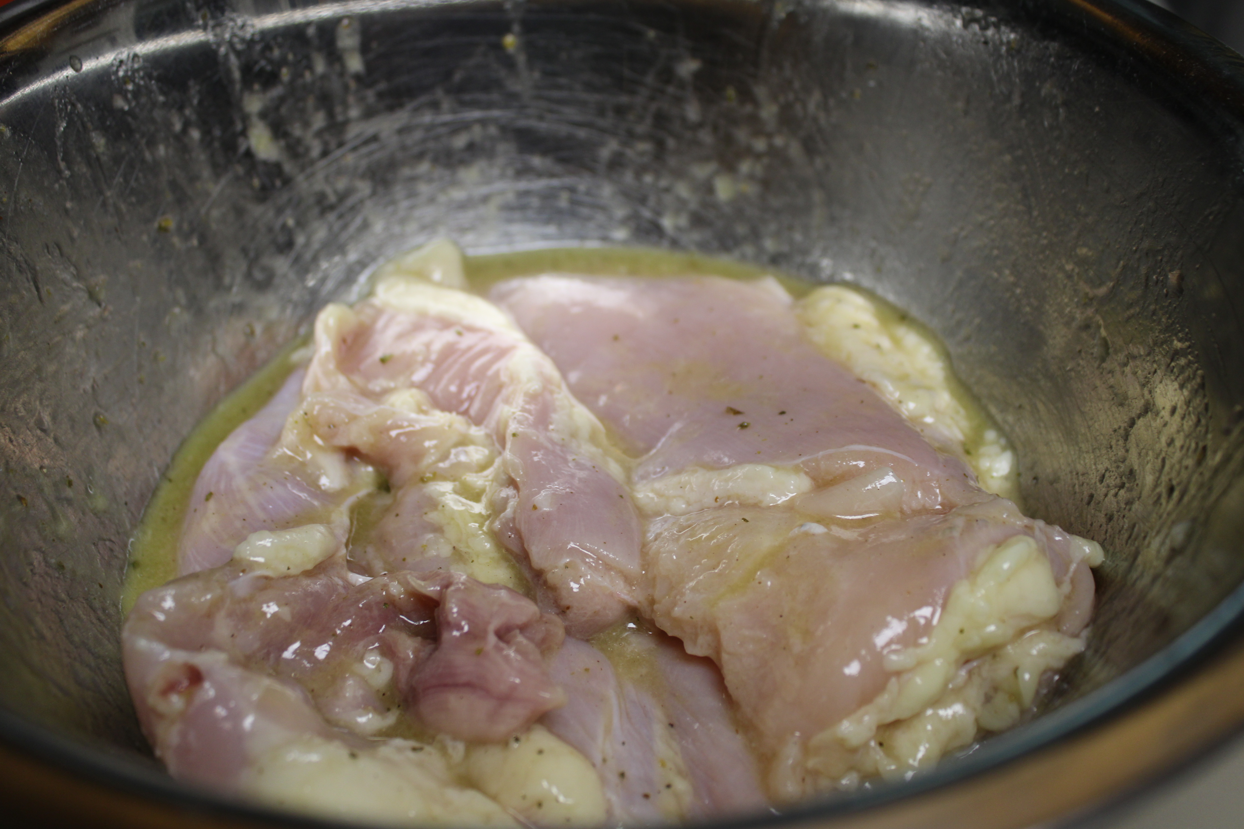 In a bowl combine olive oil, lemon juice, minced garlic, dried oregano, salt and pepper. Whisk to blend. Add the chicken thighs, turning several times to coat. Cover, refrigerate and let marinate for at least 30 minutes or longer. Remember; the longer it marinates, the deeper the flavors.