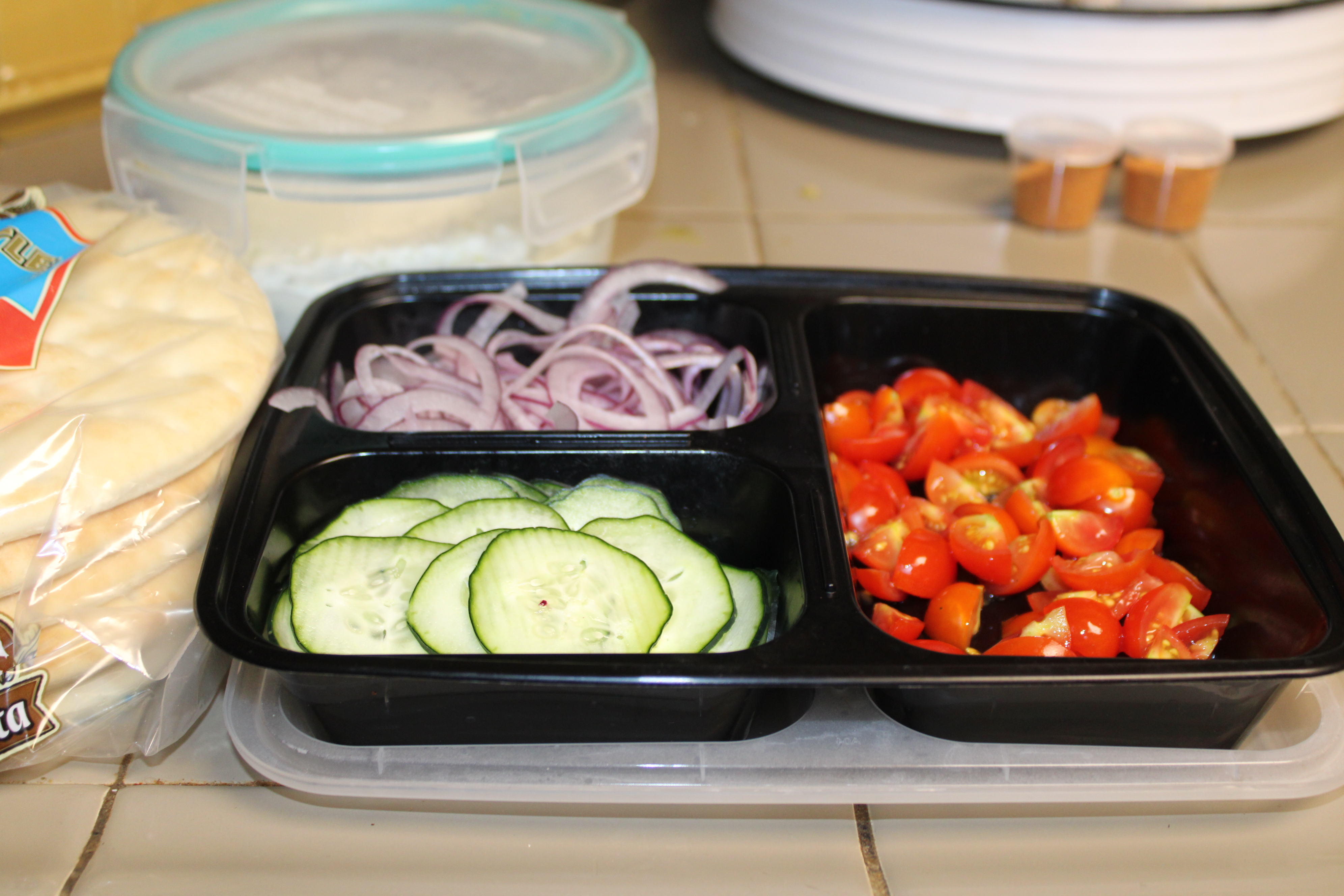 Wrap pita bread in foil. Heat oven to 300 degrees. Warm bread, keep warm until ready to assemble.