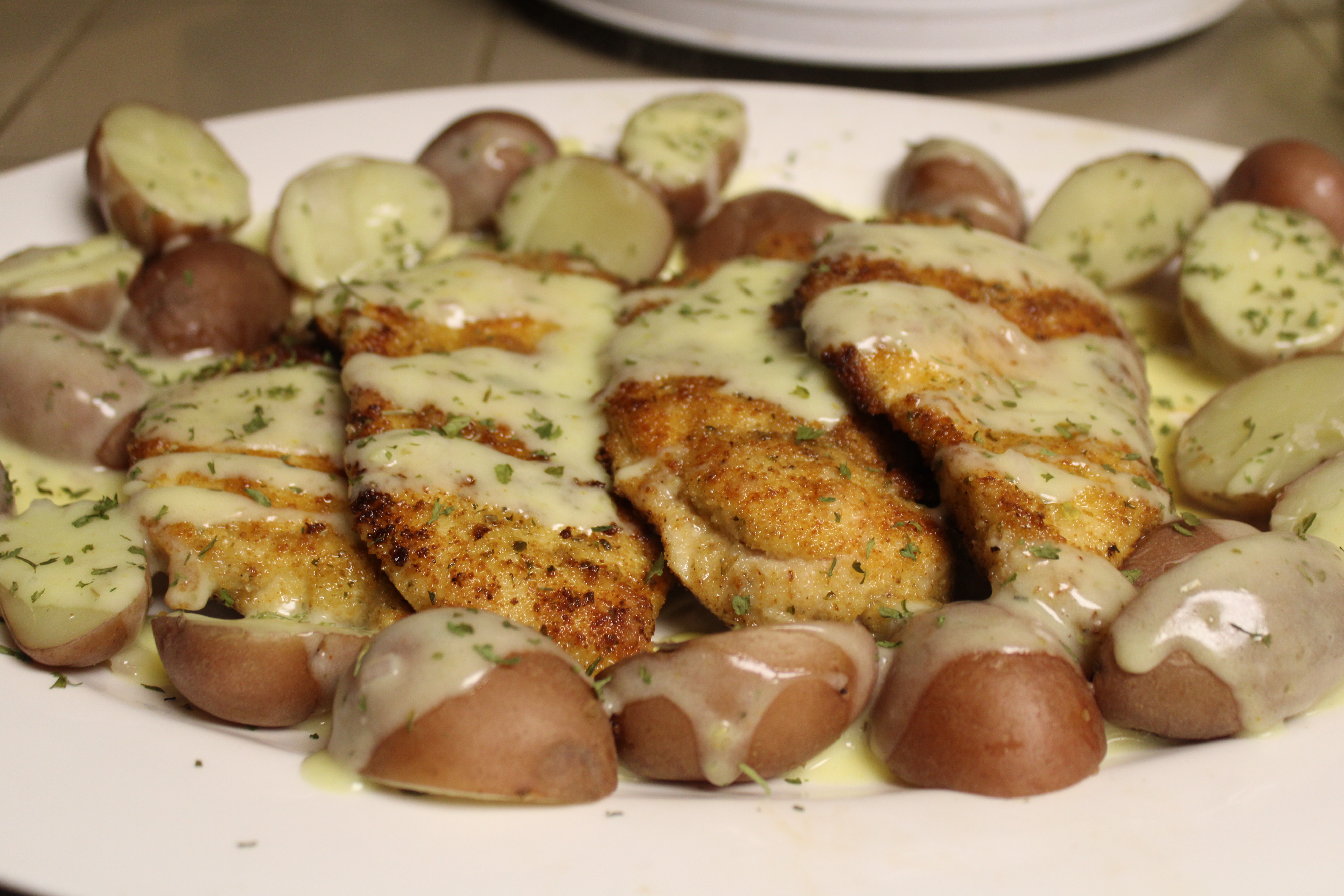 Arrange chicken fillets on a large serving platter. Surround chicken with new potatoes. Drizzle Béarnaise Sauce over the chicken as well as the potatoes.