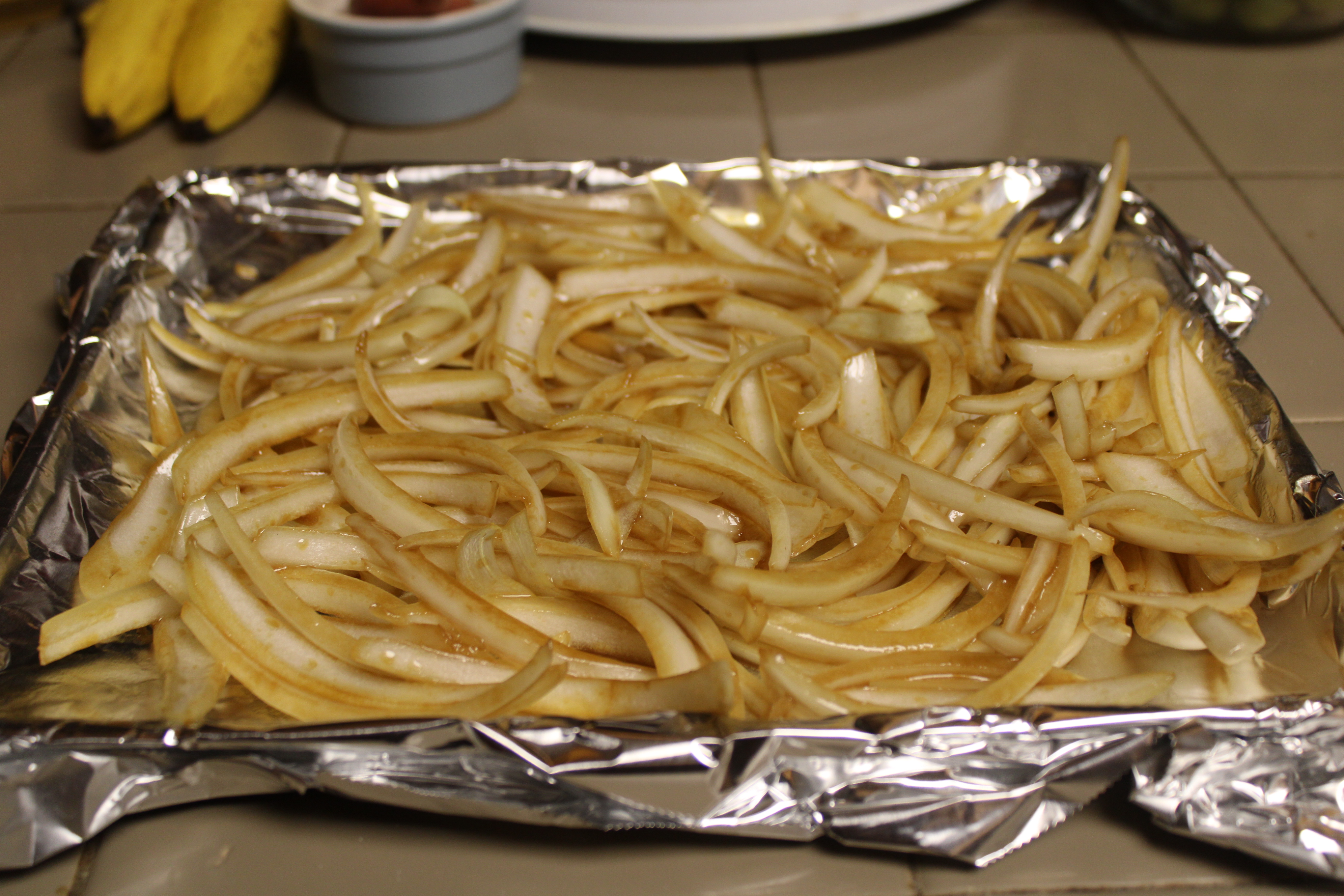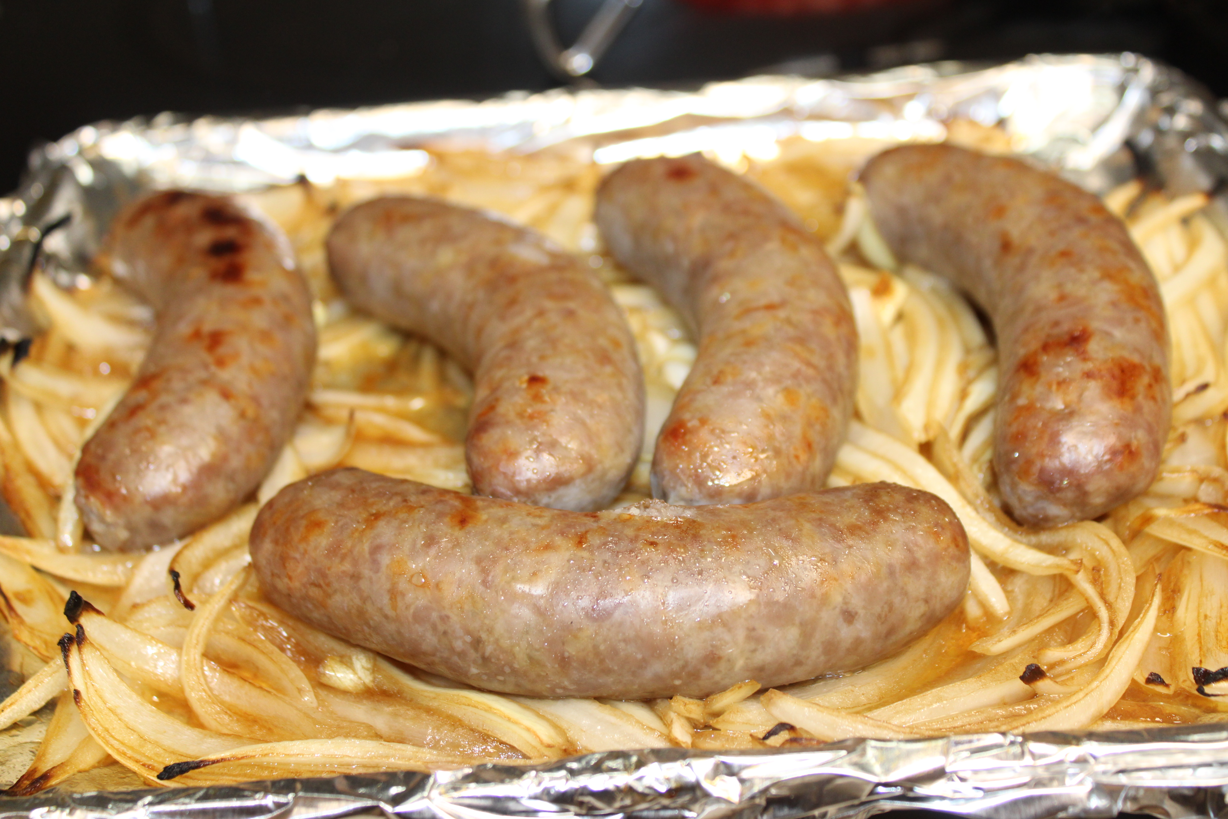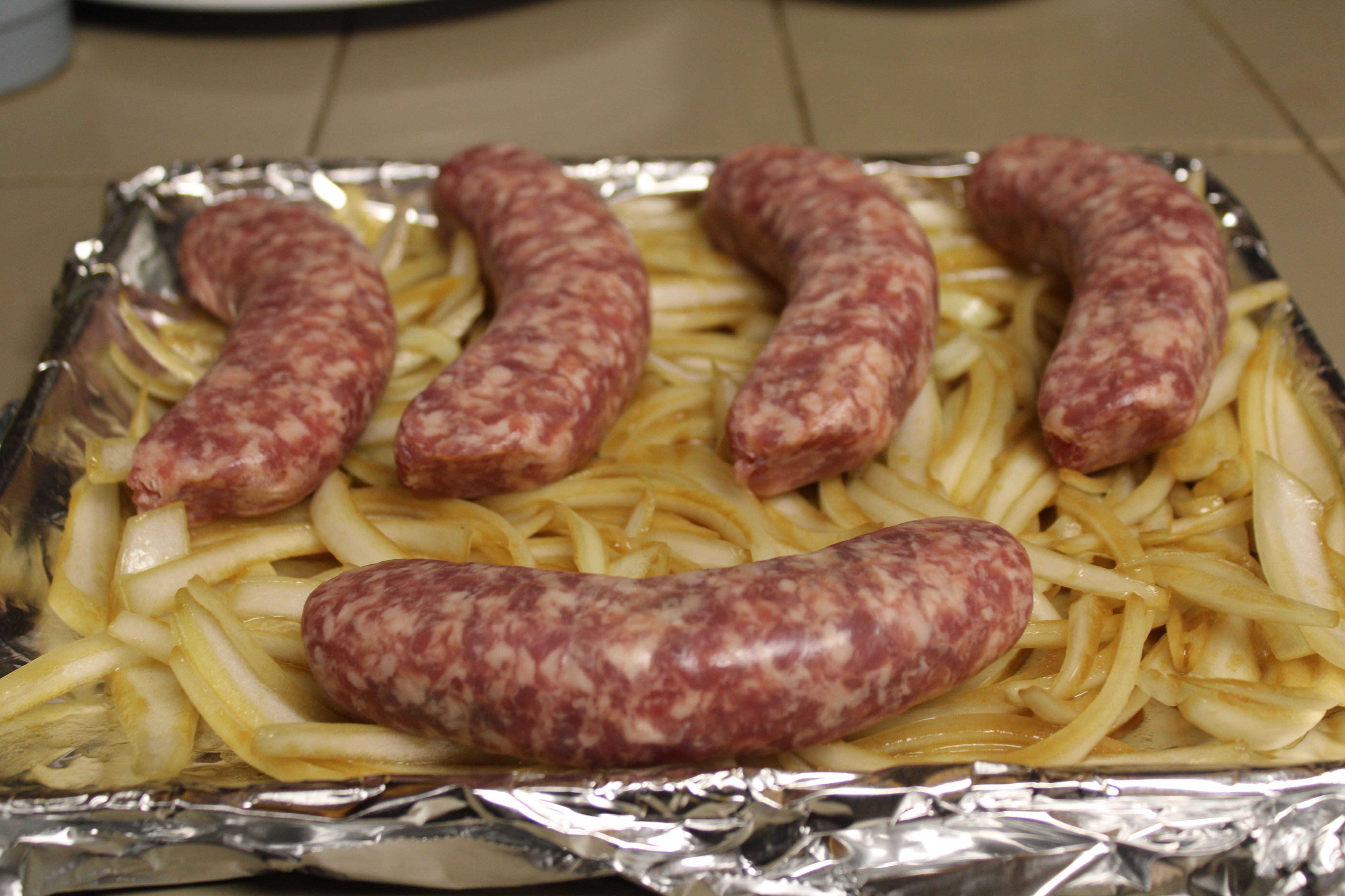 Peel onions, cut in half from root to tip. Slice into half-moon slivers. Toss onions with some olive oil, a splash of hickory balsamic vinegar (for flavor and color) along with a pinch of salt. Spread onions out over the entire pan. Lay bratwurst sausage right on top of the bed of onions.