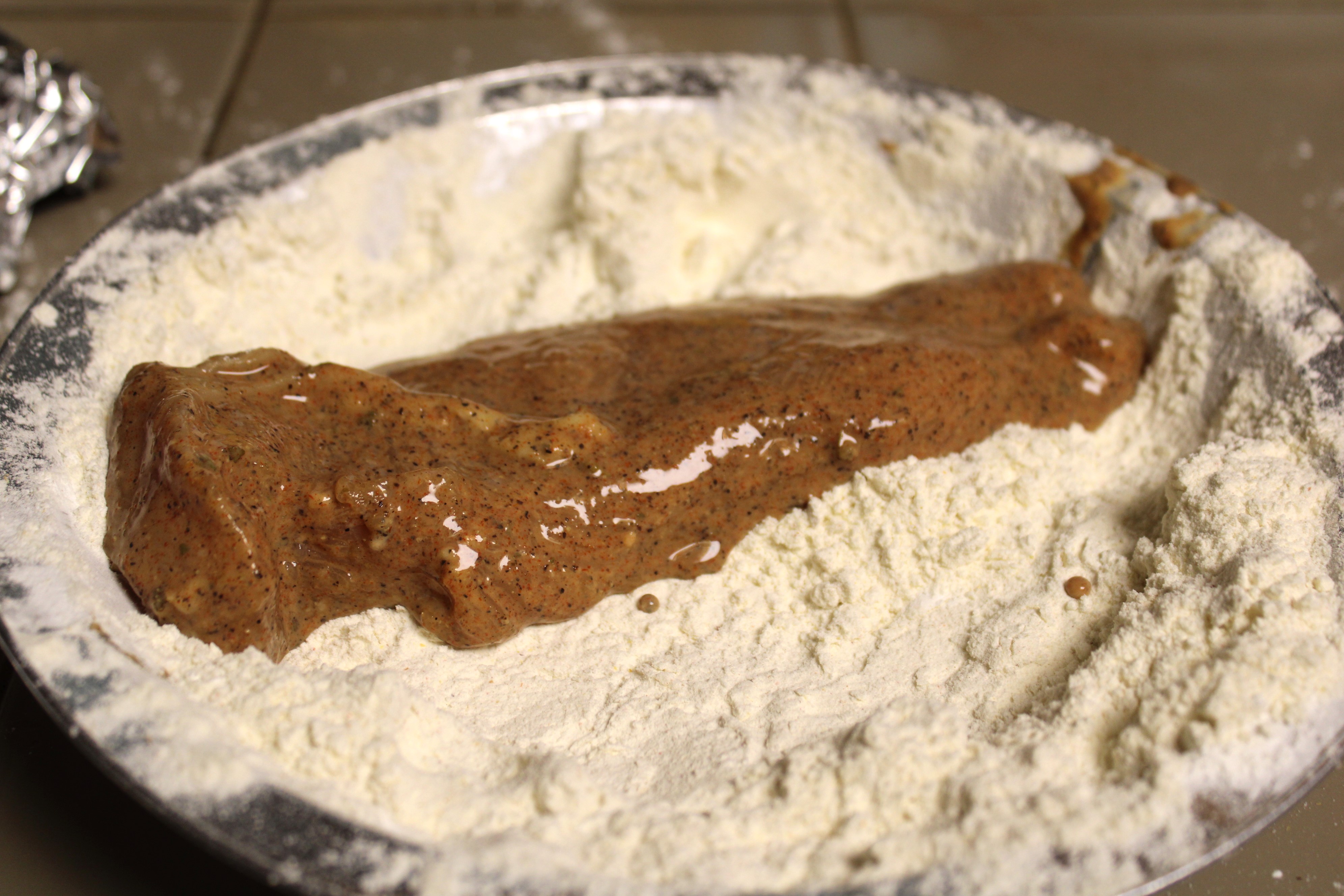 Remove chicken from the marinade, allowing the buttermilk to drip back into the bag. Dredge each breast cutlet in the flour mixture, then place on a wire rack for the coating to adhere.