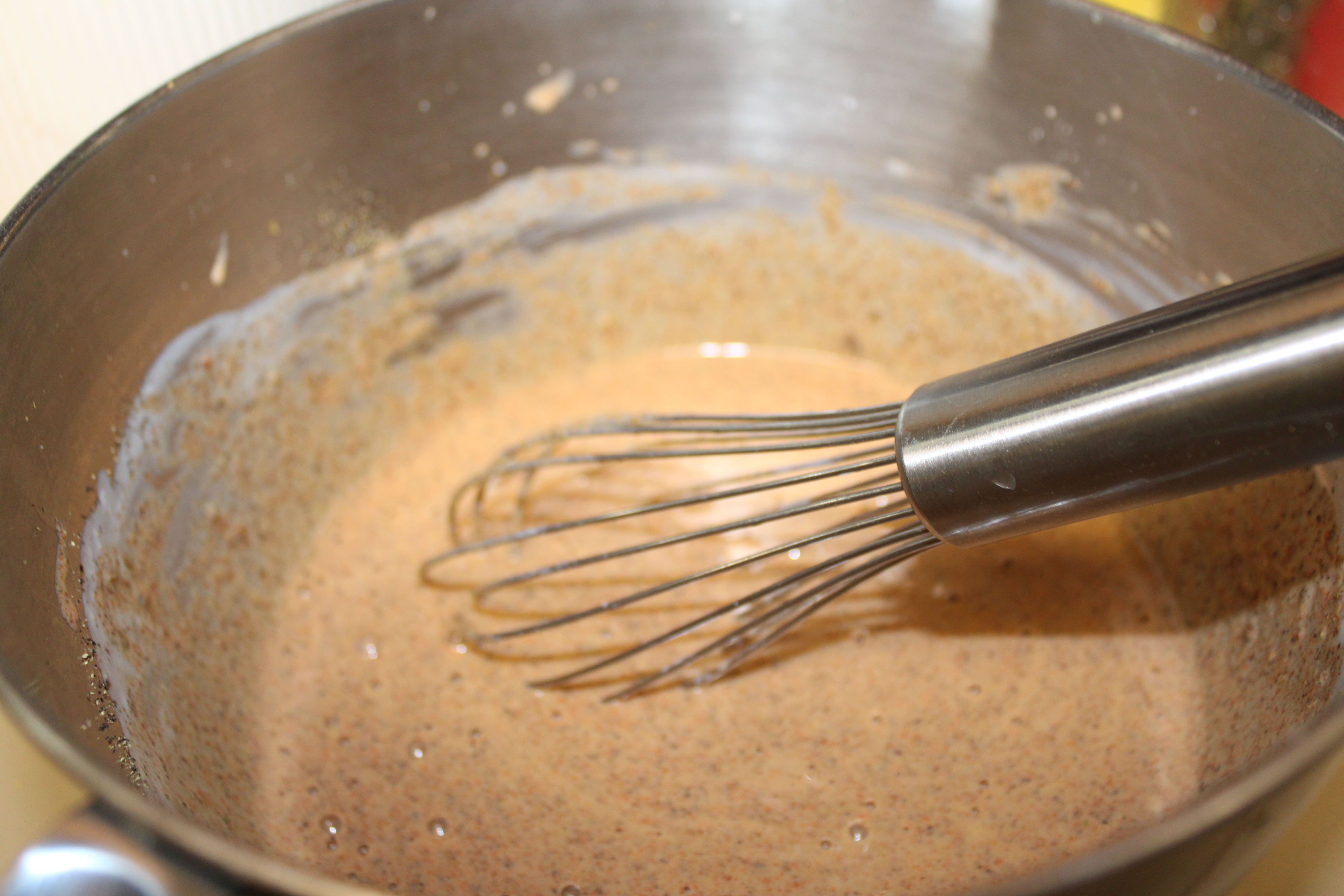 Slowly whisk in the milk, then cream and finally the chicken stock. Whisking constantly, simmer unit the mixture has reached a gravy consistency. Adjust seasonings with salt and pepper to taste.