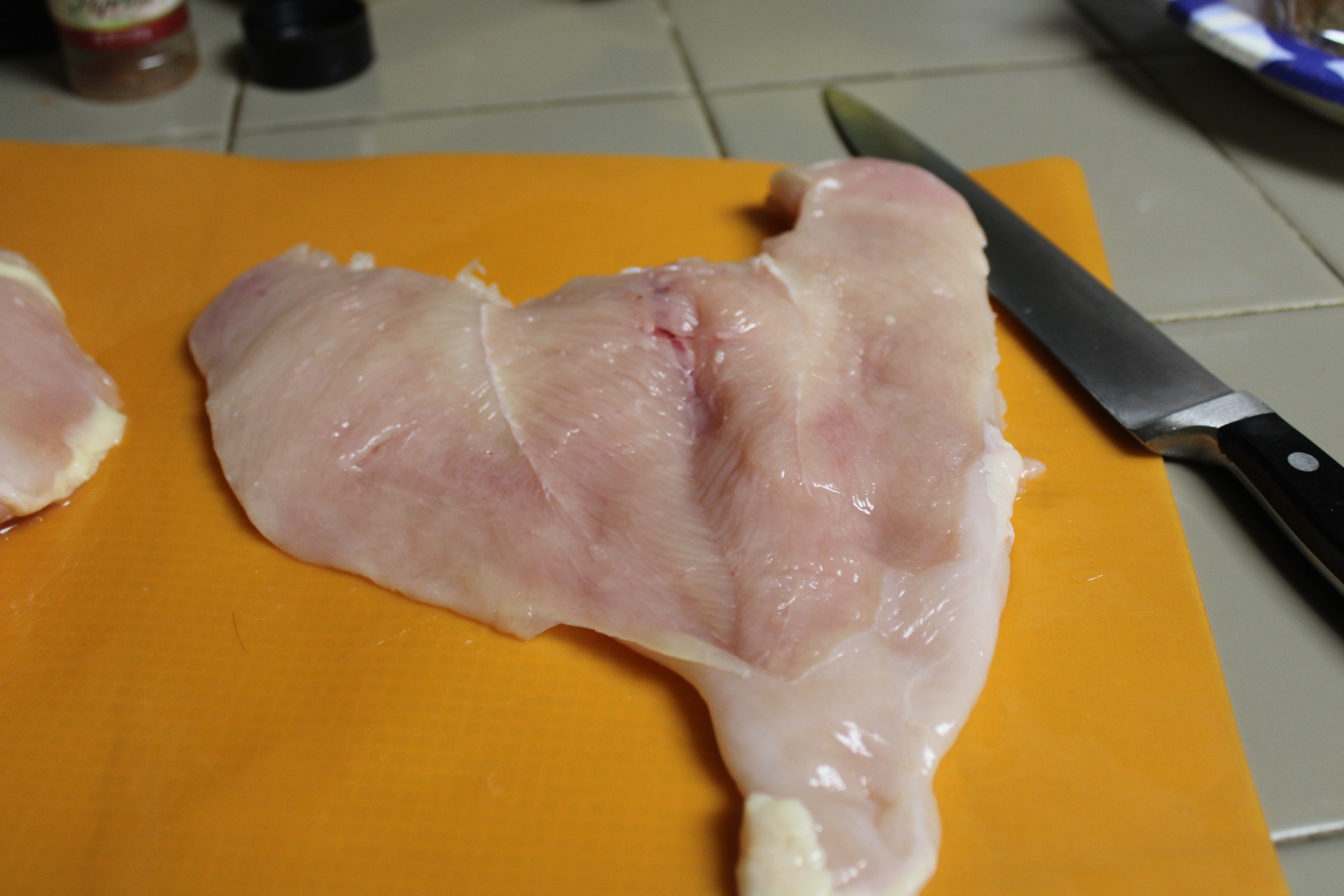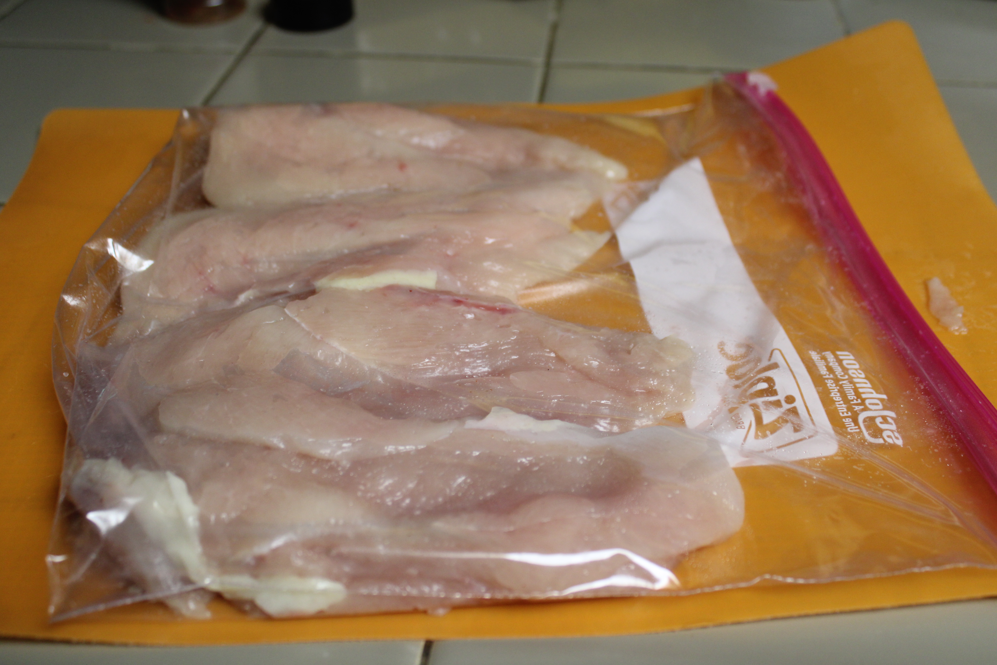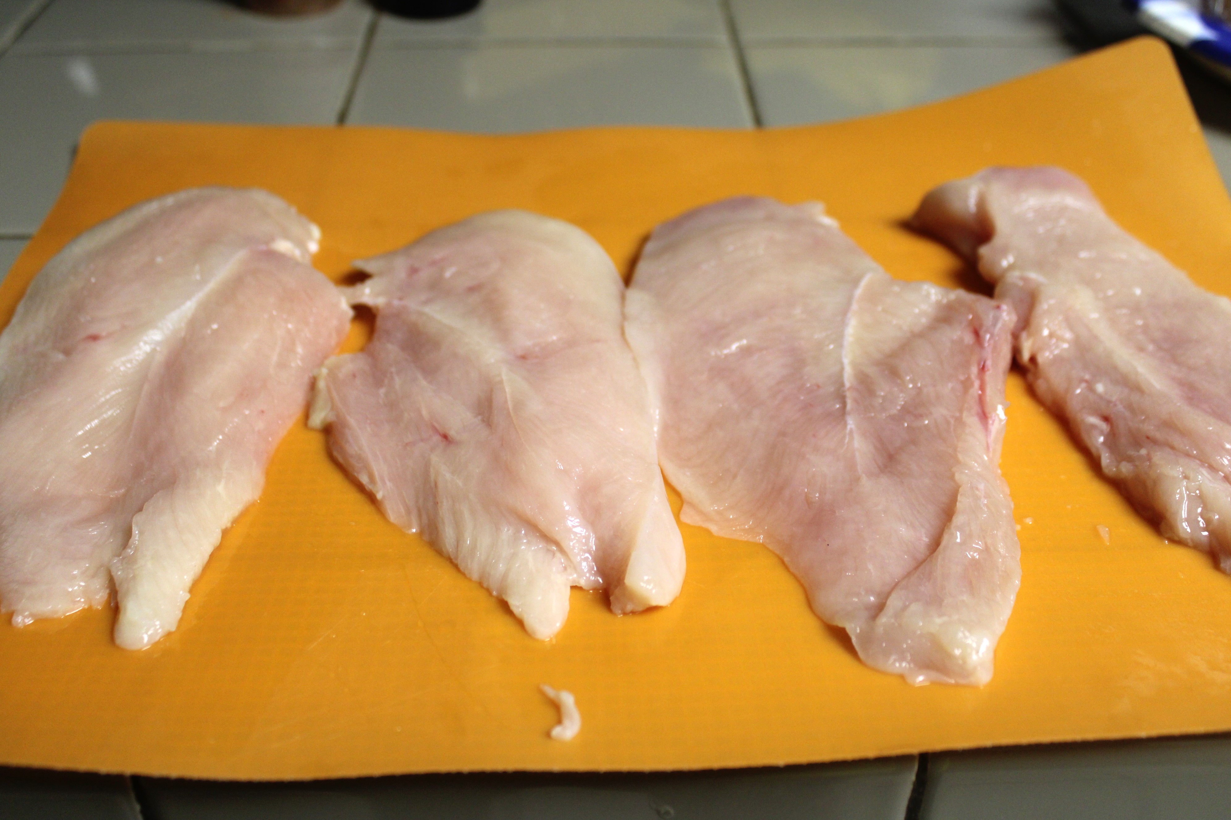 Butterfly breast, then cut each in half to create 4 thinner cutlets. Place the chicken in a gallon zip-lock bag, set aside.