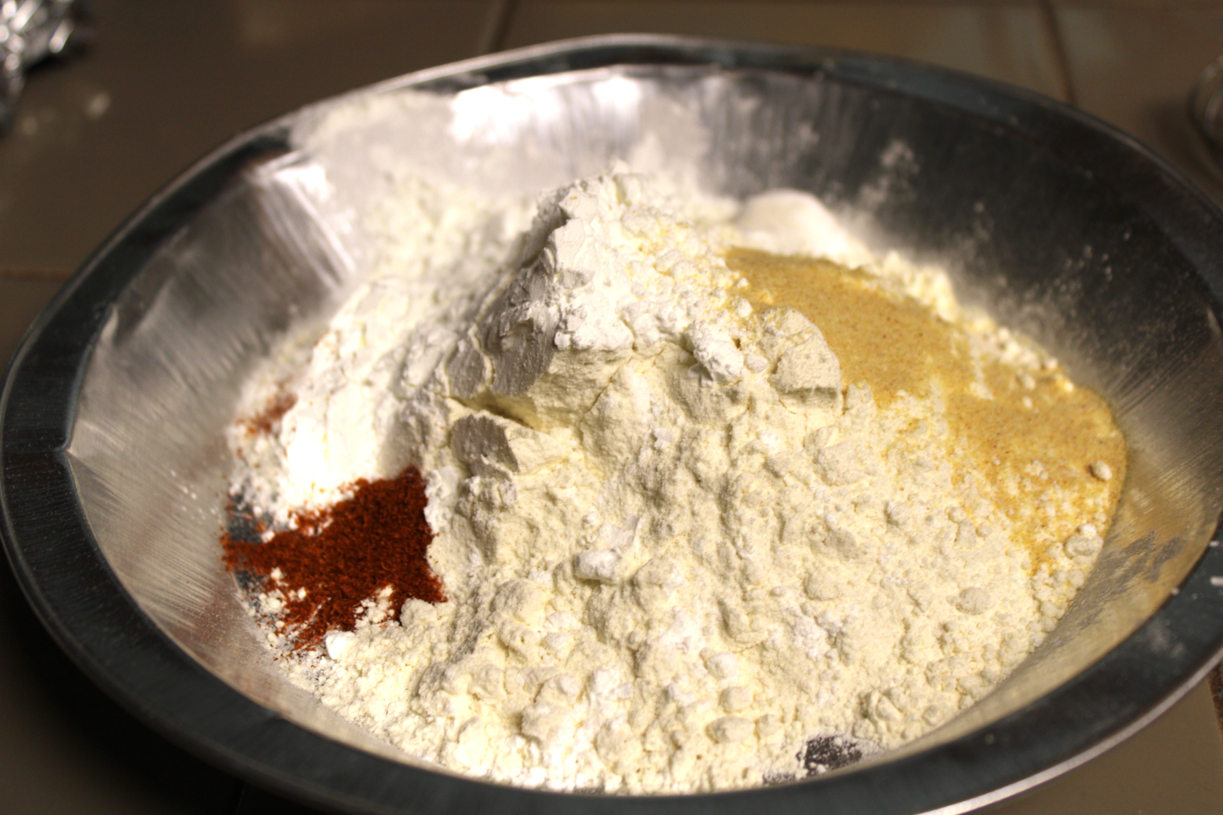In a shallow bowl or pie tin whisk the flour with cornstarch, baking powder, garlic powder and cayenne pepper. Set aside.