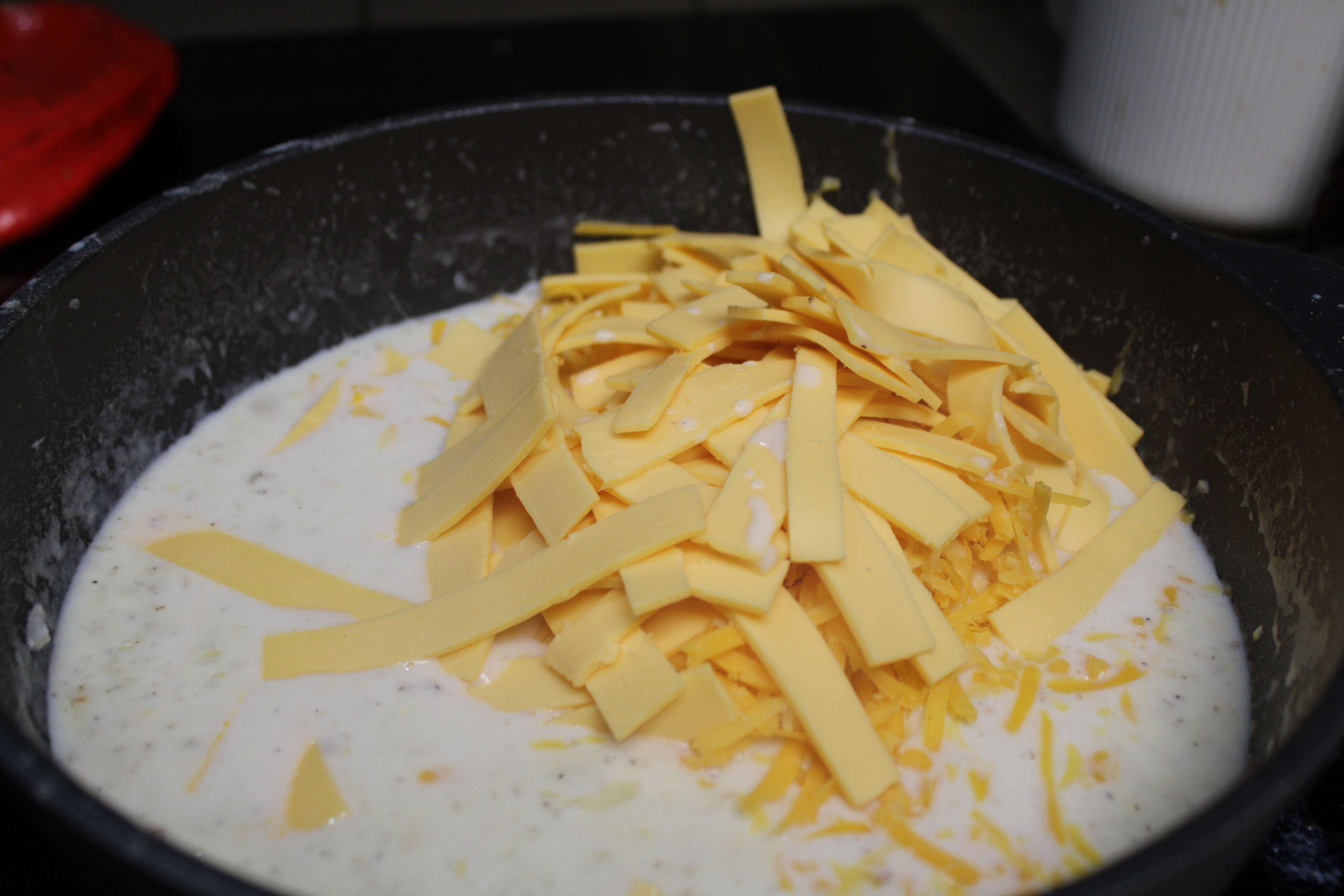 While the water comes to a boil and the pasta cooks, cut a quarter section of an onion. Peel and finely dice, set onion aside. Cut the American Cheese slices into strips. Grate the cheddar cheese. Set the cheeses aside until ready to use.