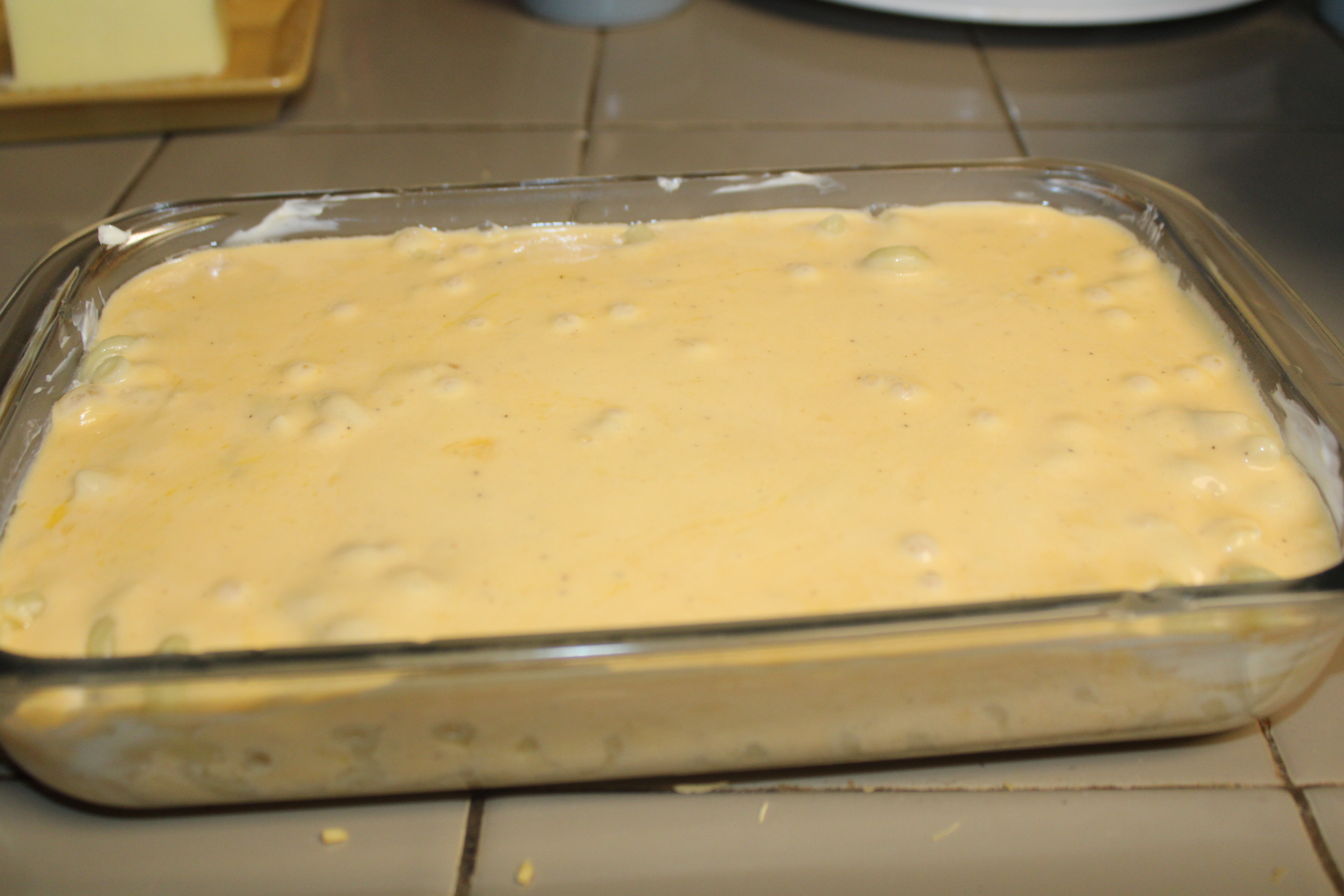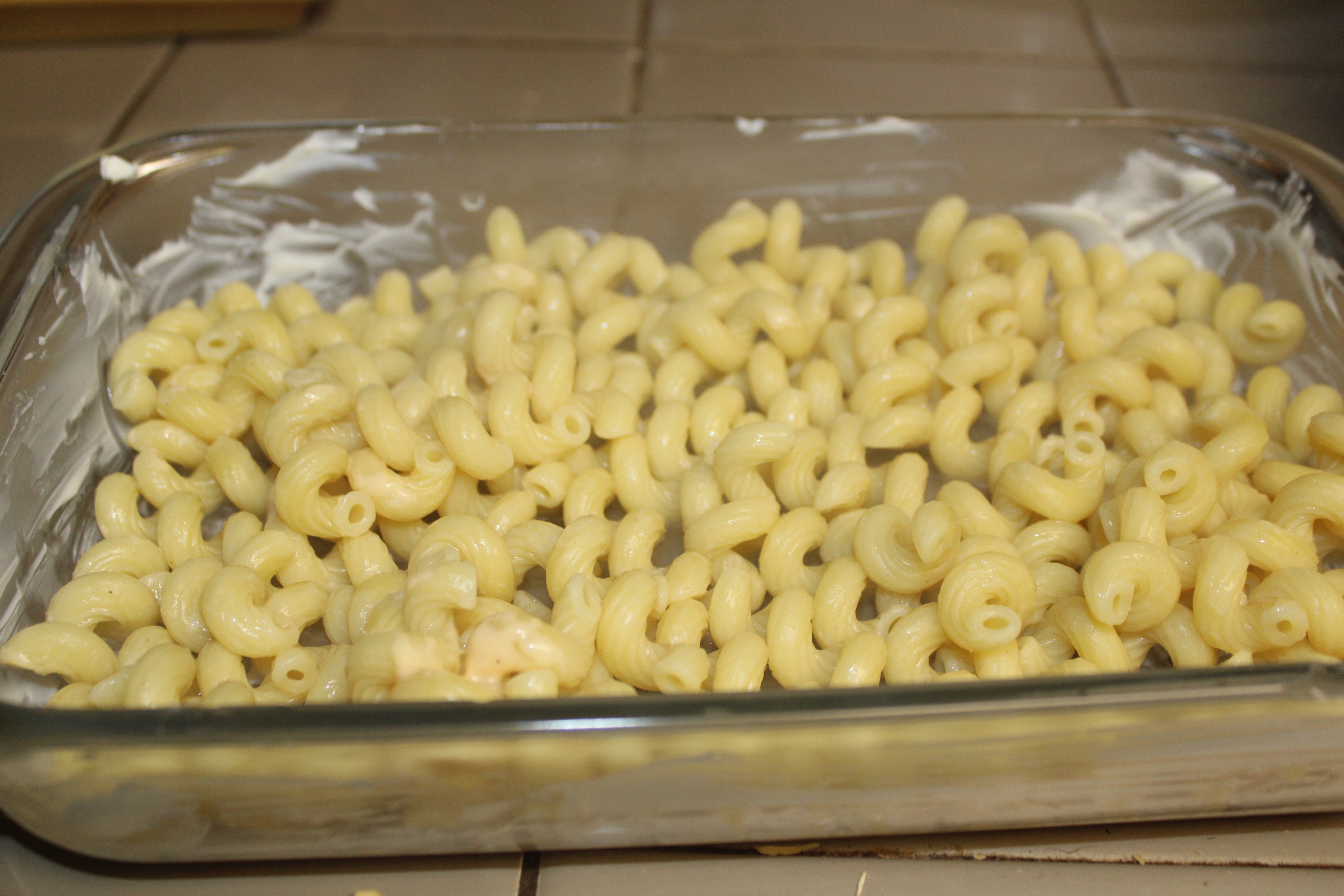 Spread half of the pasta out in the prepared dish. Pour cheese mixture over the pasta, then top with remaining pasta. Stir to combine and coat all the pasta well in the cheese mixture.