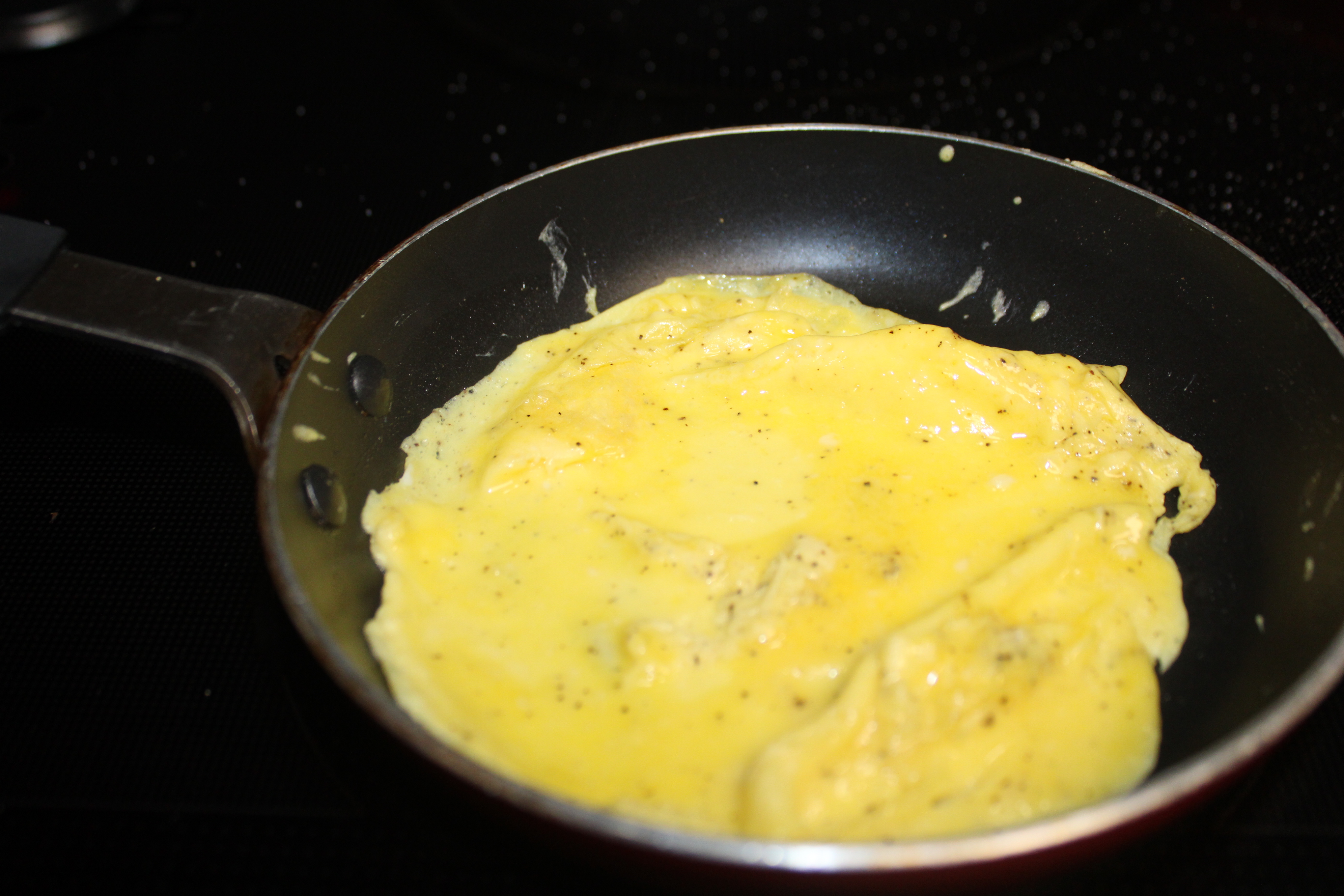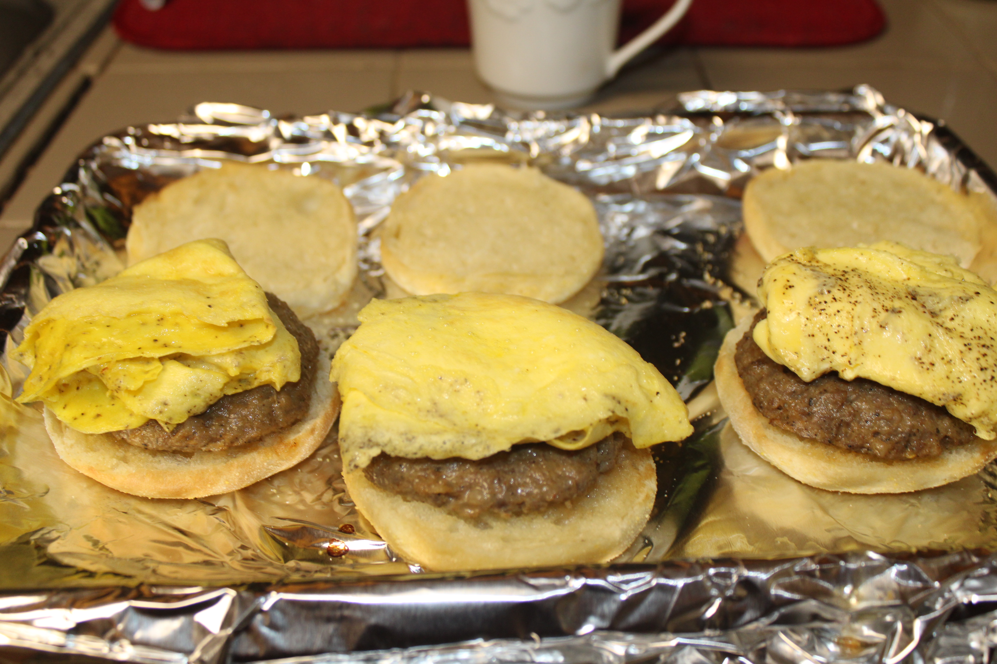 Spray a small skillet with a little cooking spray. Working with one egg at a time, beat the egg well. (A small food processor makes quick work out of beating the egg well) Season with salt and pepper, then pour into the warm skillet. Swirl the skillet to coat the bottom of the pan as though making an omelette. Let the egg cook to set. Once set, fold in half, then half again and gently place the egg on top of one of sausage patties. Repeat until four patties halves have been topped with an egg.