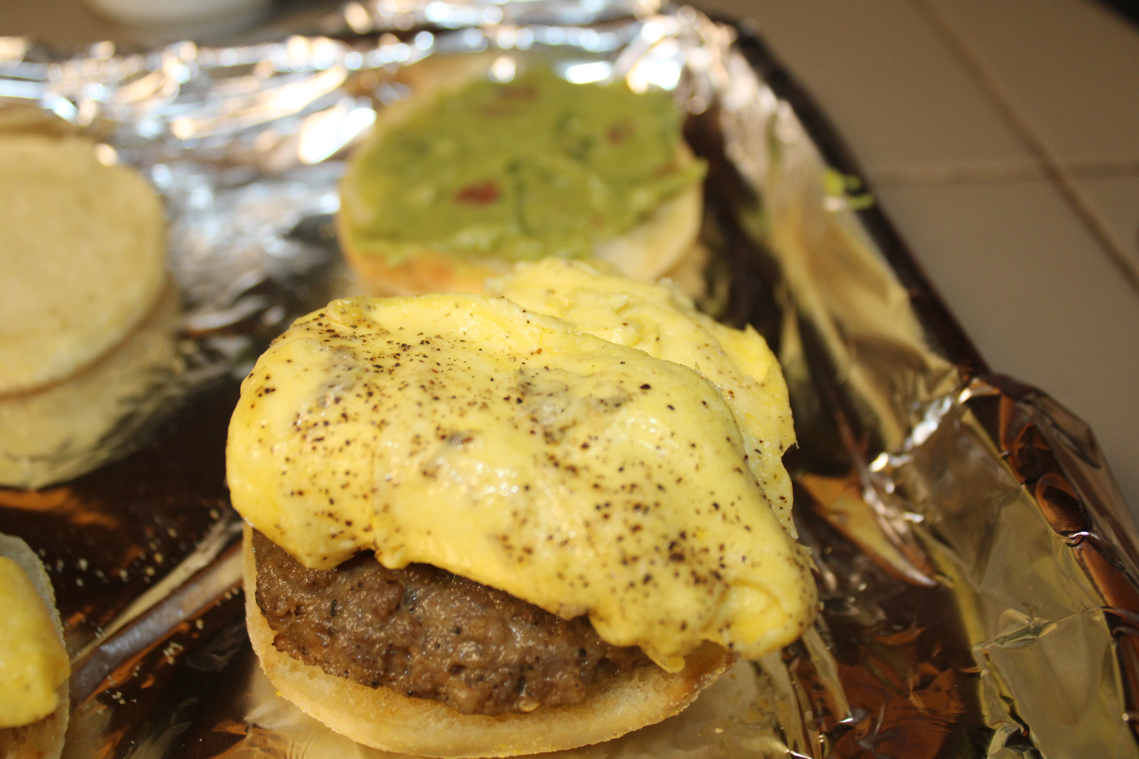 To finish the sandwiches spread a dollop of Guacamole on the remaining muffins as desired. Close the sandwiches, serve and enjoy with a coup of coffee.