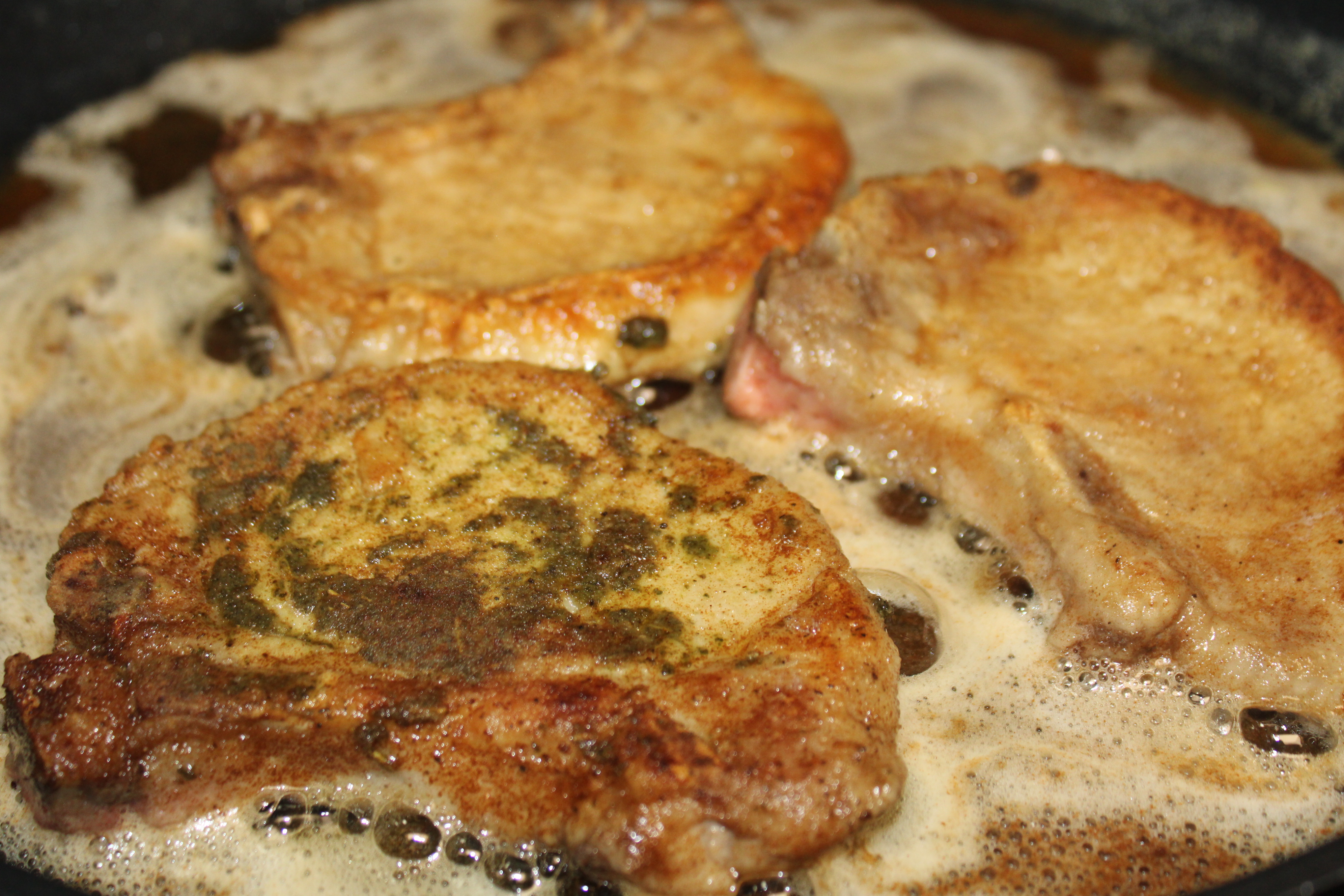 Return the skillet to medium heat and warm the butter. Brown pork chops on both sides, about 2 minutes or so per side. Remove chops from the skillet. Drain off excess oil, leaving about a tablespoon or so behind.