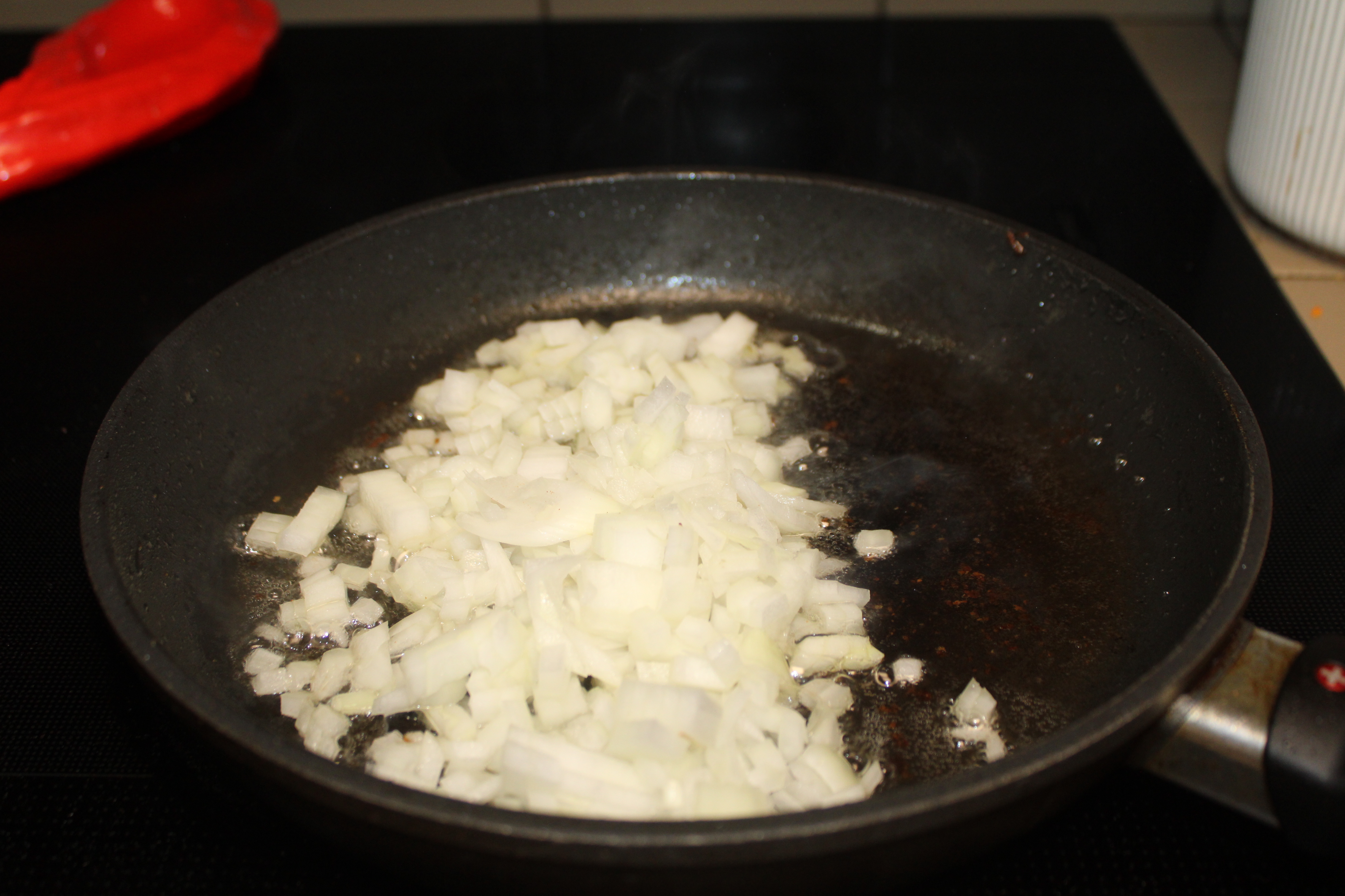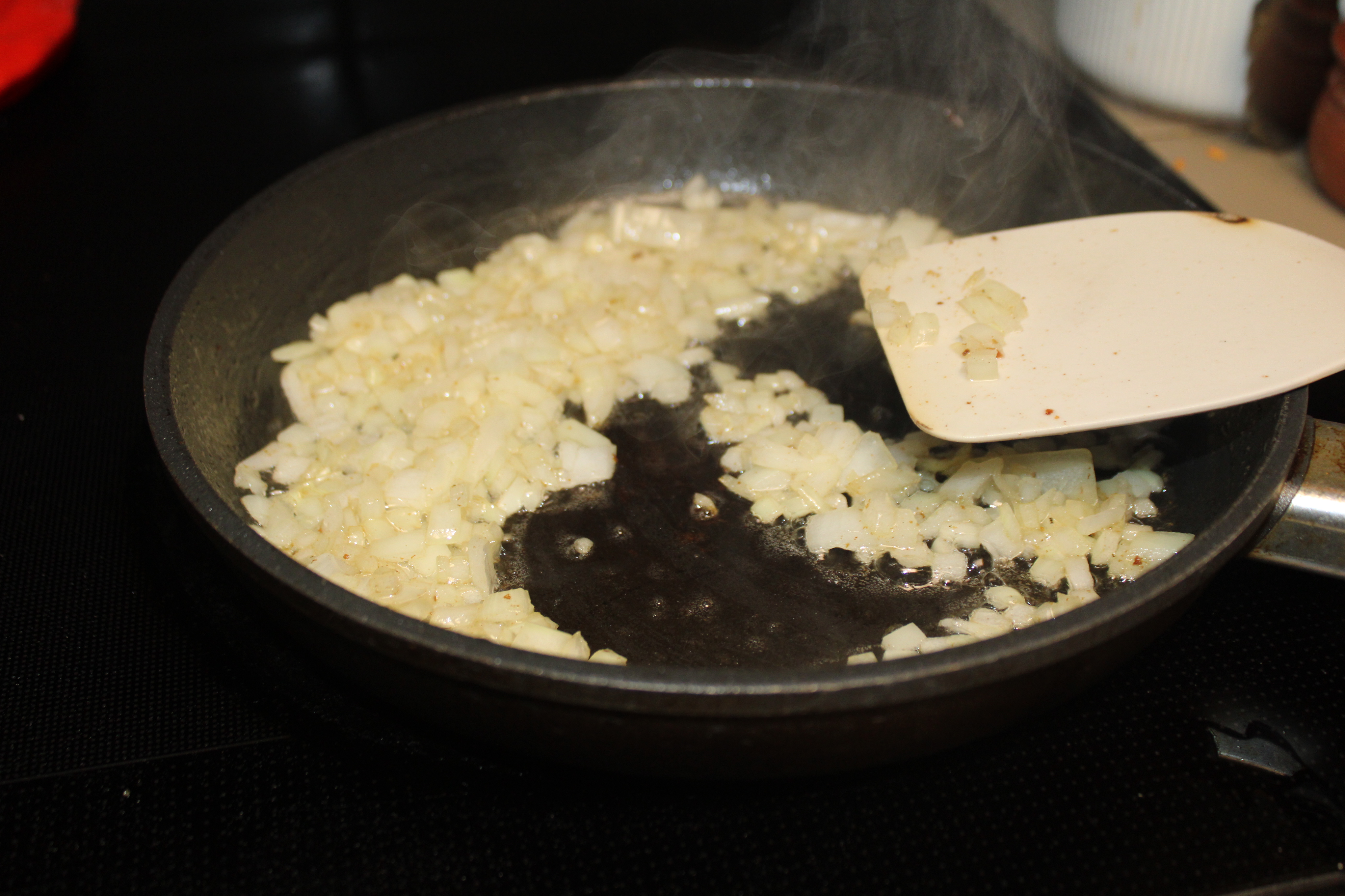 Scatter diced onions in the now empty skillet to brown. Season lightly with mesquite. Scatter onions over the beans, stir to blend.