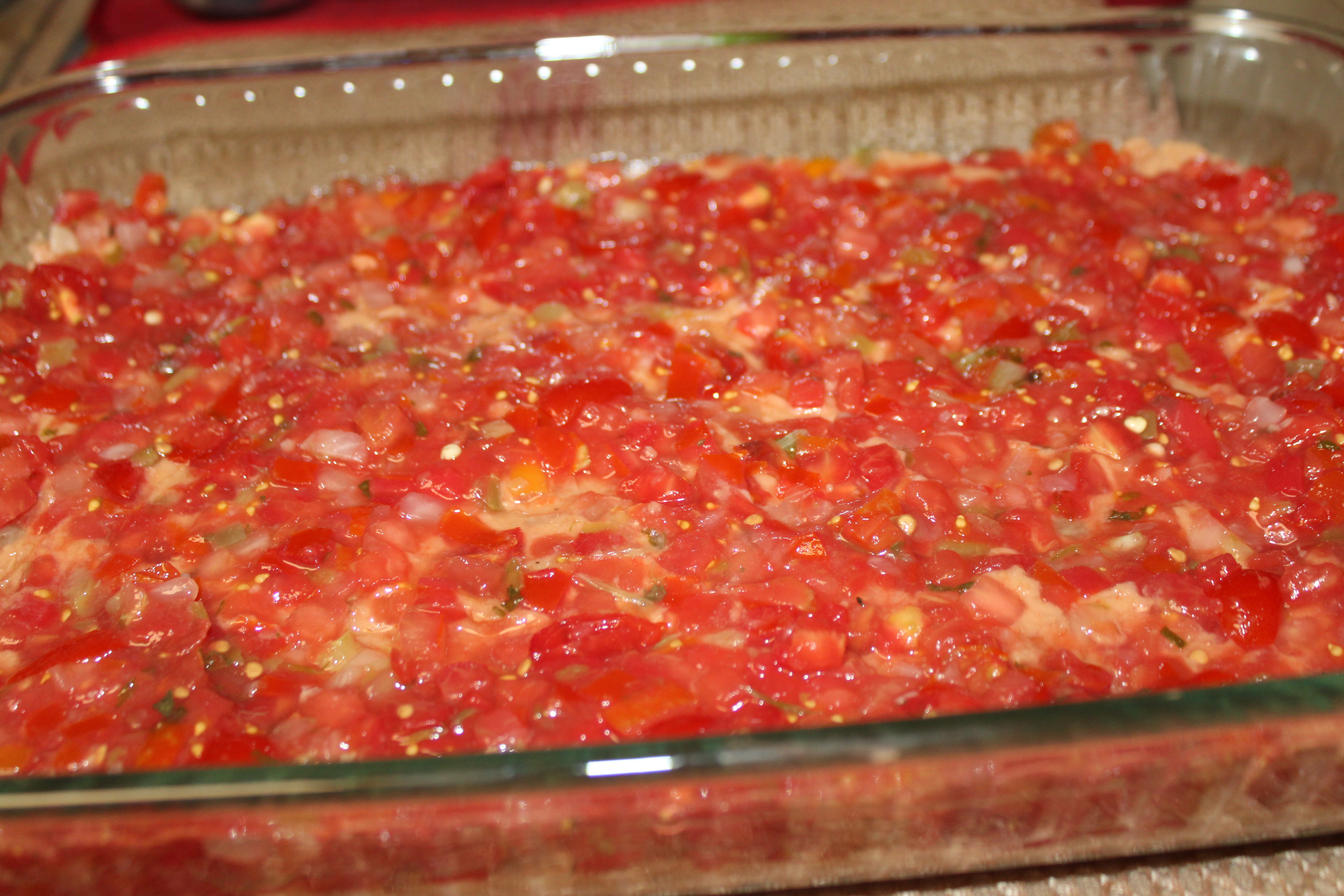 Empty salsa in a colander, drain as much excess liquid as possible leaving the chunky vegetables behind. Dice cherry tomatoes, rinse to remove seeds. Add the tomatoes to the salsa for a thicker blend. Spread salsa over the bean layer.