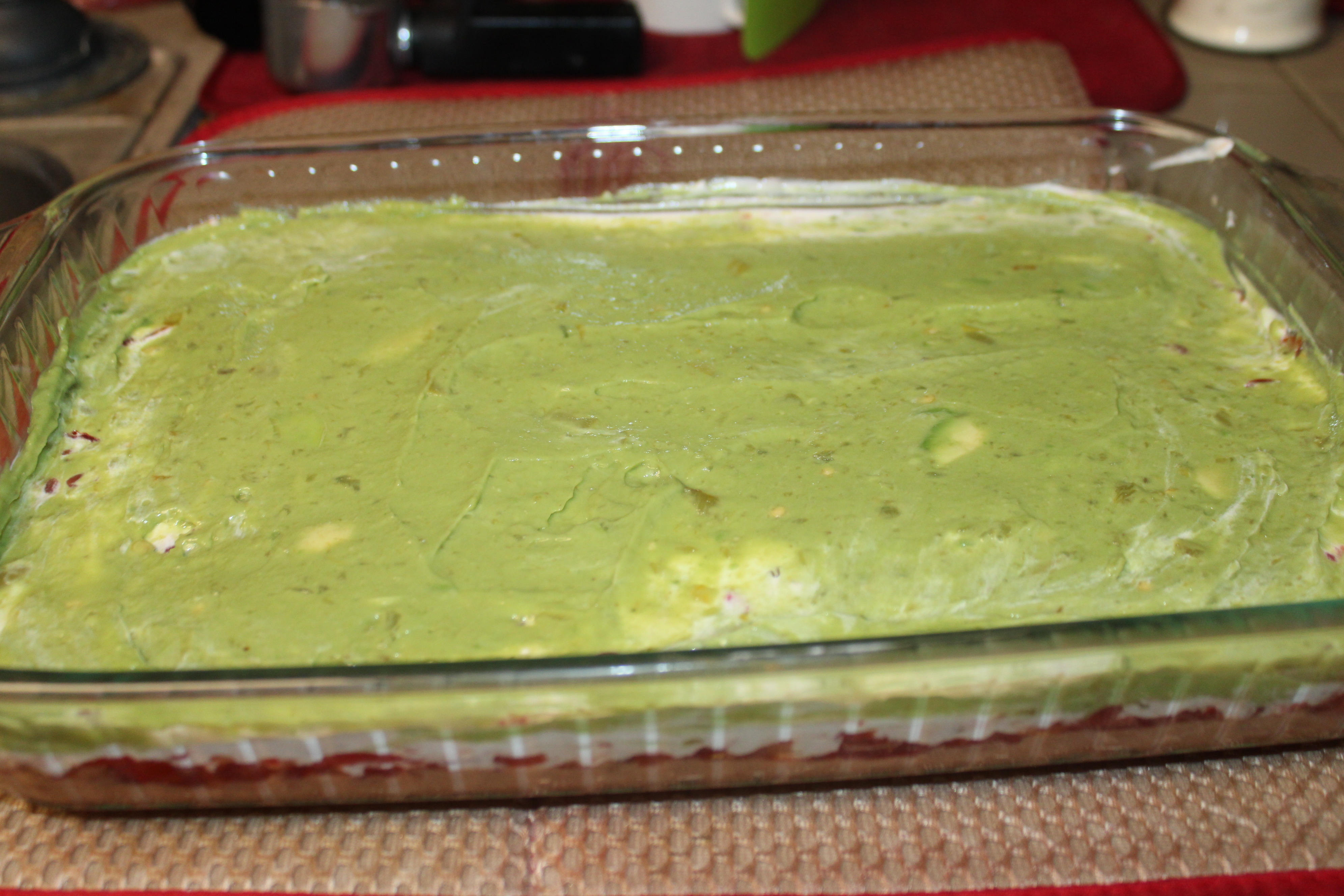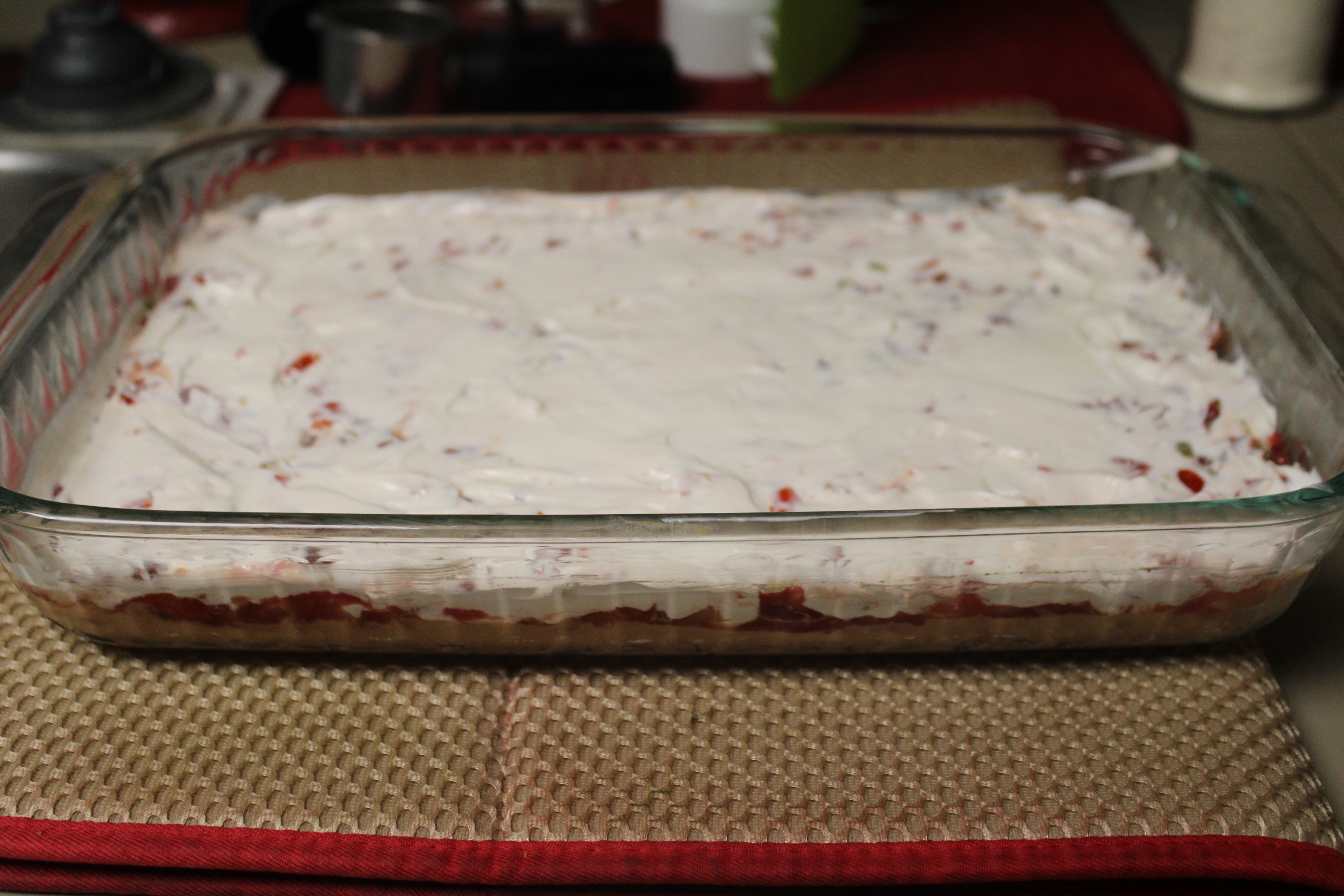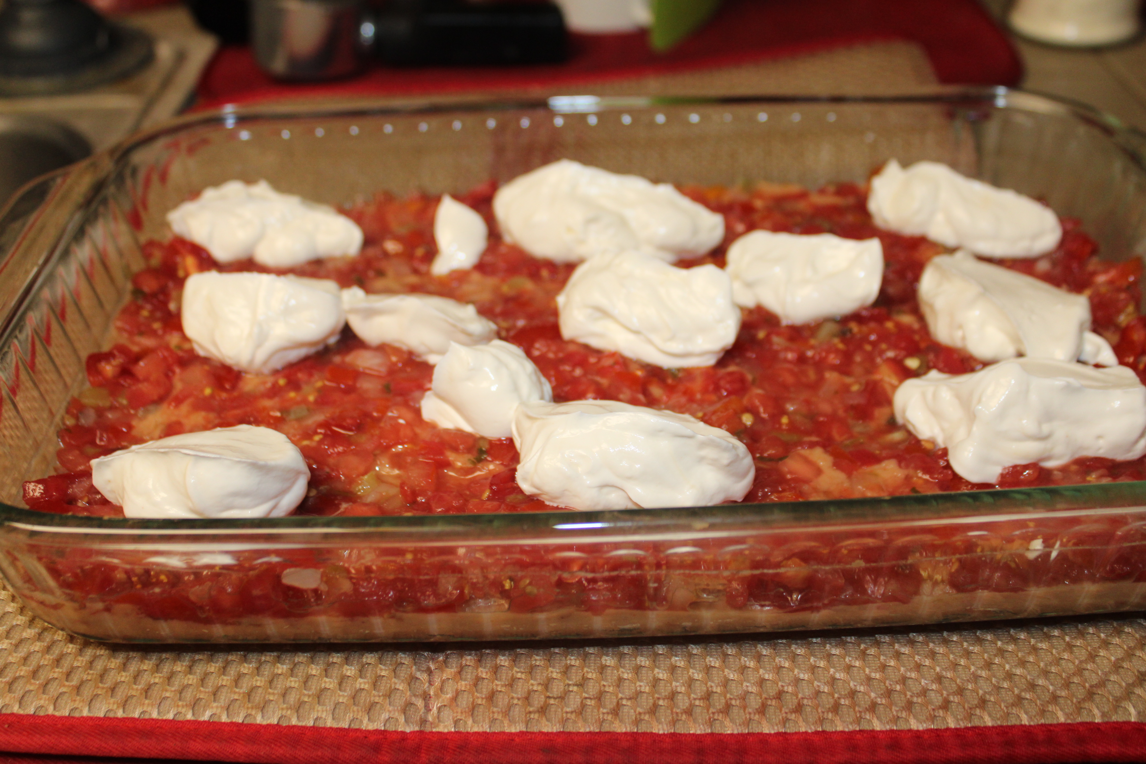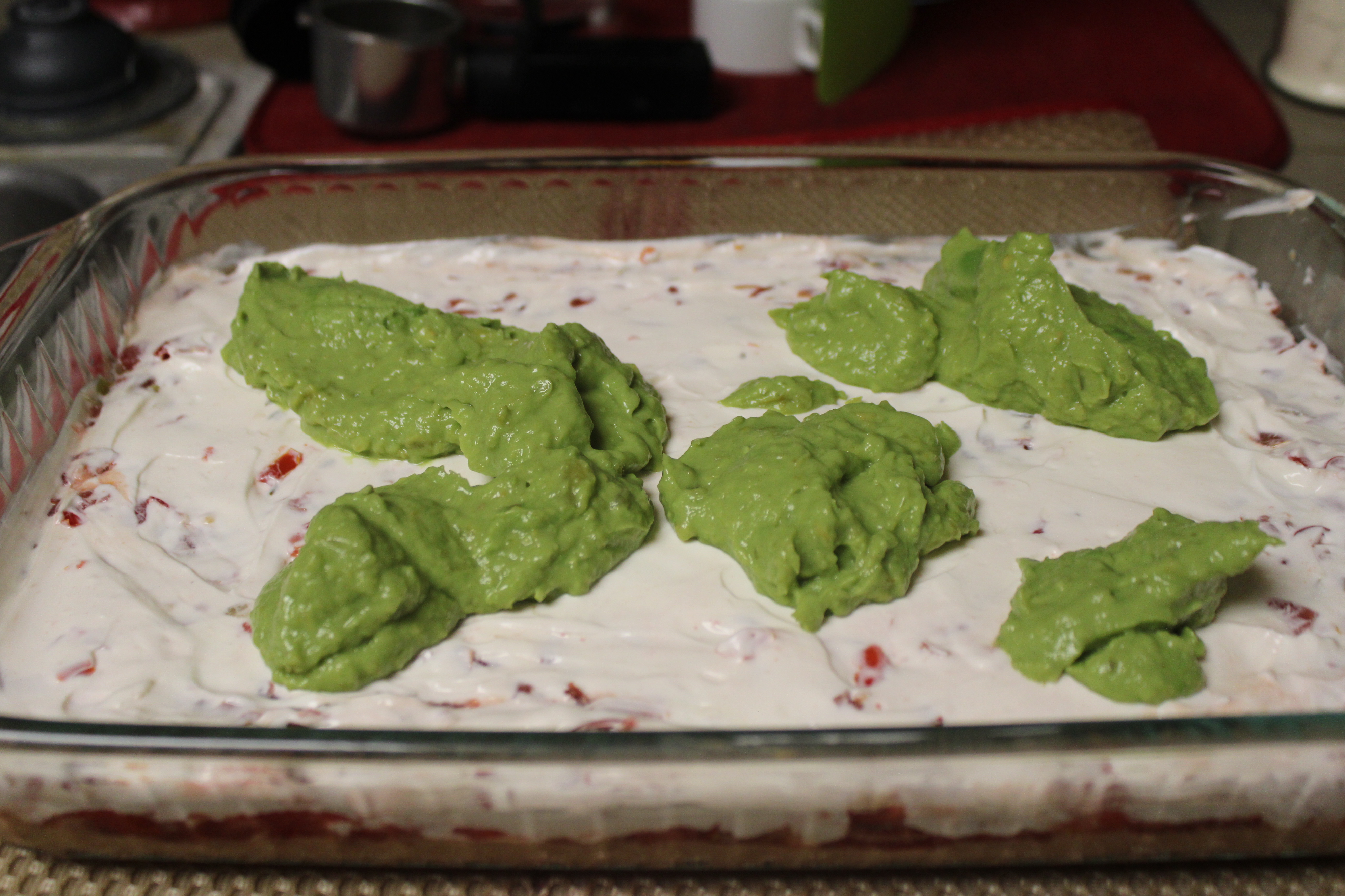 Mix sour cream with Miracle Whip. Drop by the spoonfuls over the salsa layer, then carefully spread out.