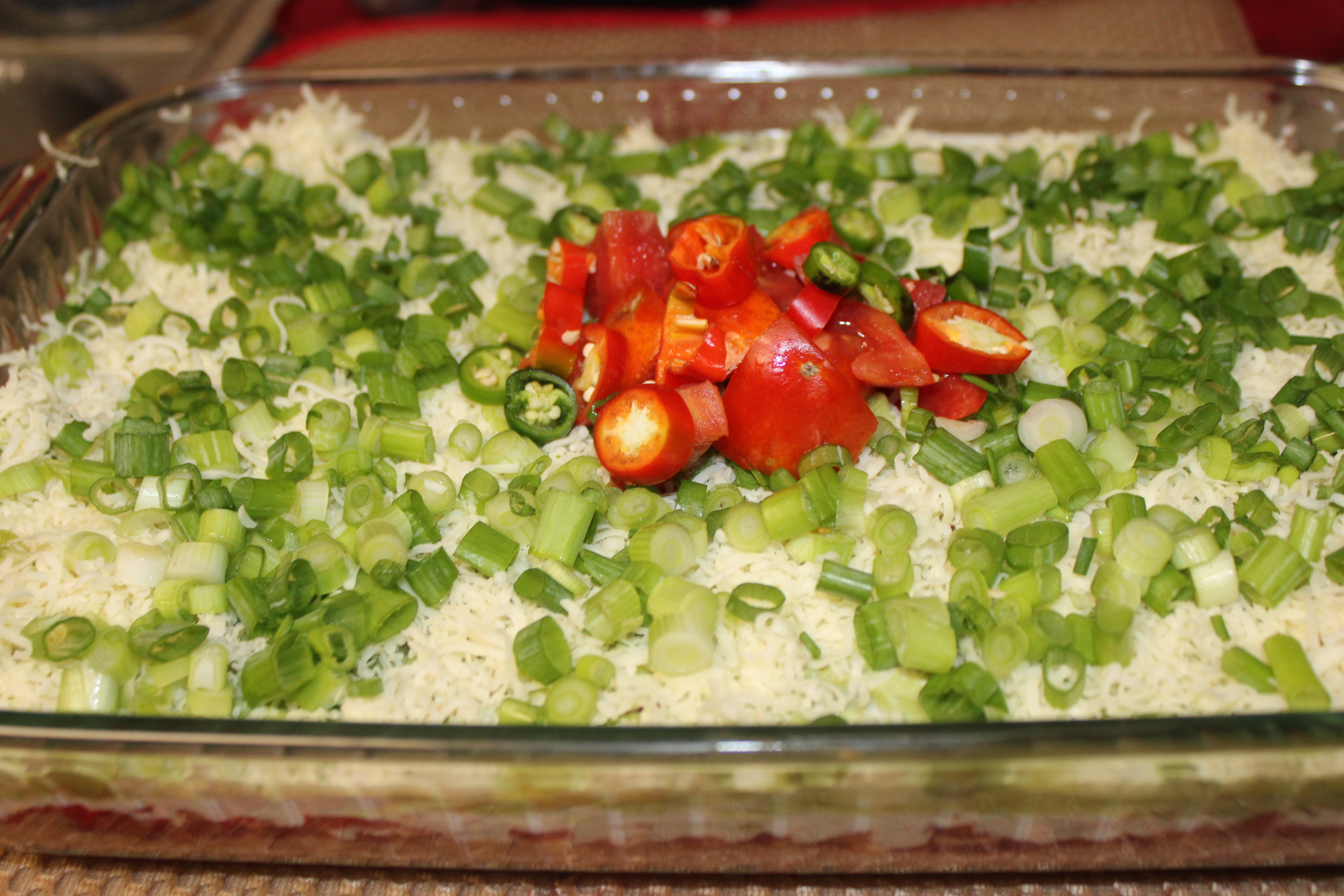 Trim green onions, slice and scatter over the cheese layer.