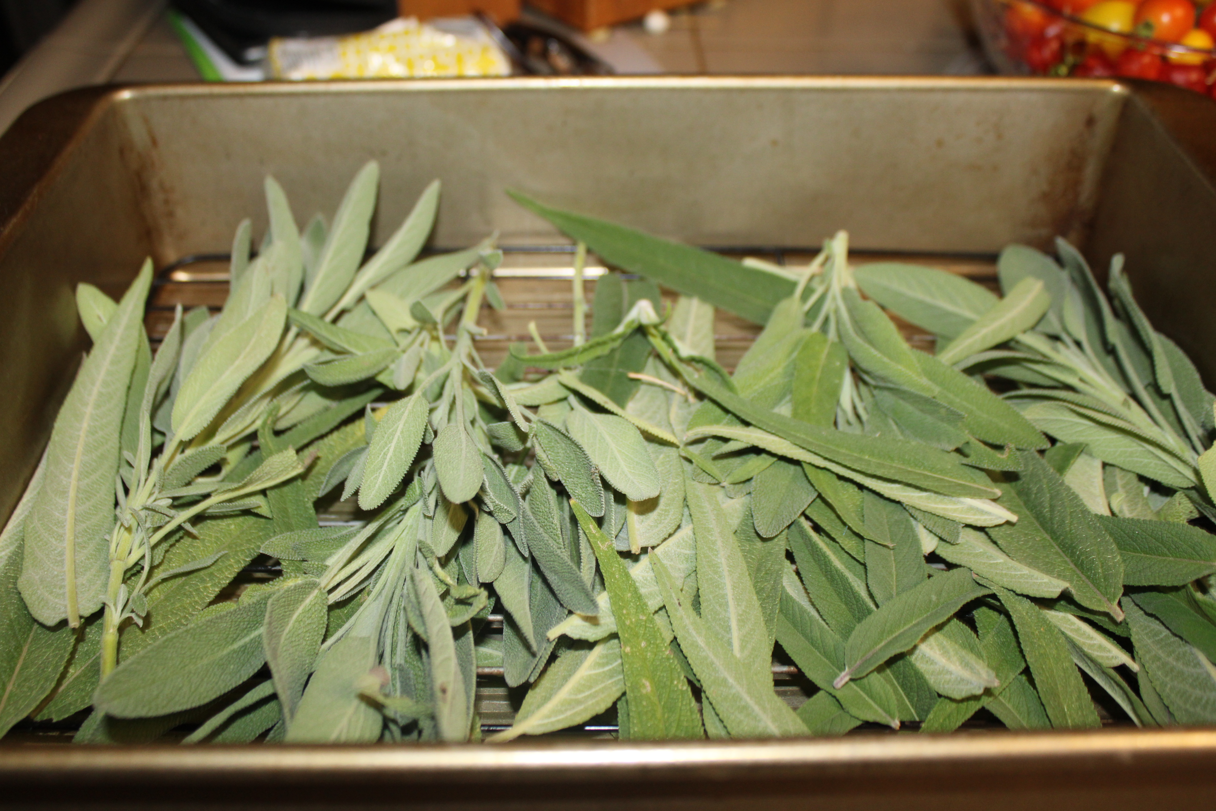 Heat oven to 450-degrees. Line the bottom of a roasting pan with fresh sage leaves, set aside.